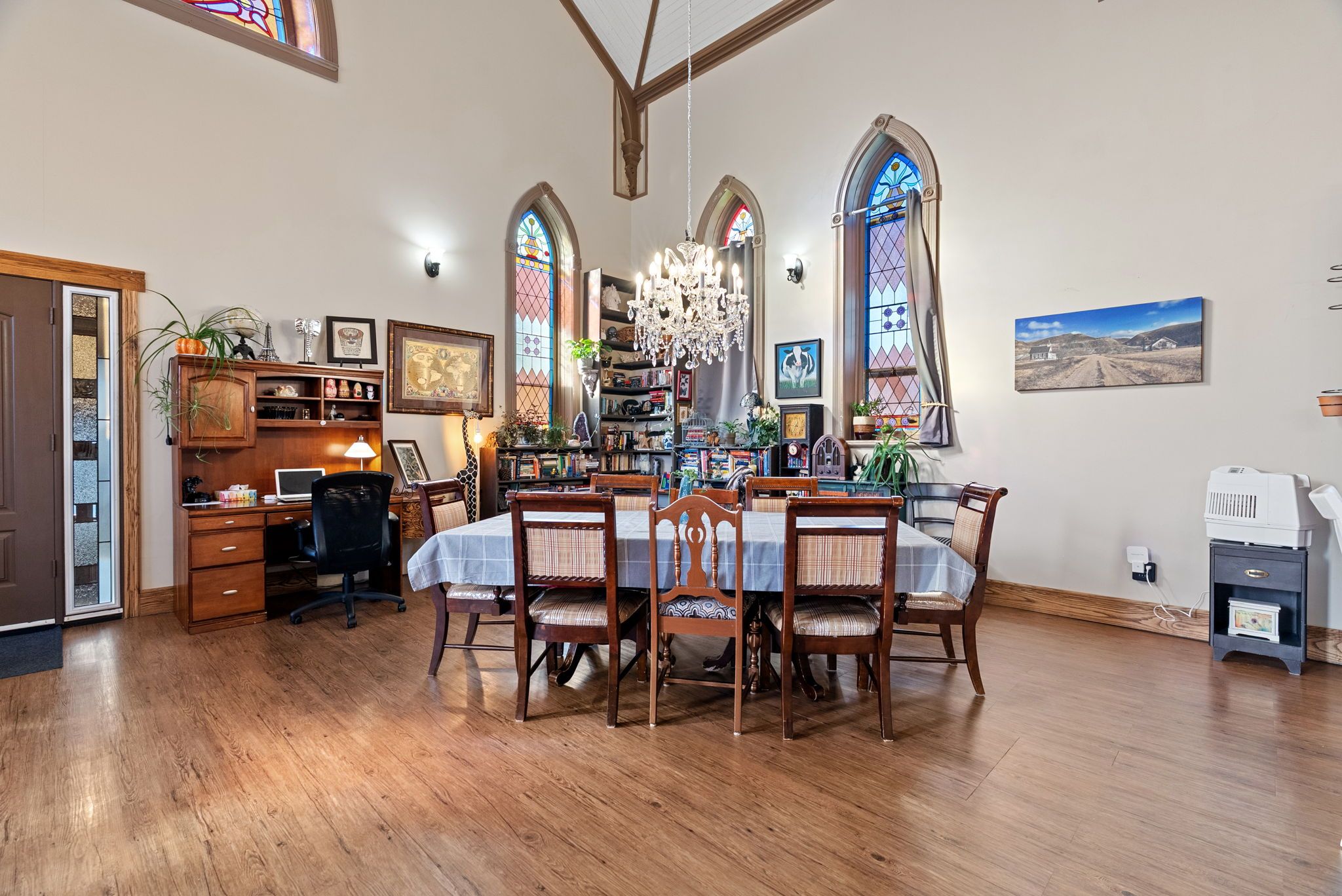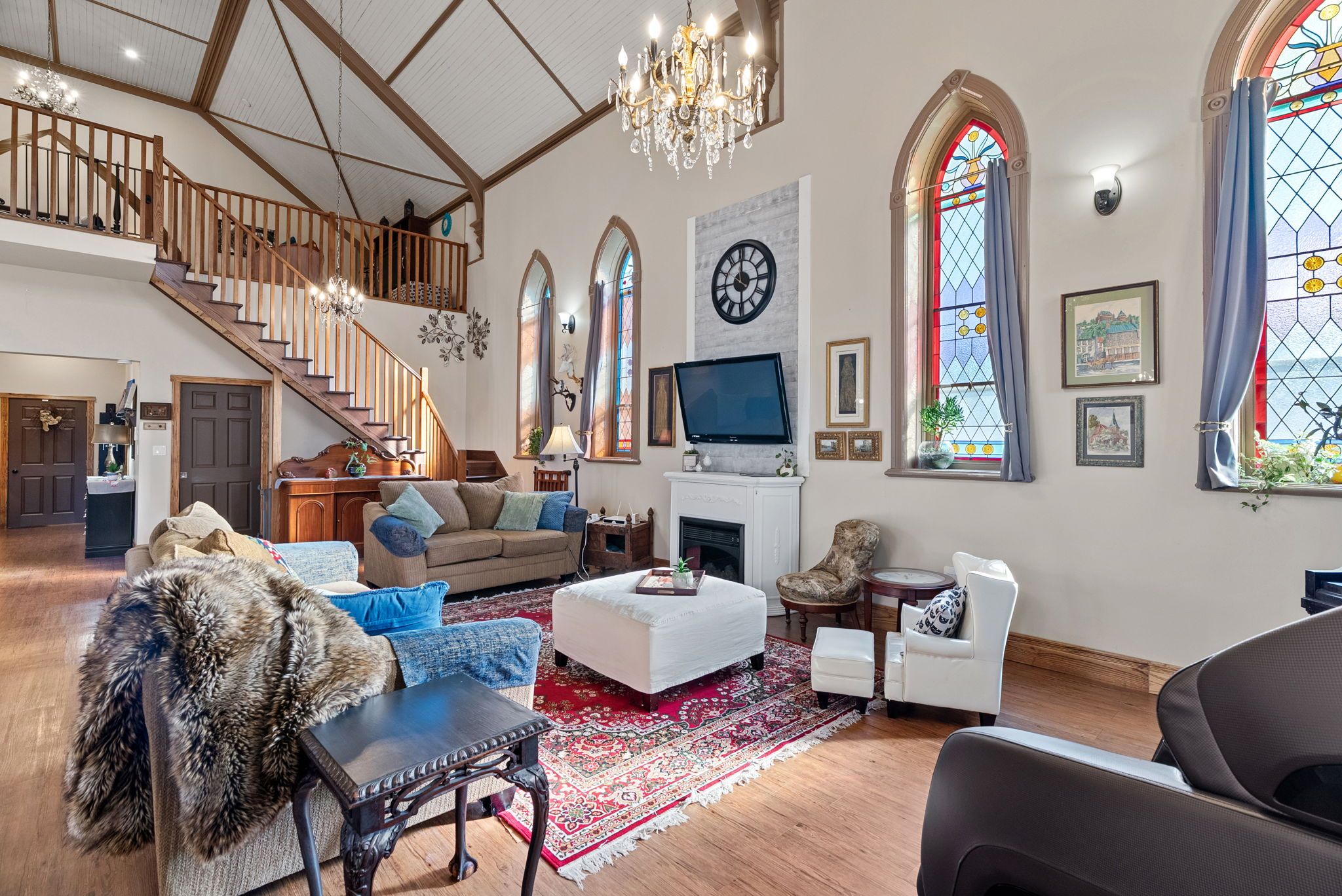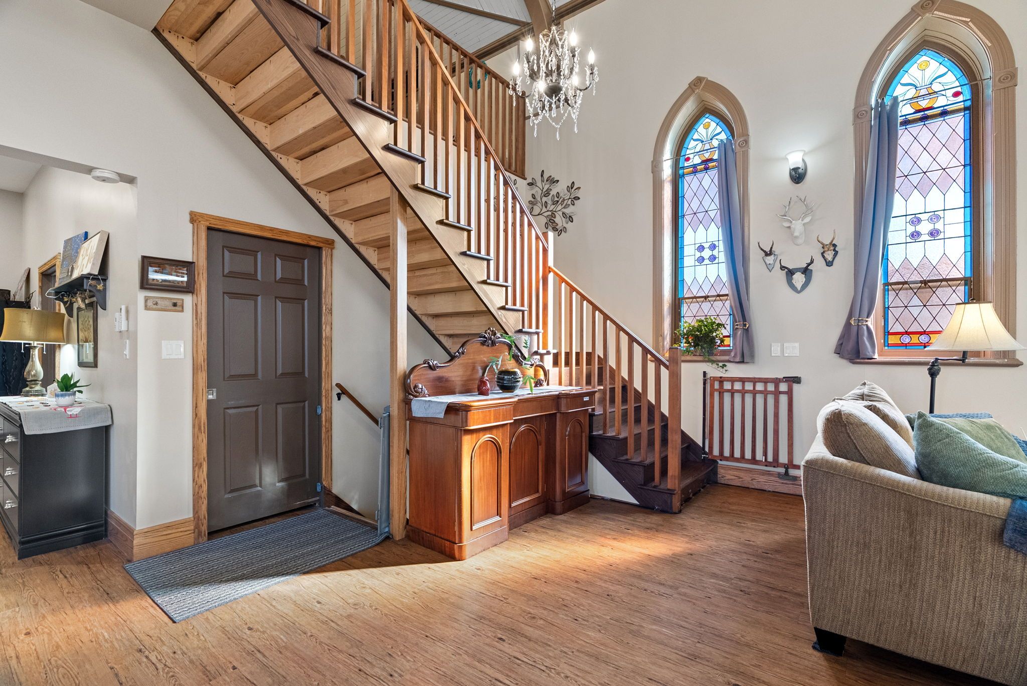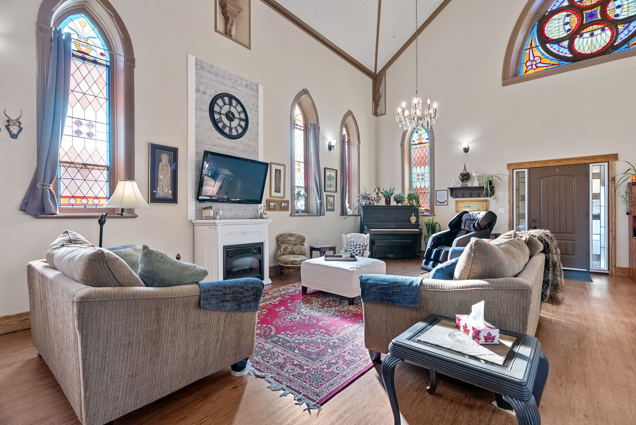 Once a place of worship, now a one of a kind residence, this 1895 brick church has been reimagined into a warm and fully livable home while preserving the character that makes it unforgettable. The moment you enter the great room, the space opens dramatically with soaring ceilings, original stained glass and an open layout designed for gathering. The main floor blends kitchen, dining and living into one impressive space anchored by a large island and framed with historic trim and arches. Also on this level is a bedroom, a 4 piece bath and main floor laundry. Upstairs, the loft style primary bedroom overlooks the main floor and features an ensuite with a double vanity and tiled walk in shower, with space for a generous wardrobe. The basement offers future potential with high ceilings, new windows, drywall started, rough ins for an additional bathroom and bedrooms and a separate entry from the front foyer which is ideal for multi use or future rental potential. Outside, the fenced yard is landscaped and offers a firepit area, storage shed with lean to and parking. The home sits in the hamlet of whitechurch, minutes to lucknow and wingham for amenities and about 20 minutes to the beaches of lake huron. The property has also been operated as an airbnb and has been a well loved stop for travellers and quiet getaways. The seller is open to selling it fully furnished, allowing a new owner to step into a turnkey residence or continue the airbnb use immediately. For someone looking for more than a house, something with history, and long term potential, this converted church is a rare offering.