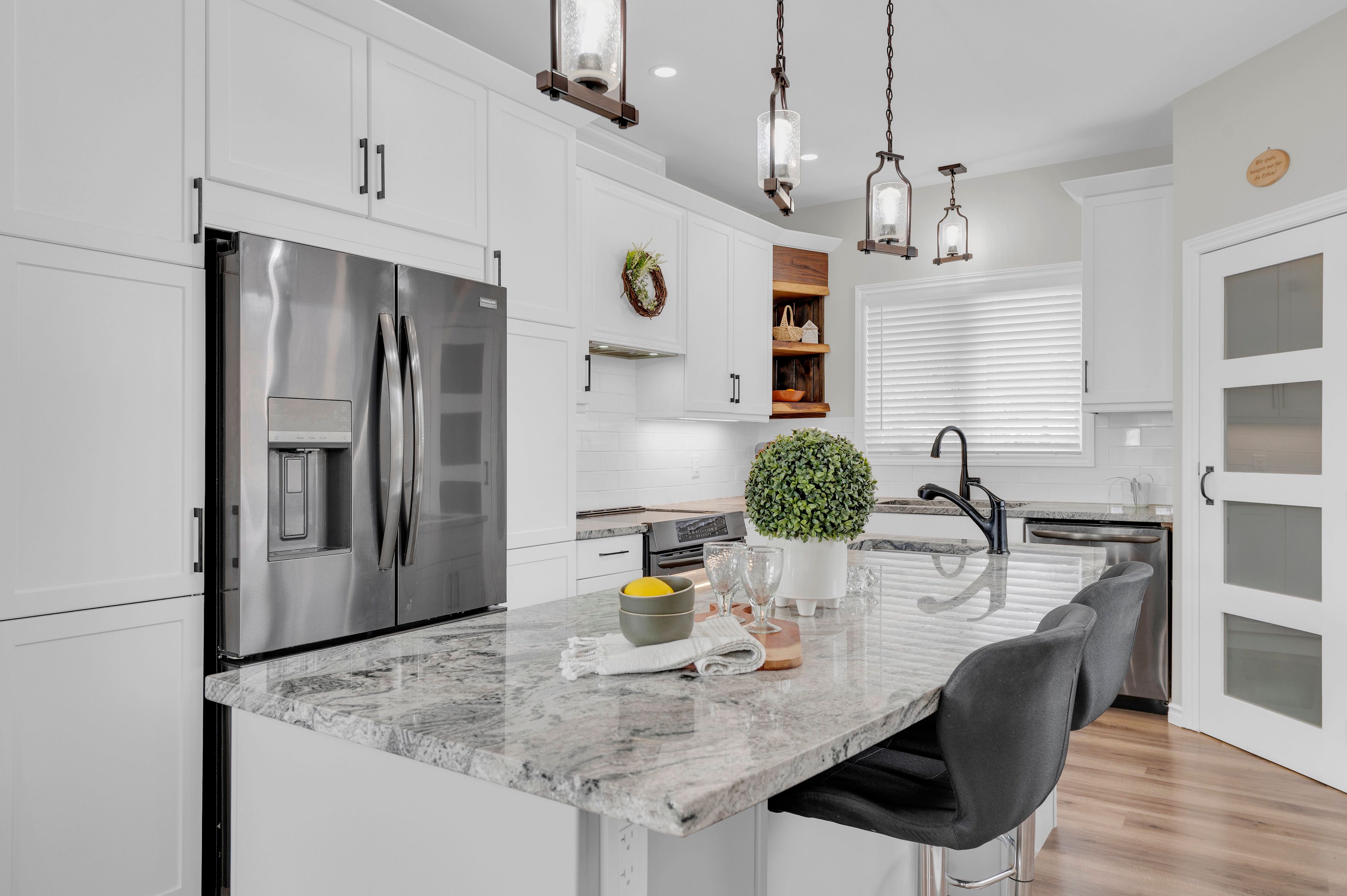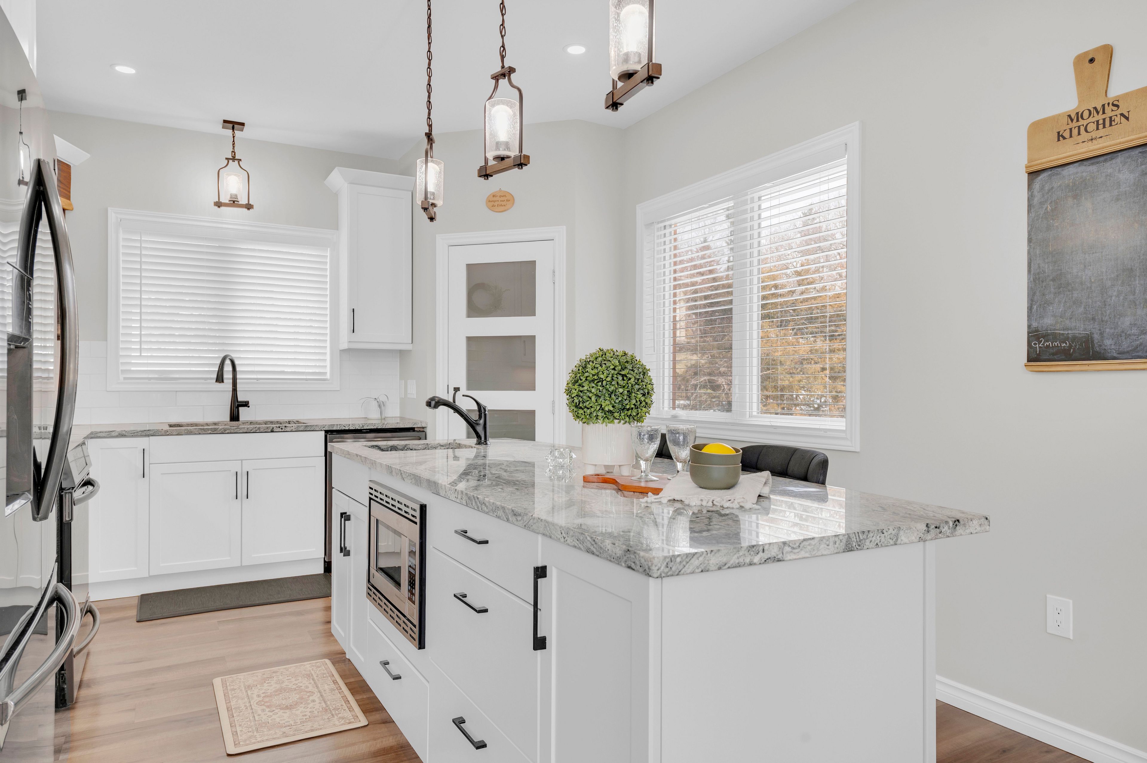 • Stylish kitchen with granite countertops, large island, and walk-in pantry.