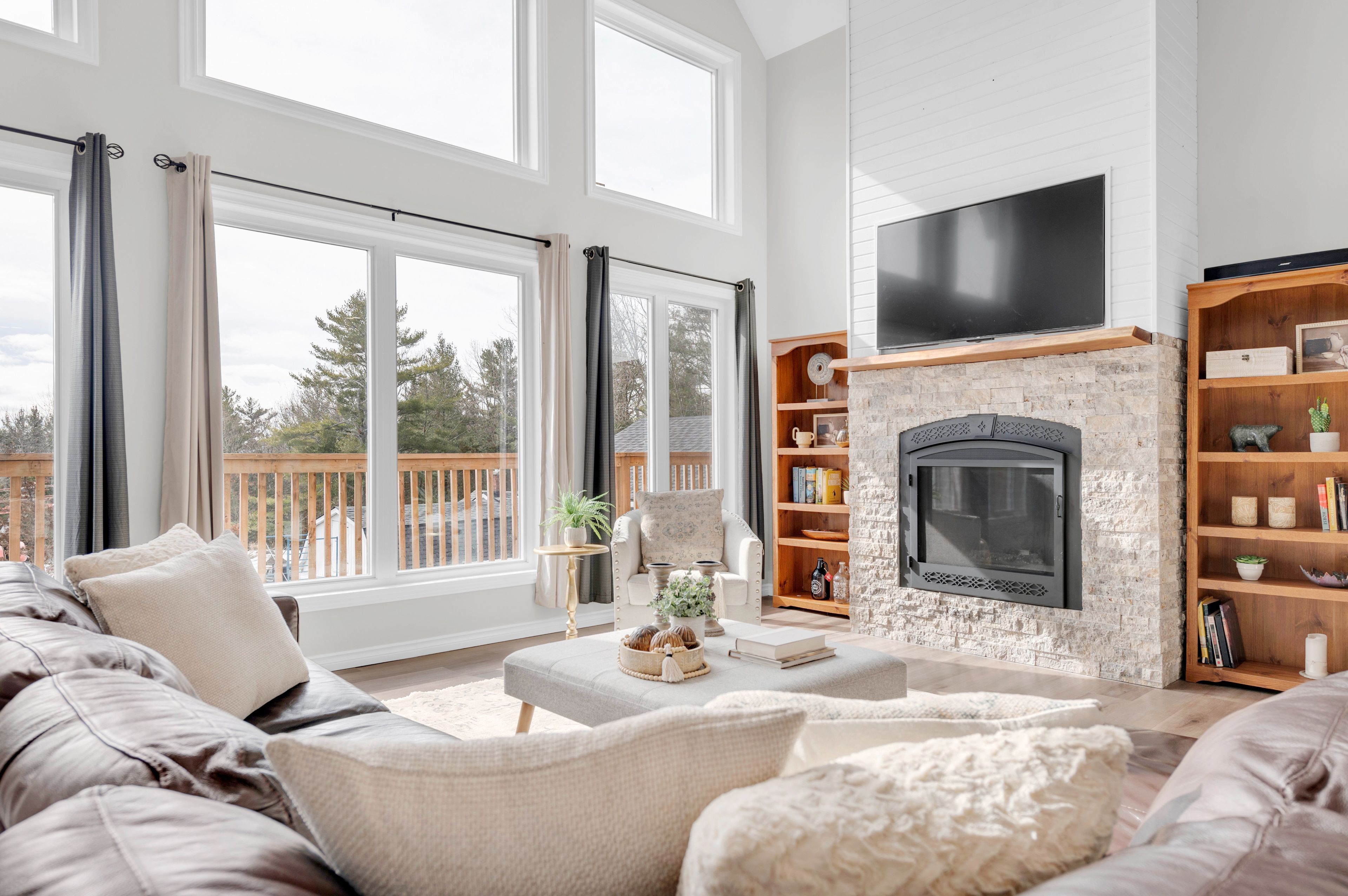 • Bright living room with floor-to-ceiling windows and fireplace for cozy gatherings.