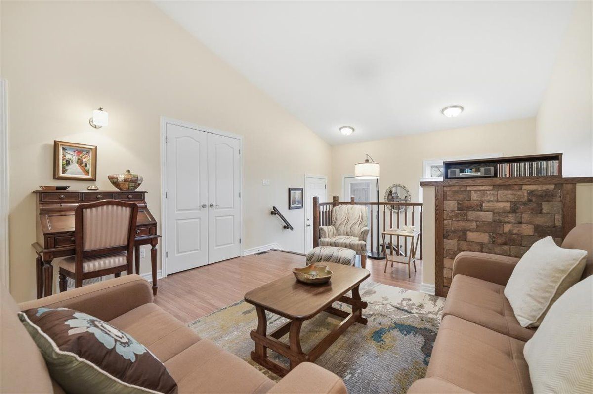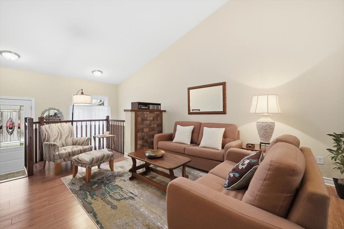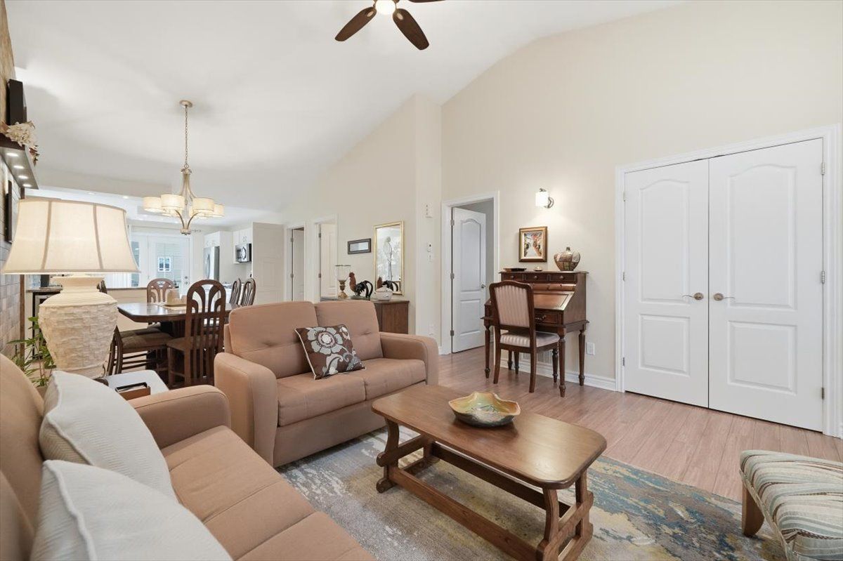 • Spacious living area with cathedral ceilings enhances the open-concept design.