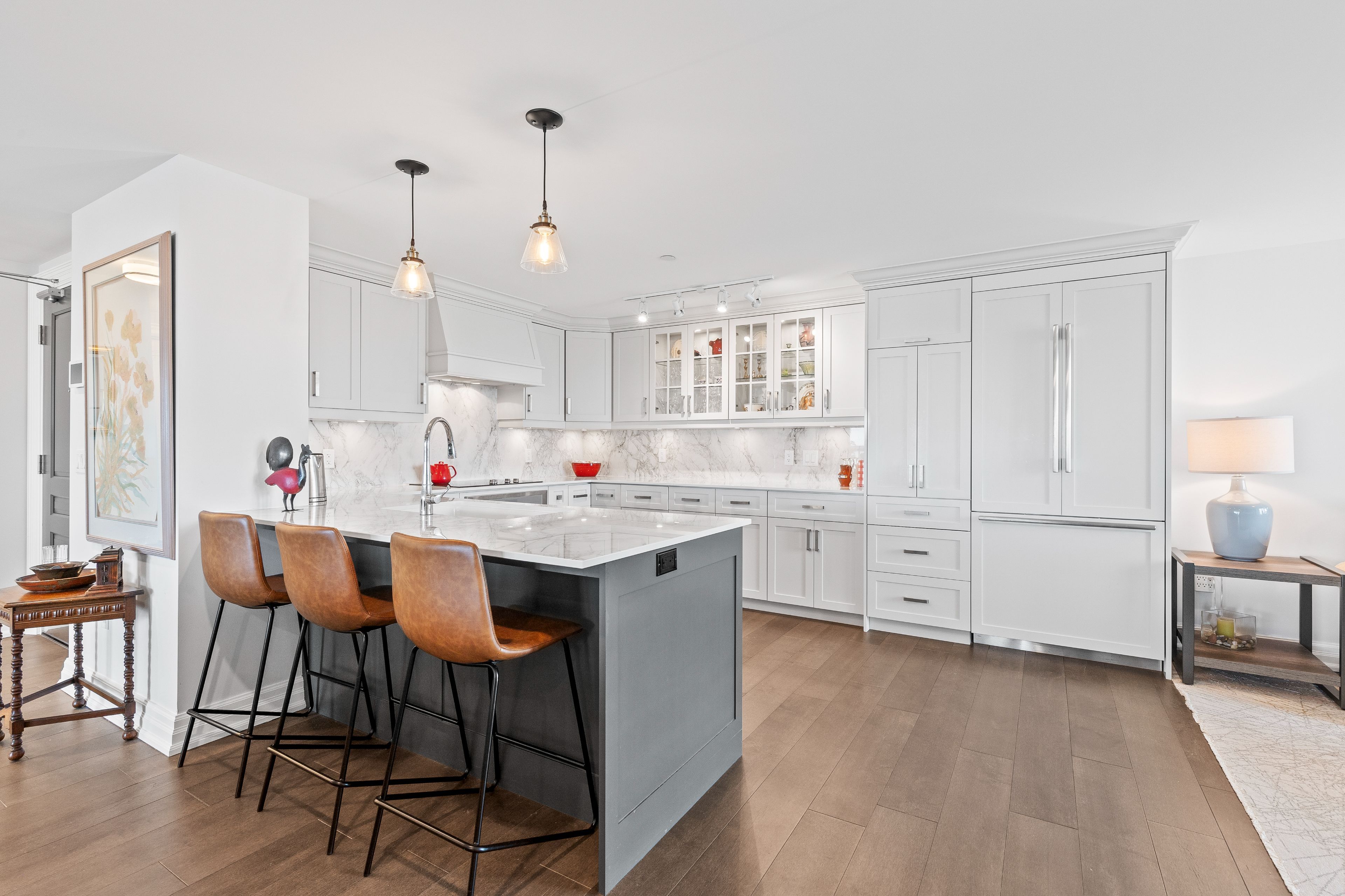 Enjoy luxury living at bridgewater private residences on the lake in downtown burlington. This 1571 square foot, 2 bedroom plus den corner suite has two private balconies, one with a gas line for a barbecue. The spacious living room and dining room feature a custom coffered ceiling and floor to ceiling windows overlooking sweeping views of lake ontario and the burlington-toronto skyline. The kitchen is equipped with thermidor appliances, a large island and upgraded cabinetry, countertops and backsplash. The master bedroom offers a walk-in-closet and a spacious bathroom with heated floors. The comfortable den, the second bedroom and bathroom, a spacious utility cupboard, and in suite laundry facility complete the unit. Also included are 2 parking spaces and a storage locker. Residents enjoy many amenities including a large 8th floor terrace with barbecues, two fitness centres, an indoor pool and spa, bike storage, valet visitor parking, a large party room with billiards and a piano, monthly social events, and direct access to the pearle hotel, isabelle restaurant, and pearle café. Bridgewater private residences offers downtown living on the lake, combined with convenient access to highways and burlington go facilities, the perfect blend of elegance and convenience.