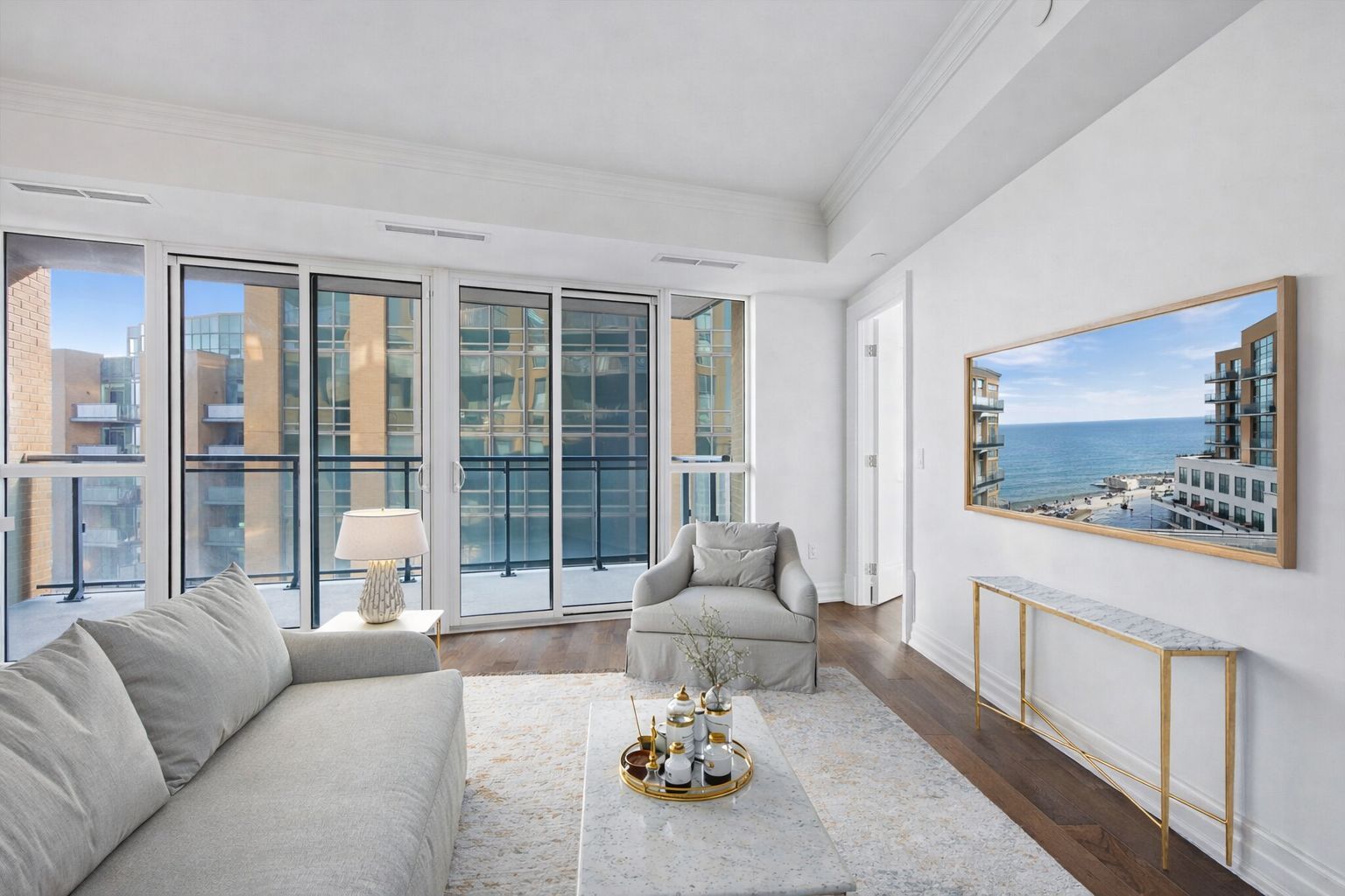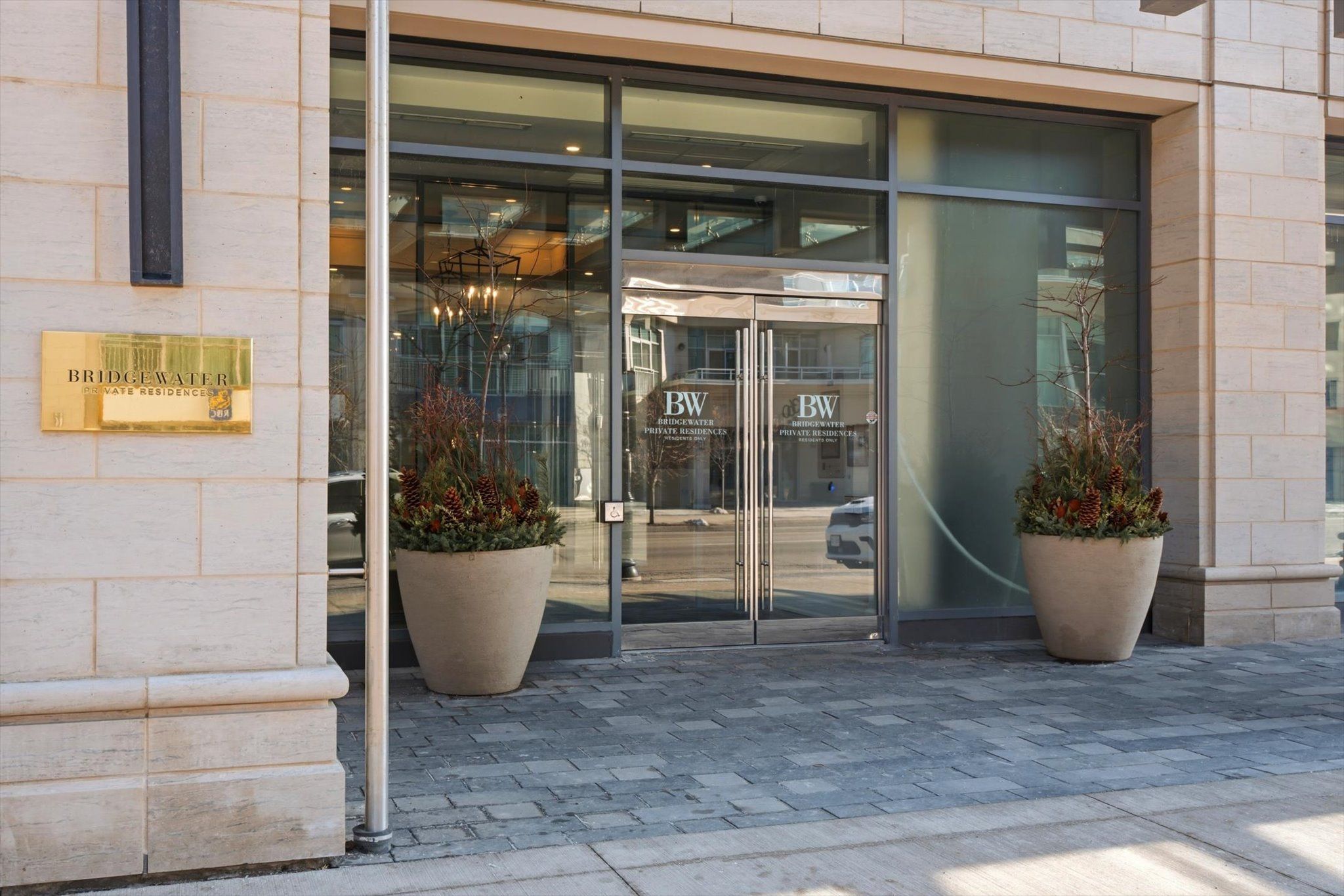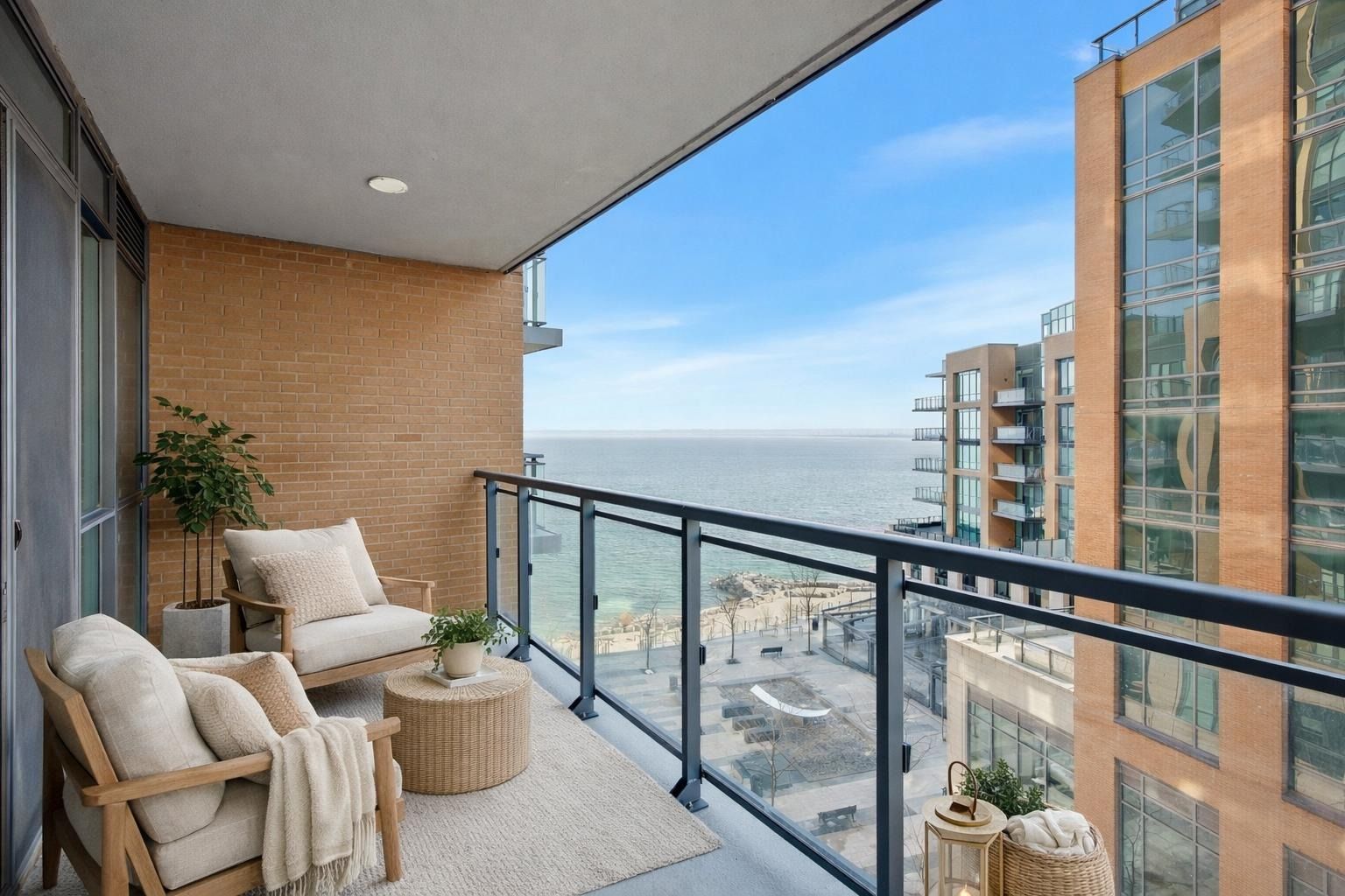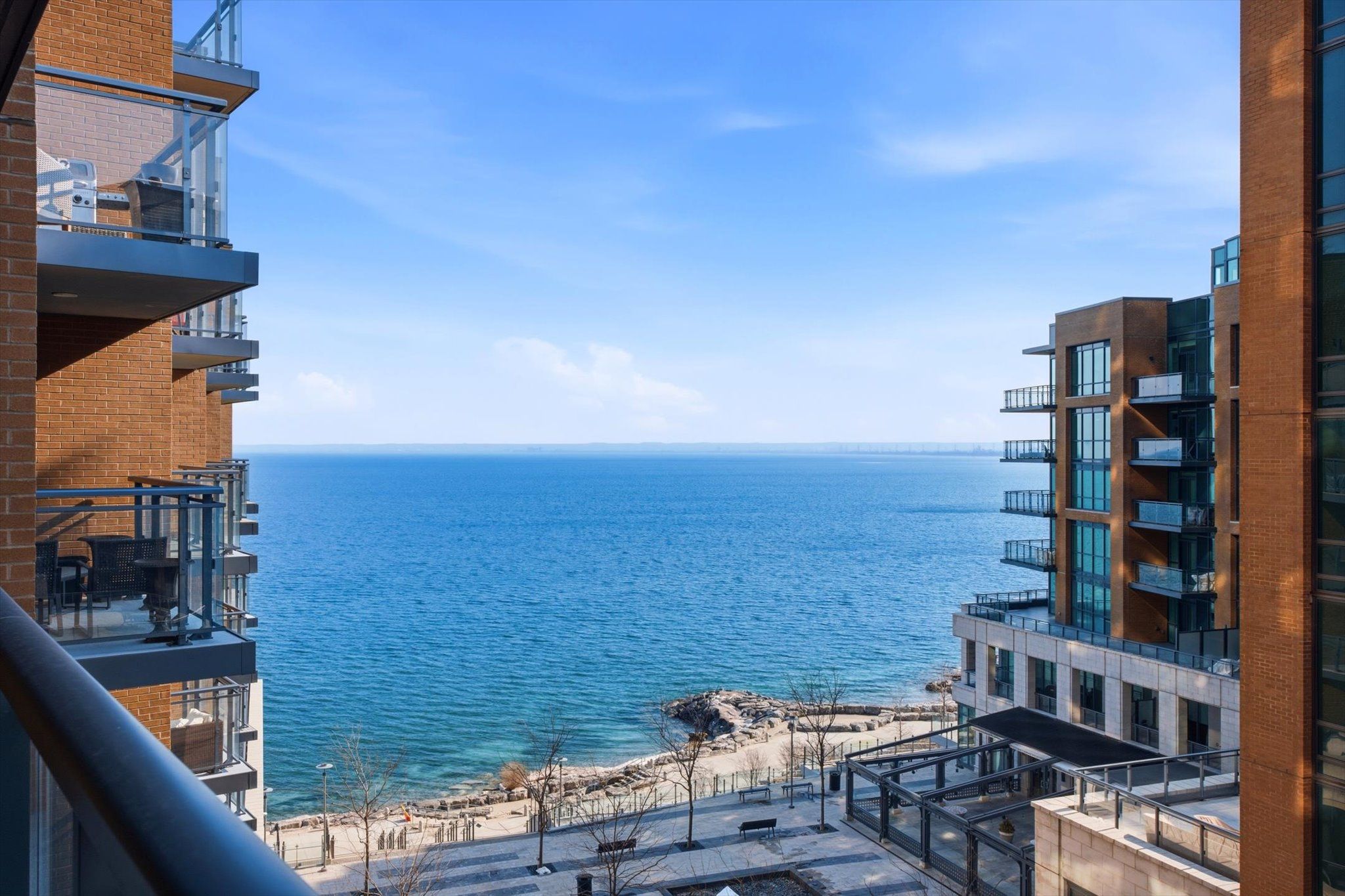 Rarely offered northwest corner suite at bridgewater residences on the lake, burlington's premier waterfront address, directly connected to the pearle hotel & spa, a marriott autograph collection property. Designed by renowned interior designer brian gluckstein, this exceptional 2 bedroom, 2 bathroom residence offers refined lakeside living with timeless elegance and contemporary style. Featuring high ceilings, floor to ceiling windows, and warm afternoon sunlight, this rare corner suite captures two stunning vantage points. Enjoy sparkling southwest views across burlington's waterfront and lake ontario, while the northwest exposure overlooks lakeshore road and the vibrant downtown core. The suite also captures charming courtyard views and the lively atmosphere of the patio at isabelle restaurant, adding a unique urban energy to the serene lakefront setting. Luxury finishes include engineered hardwood flooring, natural stone and porcelain tile, quartz countertops, tray ceilings, crown moulding, pot lights, kohler fixtures, custom closet built ins, and custom barzotti cabinetry with valence lighting. The open concept living and dining area flows seamlessly into a gourmet kitchen featuring built in thermador appliances and elegant quartz surfaces. The primary ensuite bathroom features heated floors for added comfort. A private balcony with natural gas bbq hookup extends the living space outdoors. Additional conveniences include in suite laundry, one underground parking space, and a storage locker. Residents enjoy exceptional amenities including a rooftop terrace with bbqs and panoramic lake views, fitness centre, social lounge, and indoor pool, along with access to select facilities at the pearle hotel & spa and direct indoor access to pearle café. Steps to spencer smith park, the waterfront trail, boutique shopping, restaurants, and vibrant downtown burlington.