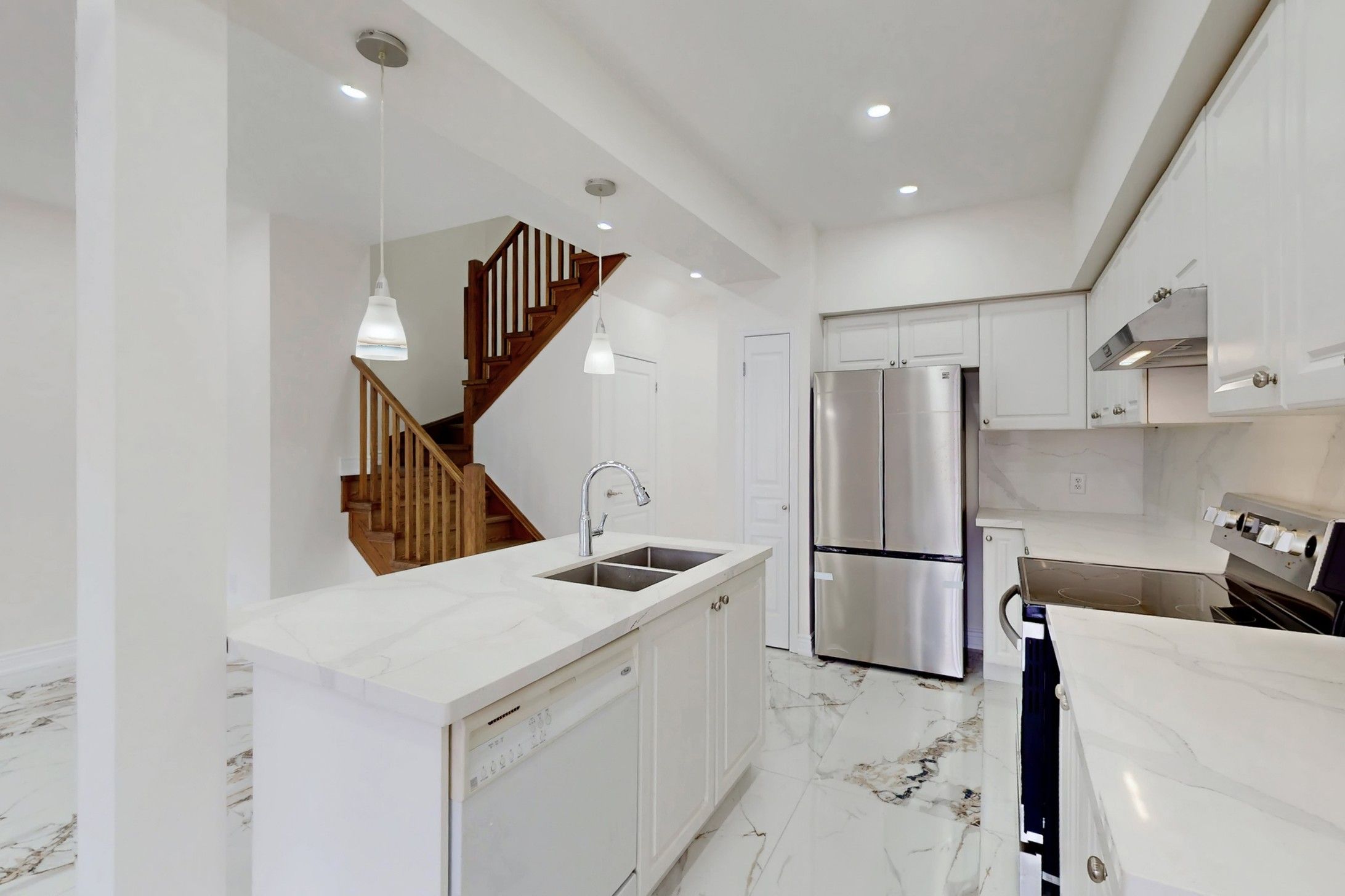 • Renovated kitchen features quartz counters and modern appliances for easy cooking.