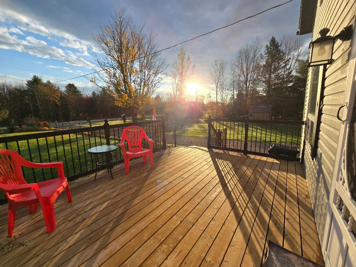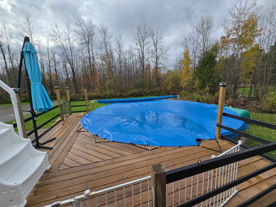 • Fully fenced front yard with a heated above-ground pool and deck.