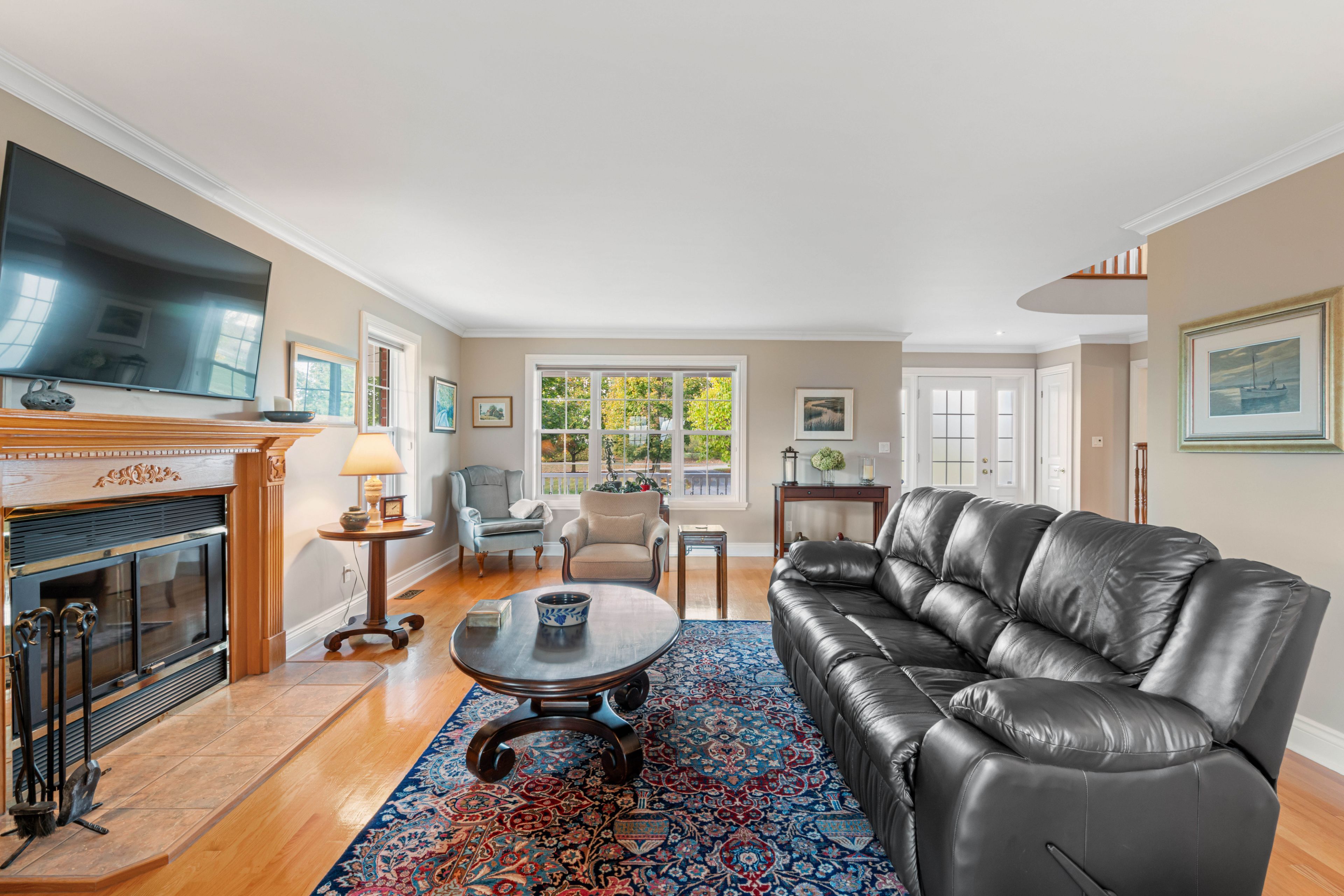 • Open concept main floor with large living room and wood fireplace.