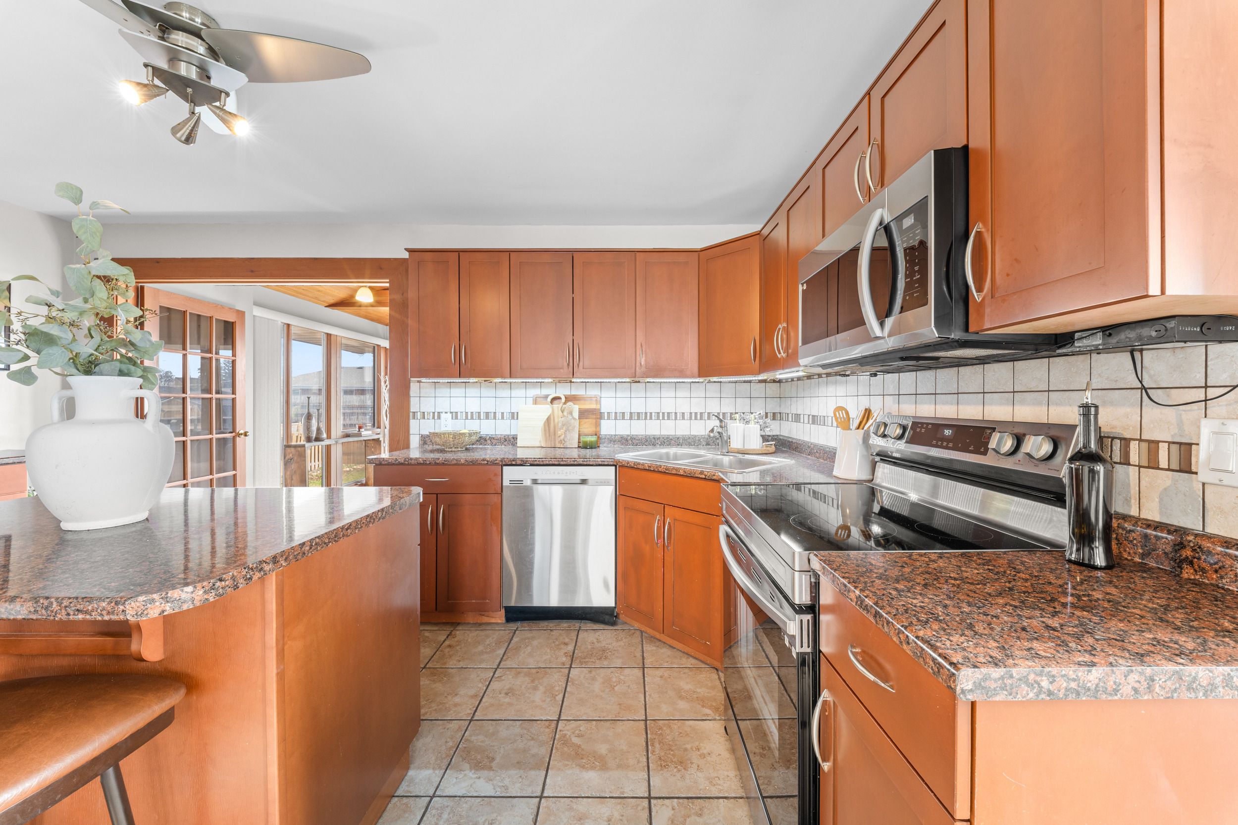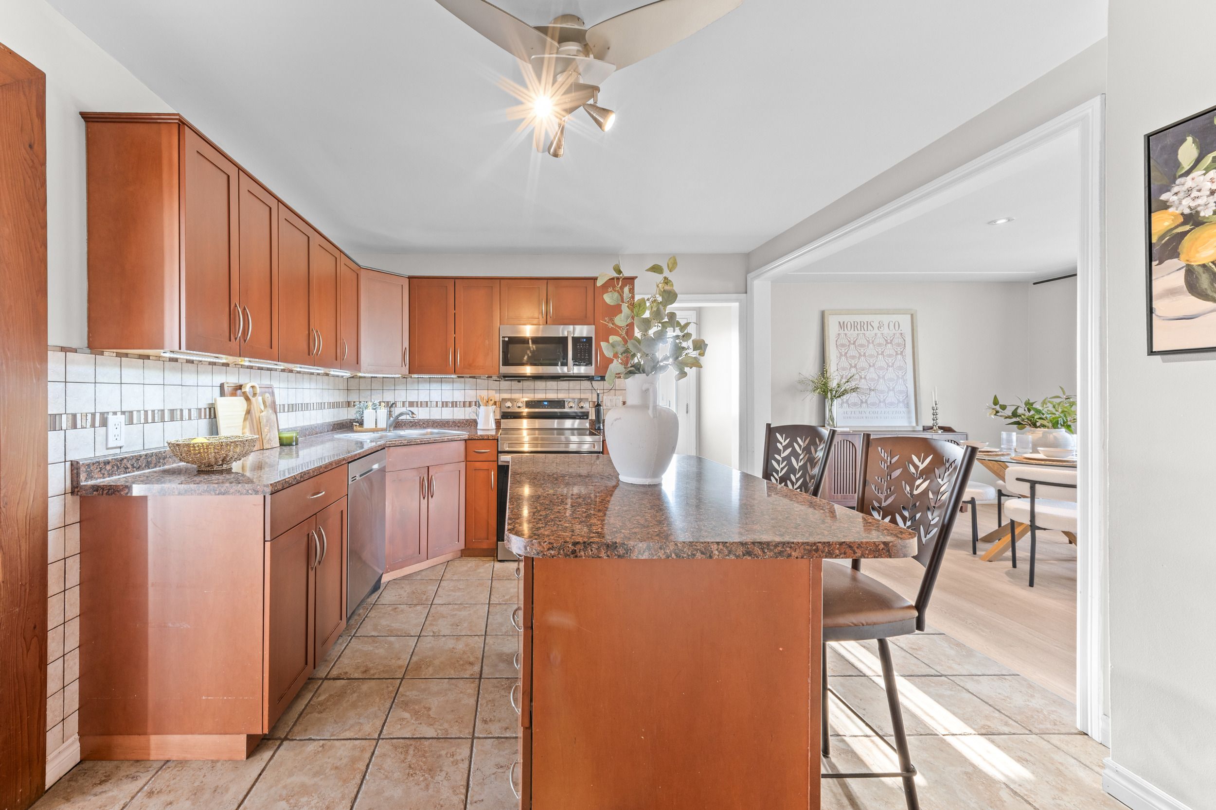 • Beautiful kitchen with stainless steel appliances and spacious island.