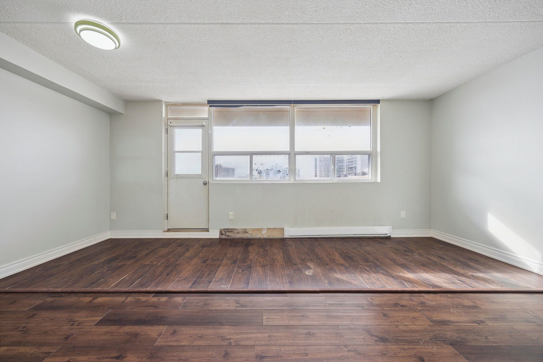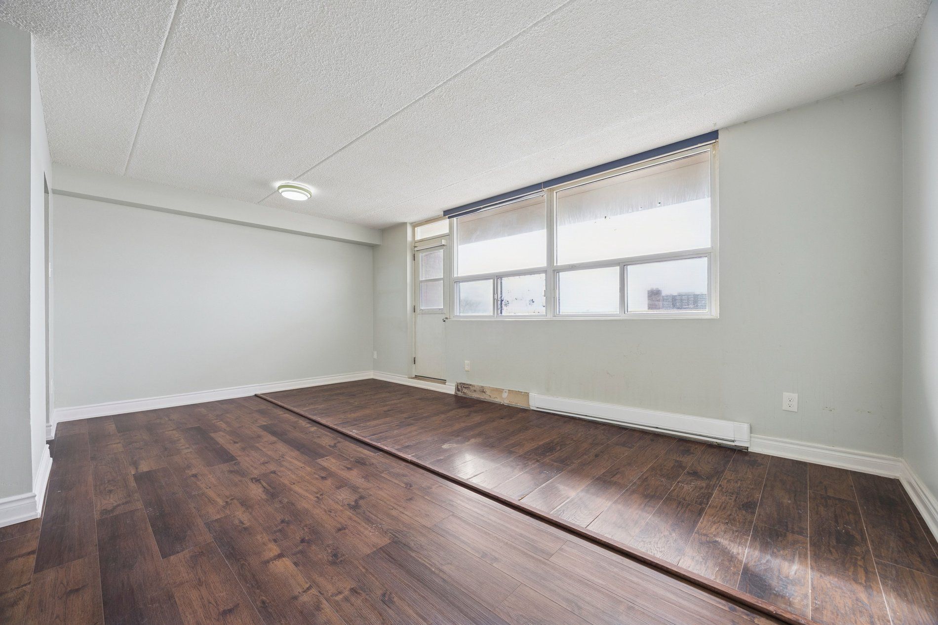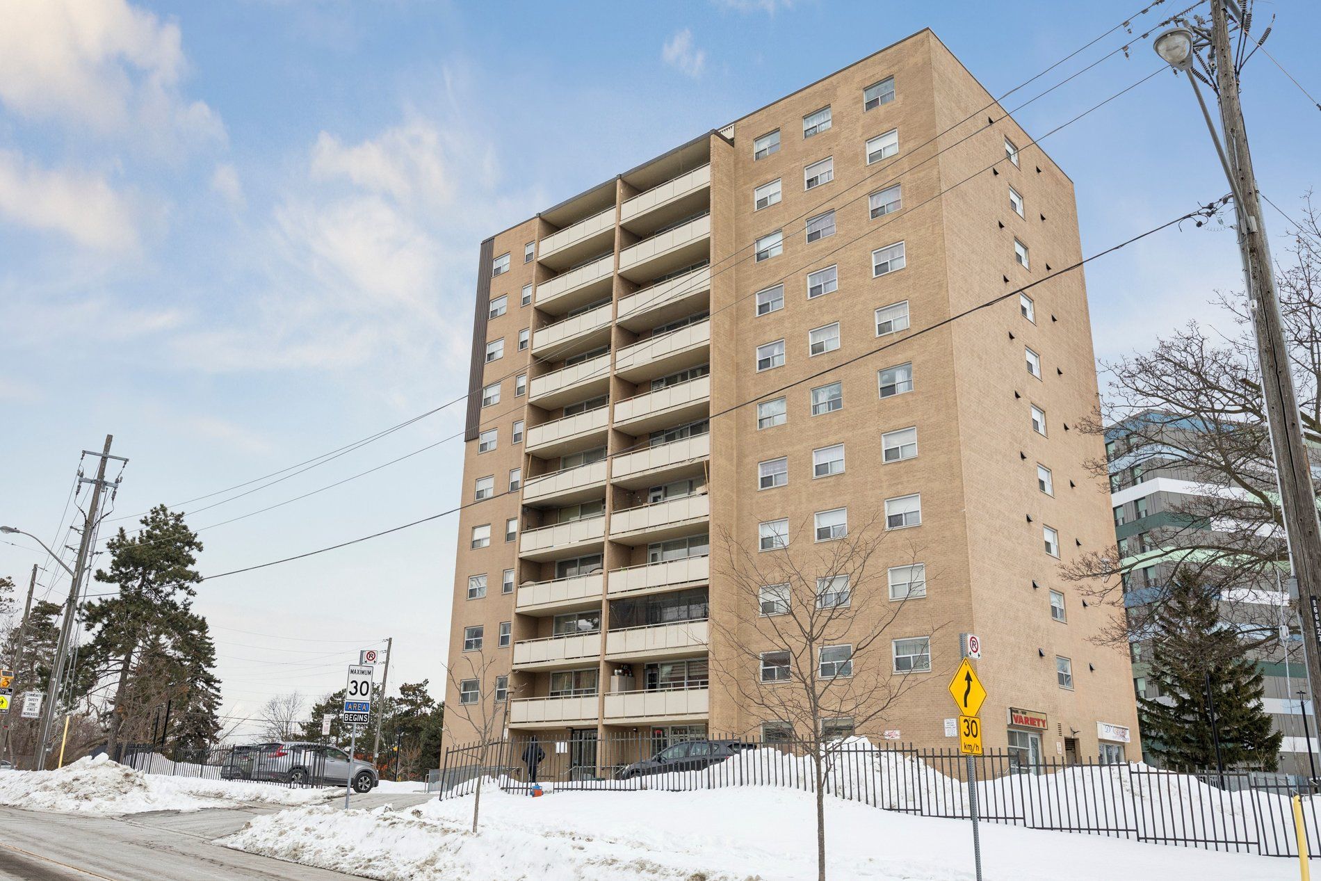 Spacious 2-bedroom condo offering a smart, functional layout filled with natural light. Open-concept living and dining area with walk-out to a large balcony. Laminate flooring throughout, complemented by quartz countertops in the kitchen and bathroom. Building features ground-level laundry and the added convenience of on-site retail, including a convenience store and hair salon.