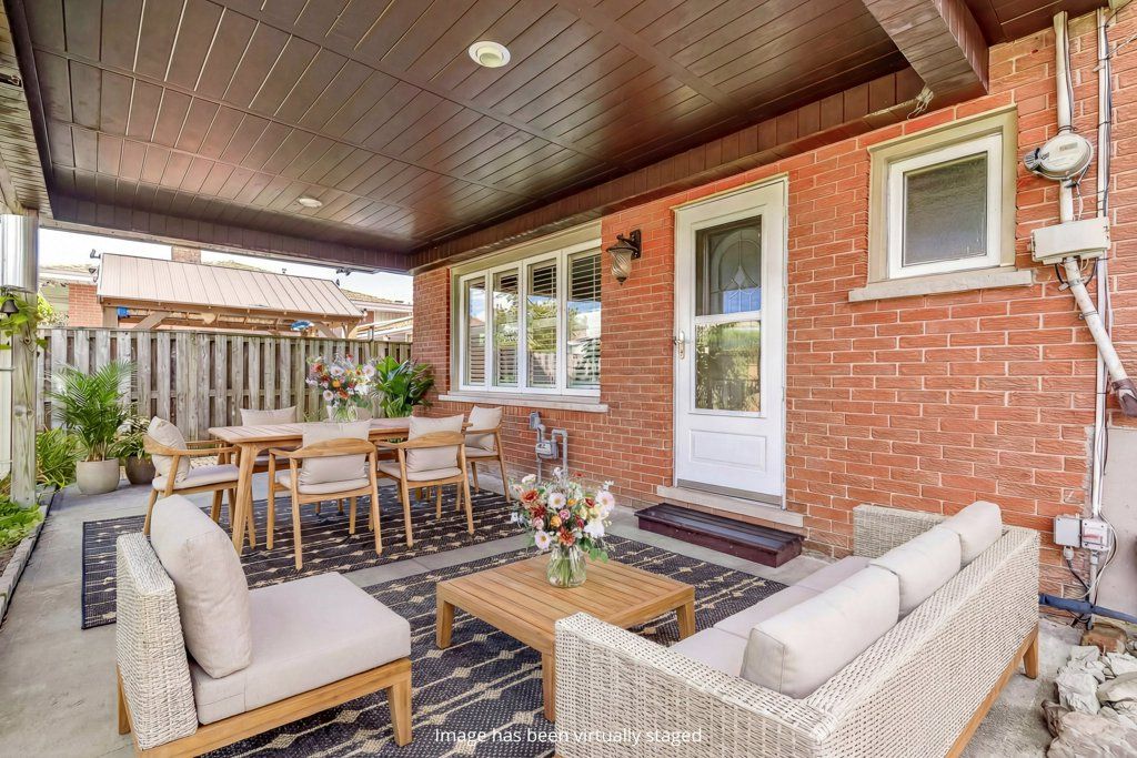 • Spacious backyard with covered patio and potential for a vegetable garden.