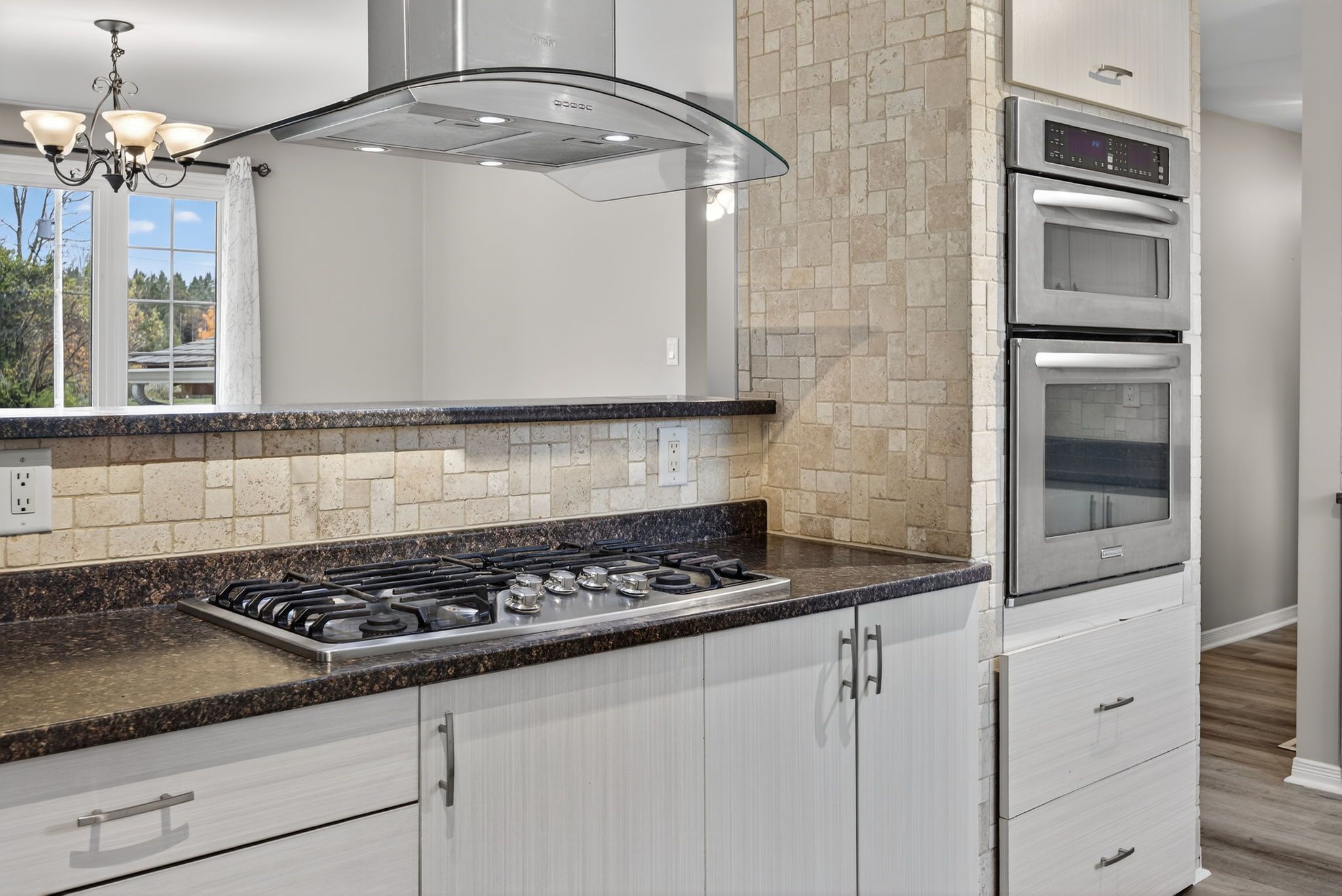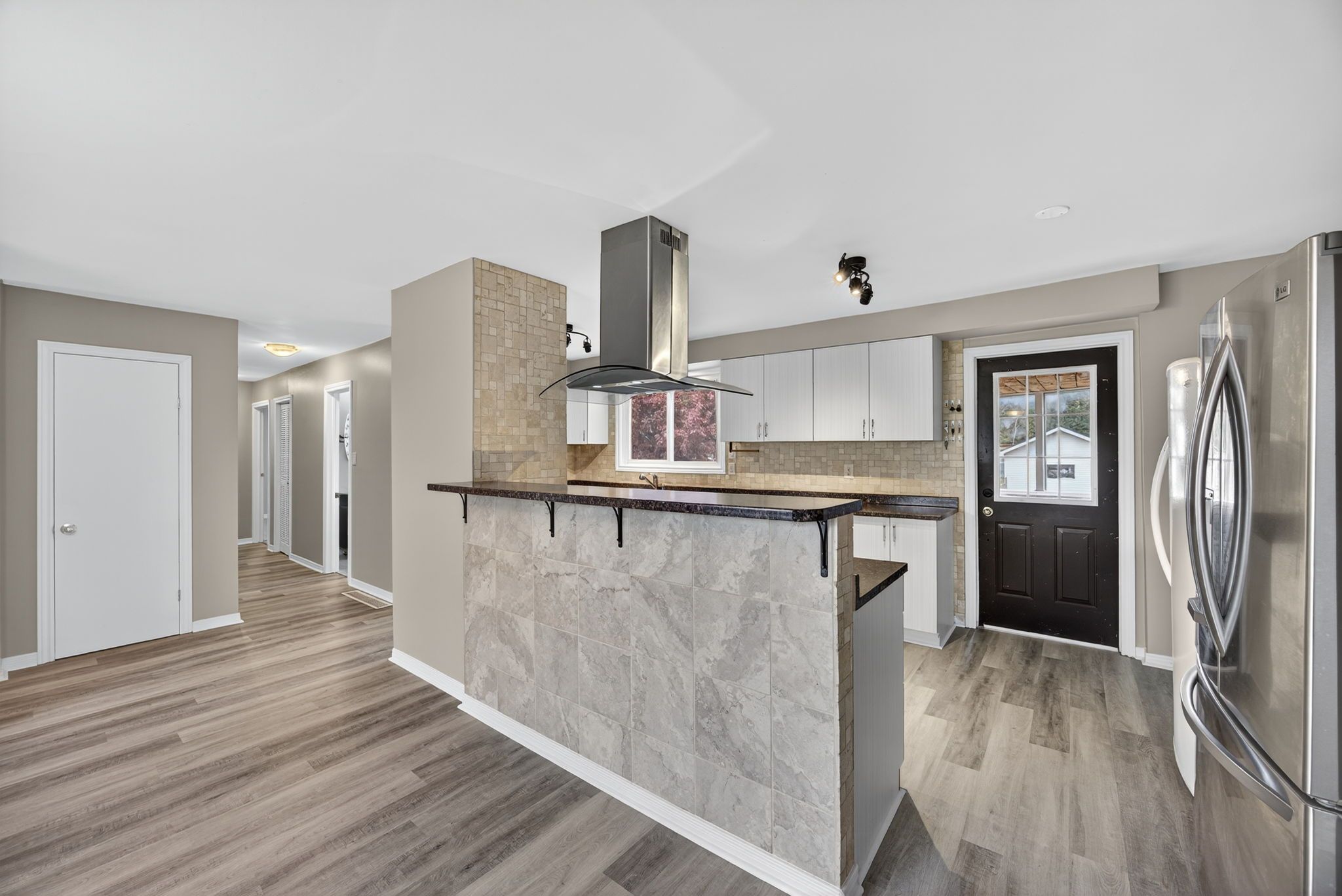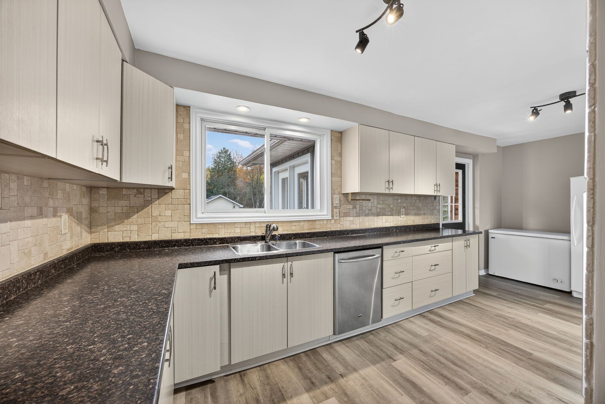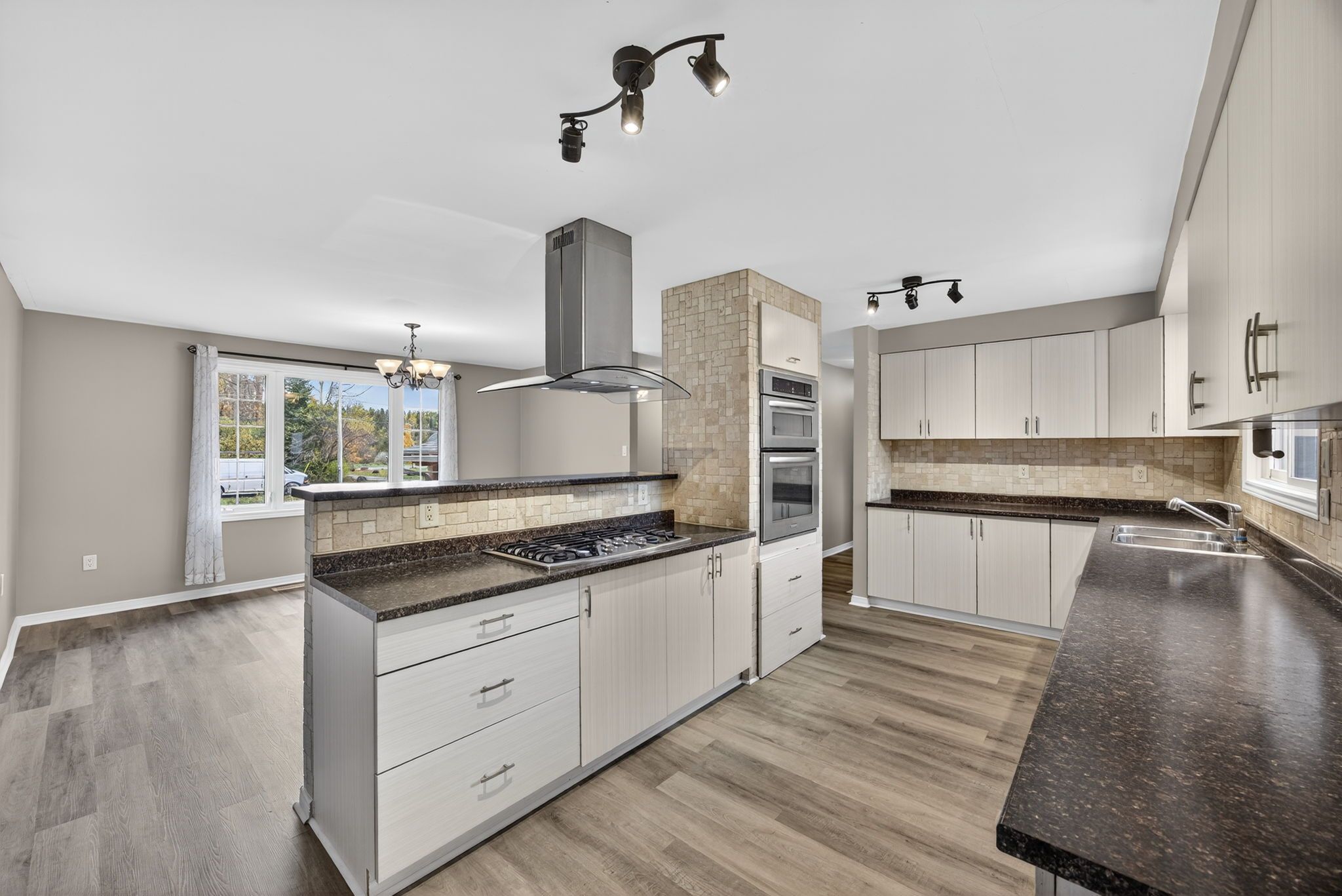 • Updated kitchen equipped with modern appliances and breakfast bar.