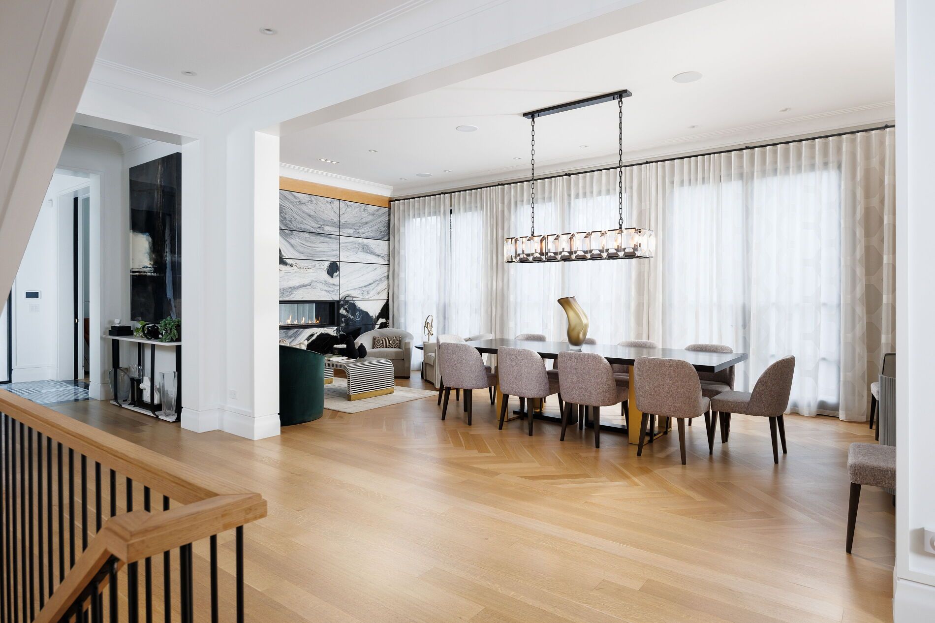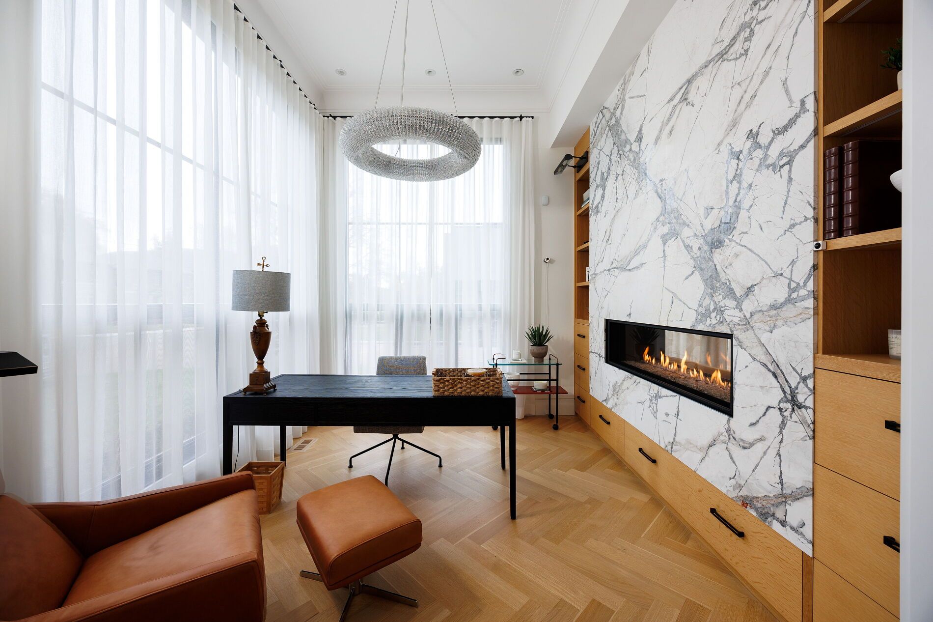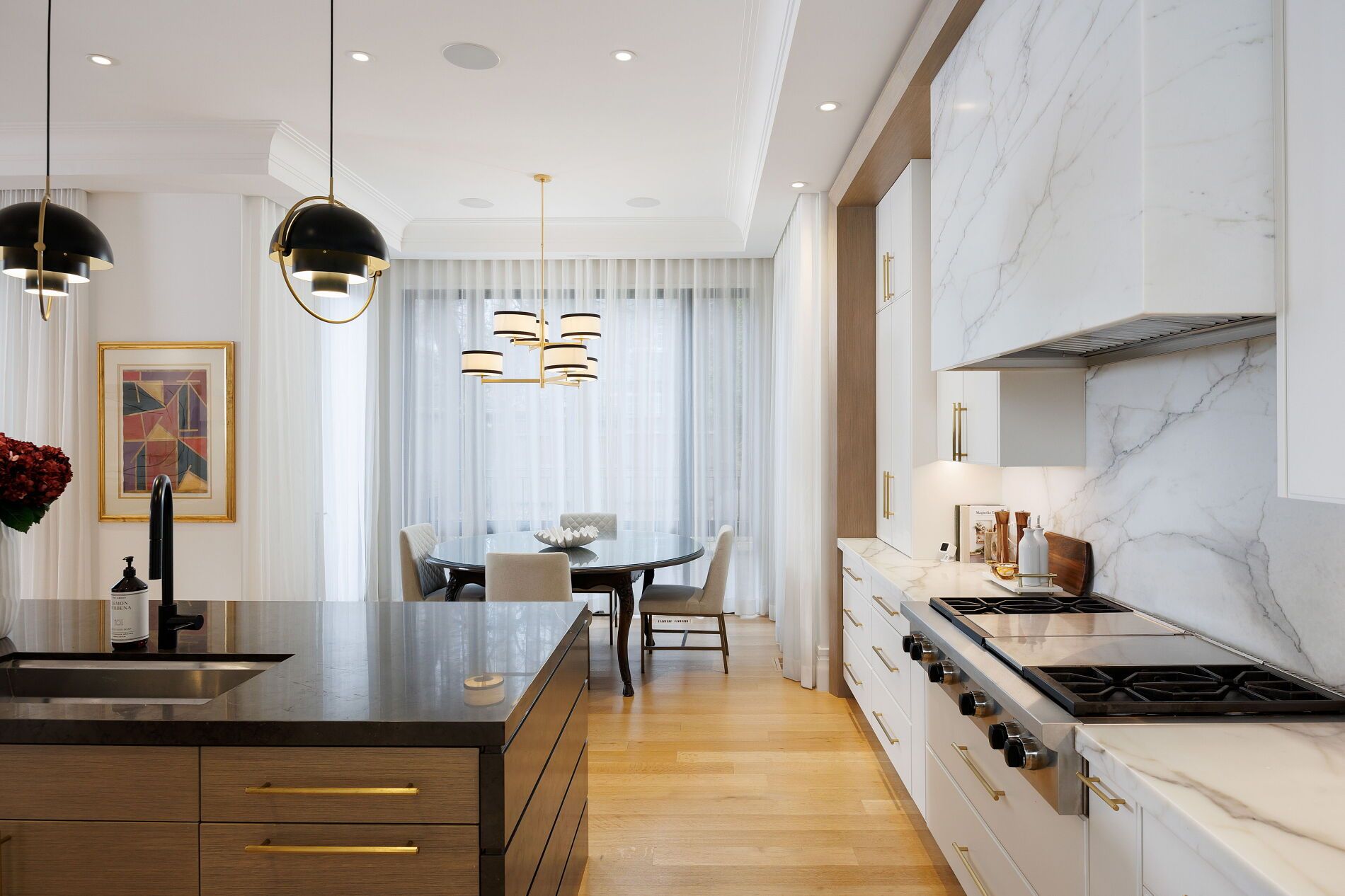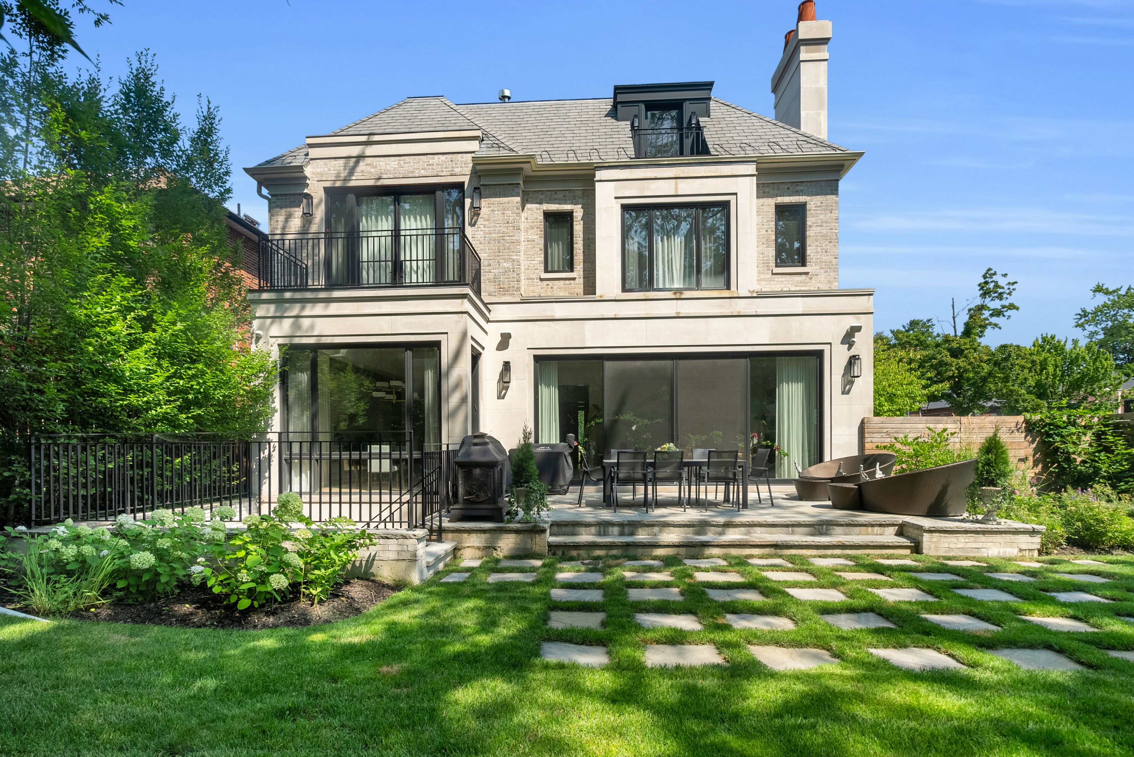 Nestled on a quiet, tree-lined street in lytton park, 207 strathallan blvd is a bespoke 5+ bedroom residence offering over 6,500 sq. Ft. Of elegantly crafted total living space. Built in 2019 by teddington homes & realized with uncompromising craftsmanship & a refined palette of luxury materials, the home was conceived under the architectural direction of limor benmor-mizrahi (formerly of peter higgins architect) & finished with interiors by debra salmoni, embodying a balance of modern sophistication & enduring comfort. A monumental front door opens into a refined foyer with a custom marble-inlay floor. A powder room is conveniently located off the foyer, across from the executive office. White oak & heated stone flooring, soaring ceilings & abundant natural light create an atmosphere of calm refinement. At the front, the executive office is anchored by a sleek see-through gas fireplace that also serves the open-concept formal living & dining areas, where french doors walk out to a flagstone terrace. The centre hall leads into the sun-filled family room with floor-to-ceiling windows & oversized sliders extending the space to the backyard. The south-facing breakfast area enjoys another walk-out. The kitchen, both a design statement & a culinary workspace, features integrated pro-grade appliances, custom bellini cabinetry, marble countertops & backsplash, an oversized limestone island with seating, extended-height cabinetry & a fully outfitted butler's pantry with access to the mudroom & garage. Upstairs, the primary suite is a private retreat with a gas fireplace, balcony, soaring ceiling & spa-inspired 5pc ensuite. Three additional bedrooms each offer a private ensuite & custom walk-in closet. The 3rd level provides a flexible 5th bedroom suite with a 3pc ensuite & balcony. The lower level features a large entertainment room with kitchenette & walkup, a glass-enclosed fitness studio, a 6th bedroom with 3pc ensuite, the main laundry room, a 2pc bath & a cold room.