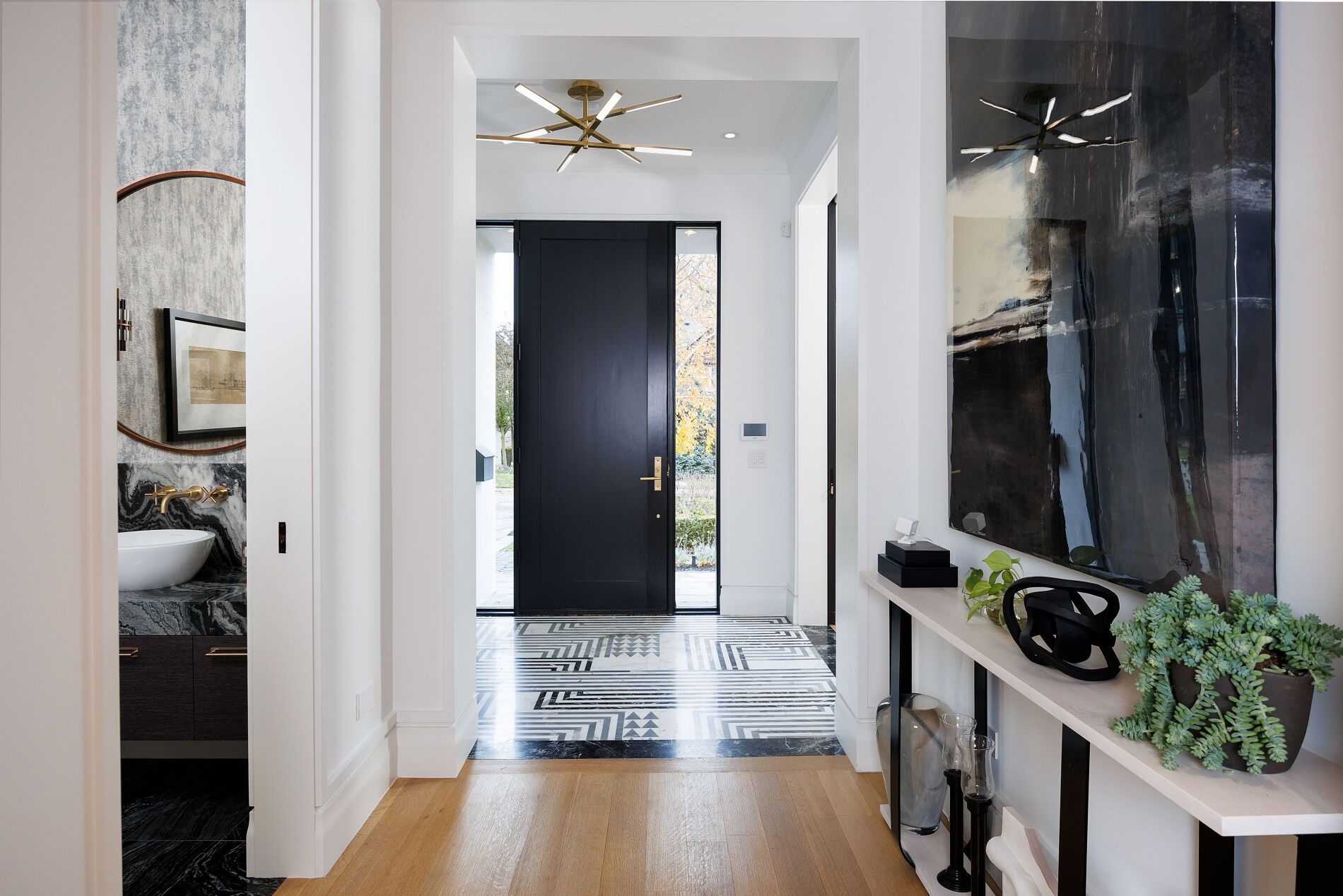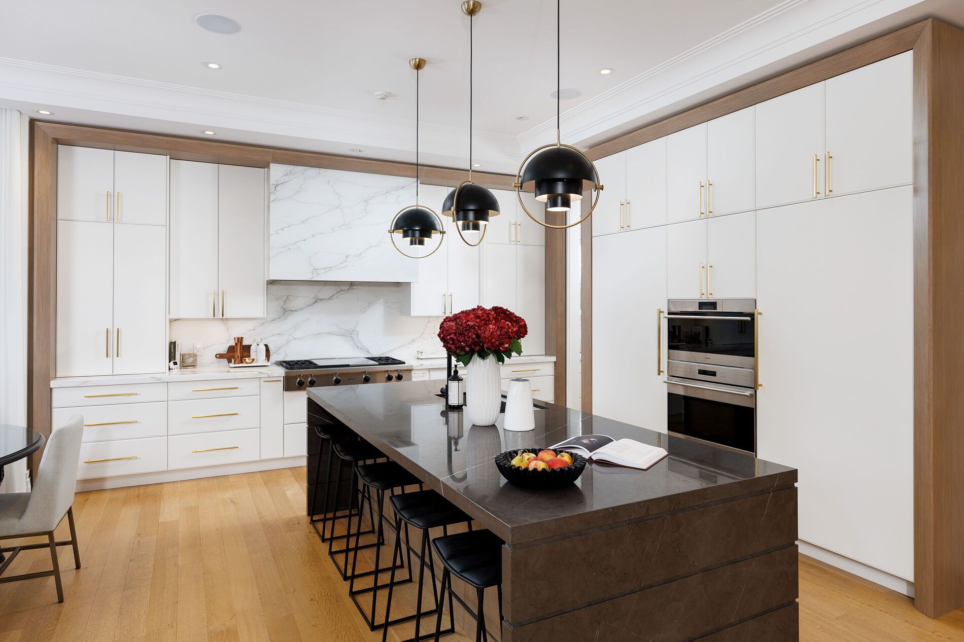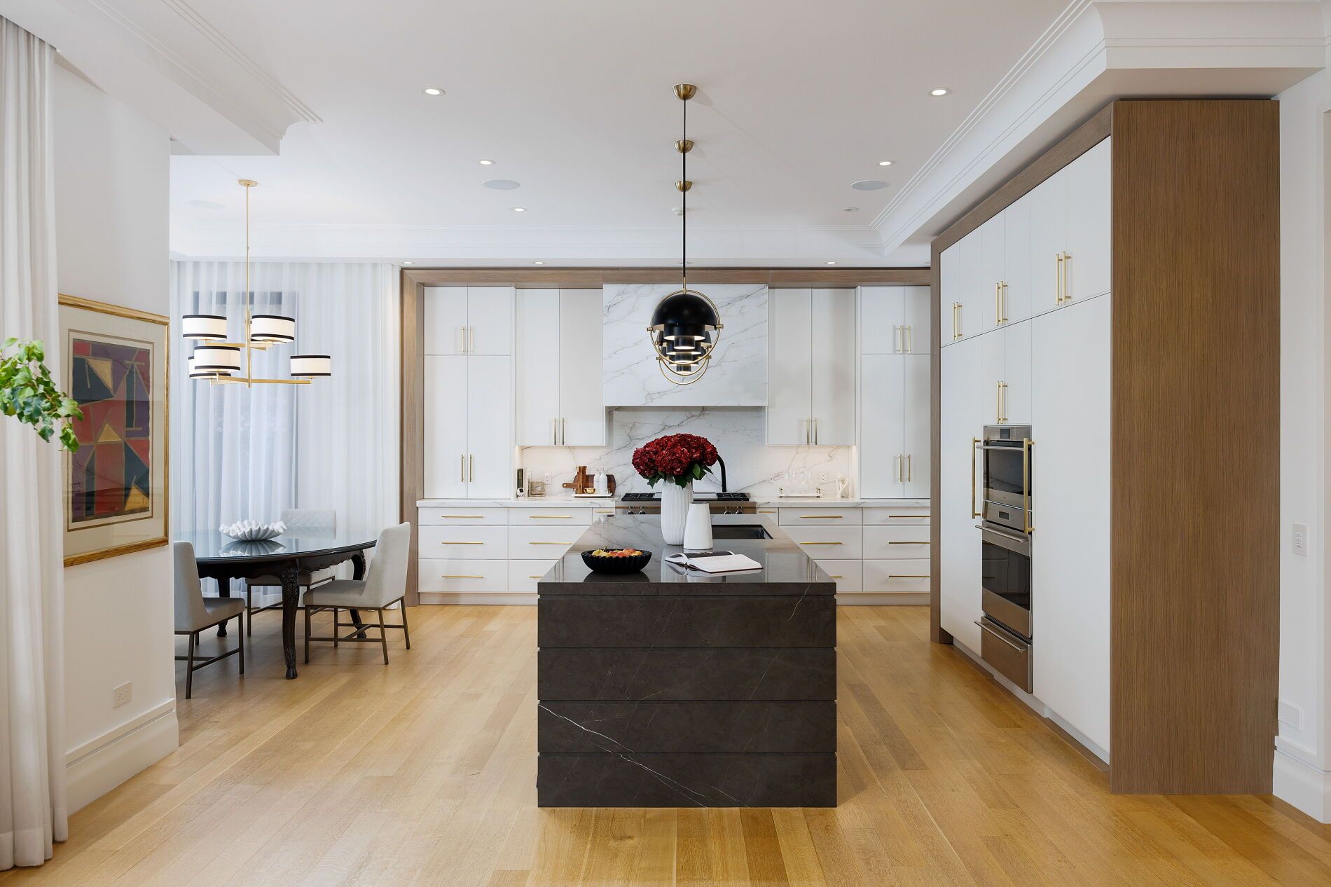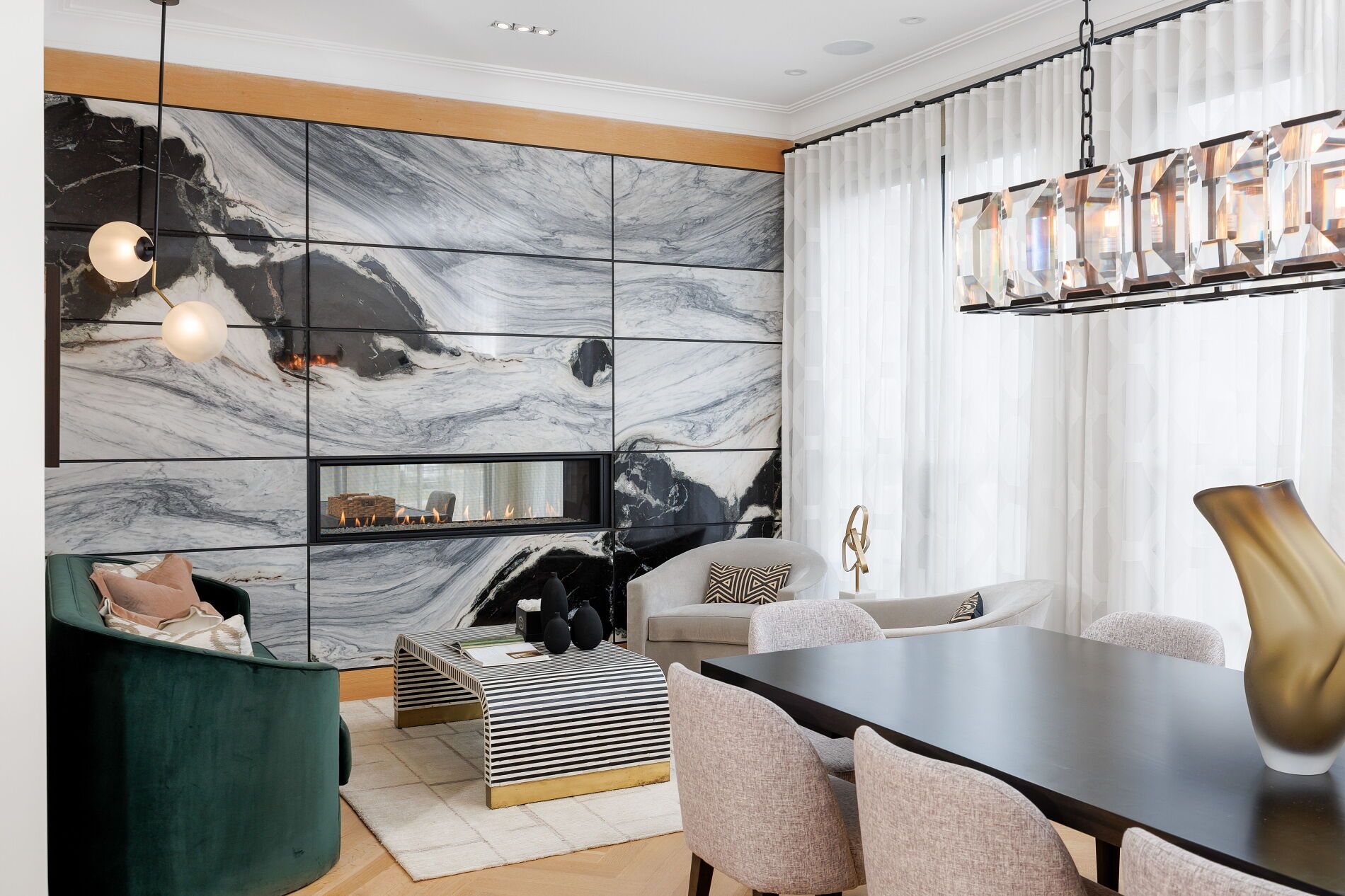 Nestled on a quiet, tree-lined street in lytton park, 207 strathallan blvd is a bespoke 5+ bedroom residence offering over 6,500 sq. Ft. Of elegantly crafted total living space. Built in 2019 by teddington homes & realized with uncompromising craftsmanship & a refined palette of luxury materials, the home was conceived under the architectural direction of limor benmor-mizrahi (formerly of peter higgins architect) & finished with interiors by debra salmoni, embodying a balance of modern sophistication & enduring comfort. A monumental front door opens into a refined foyer with a custom marble-inlay floor. A powder room is conveniently located off the foyer, across from the executive office. White oak & heated stone flooring, soaring ceilings & abundant natural light create an atmosphere of calm refinement. At the front, the executive office is anchored by a sleek see-through gas fireplace that also serves the open-concept formal living & dining areas, where french doors walk out to a flagstone terrace. The centre hall leads into the sun-filled family room with floor-to-ceiling windows & oversized sliders extending the space to the backyard. The south-facing breakfast area enjoys another walk-out. The kitchen, both a design statement & a culinary workspace, features integrated pro-grade appliances, custom bellini cabinetry, marble countertops & backsplash, an oversized limestone island with seating, extended-height cabinetry & a fully outfitted butler's pantry with access to the mudroom & garage. Upstairs, the primary suite is a private retreat with a gas fireplace, balcony, soaring ceiling & spa-inspired 5pc ensuite. Three additional bedrooms each offer a private ensuite & custom walk-in closet. The 3rd level provides a flexible 5th bedroom suite with a 3pc ensuite & balcony. The lower level features a large entertainment room with kitchenette & walkup, a glass-enclosed fitness studio, a 6th bedroom with 3pc ensuite, the main laundry room, a 2pc bath & a cold room.