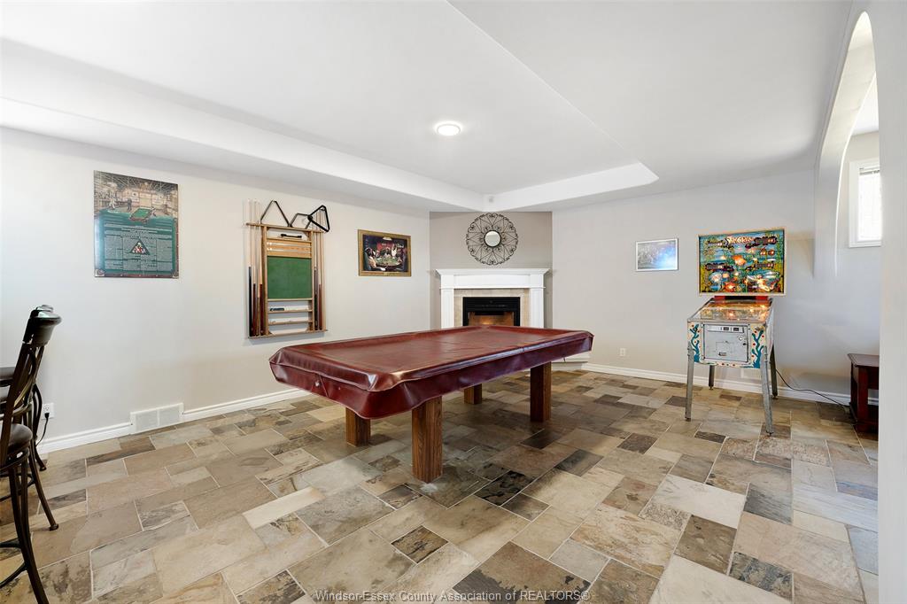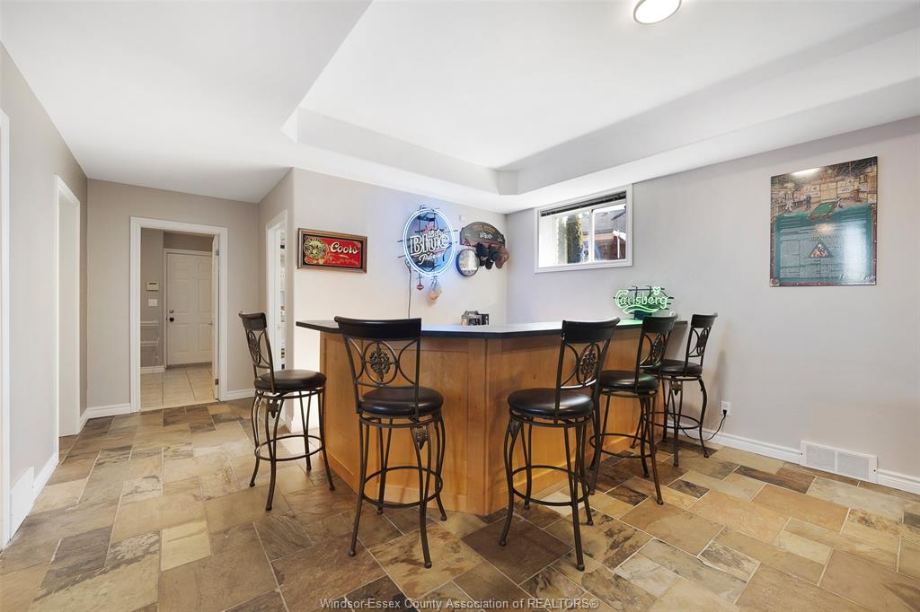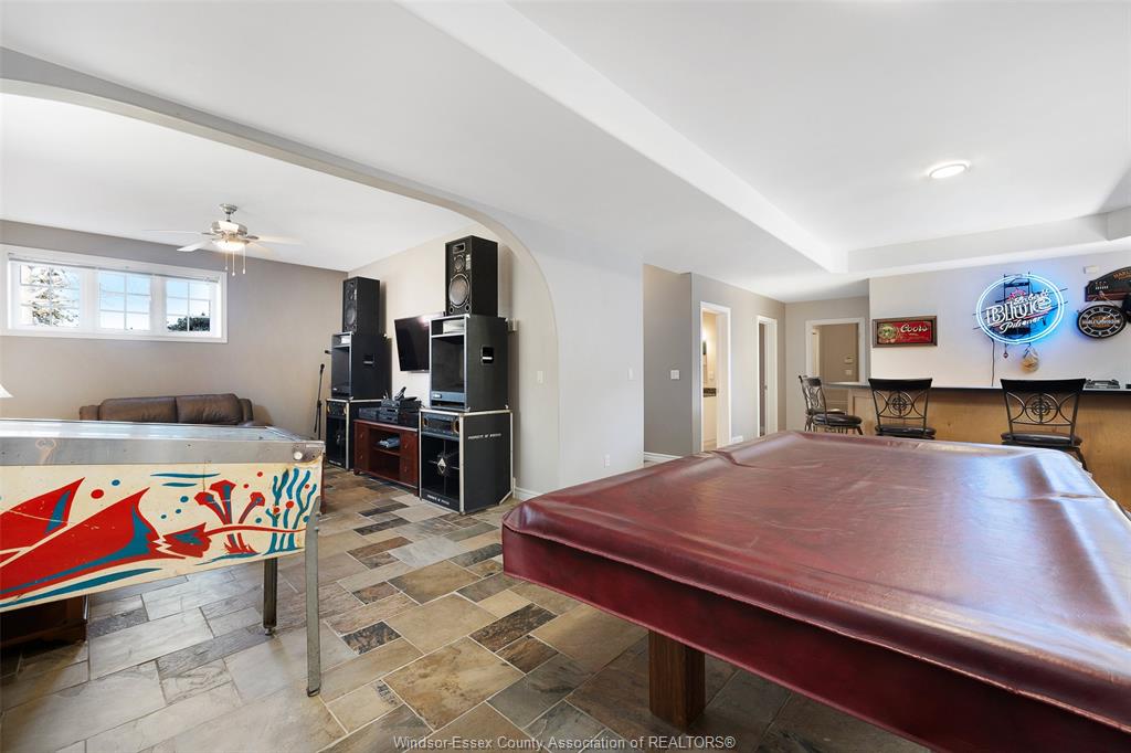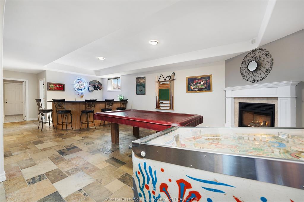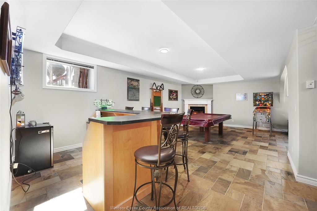 • Finished lower level with family room, games area, and bar.