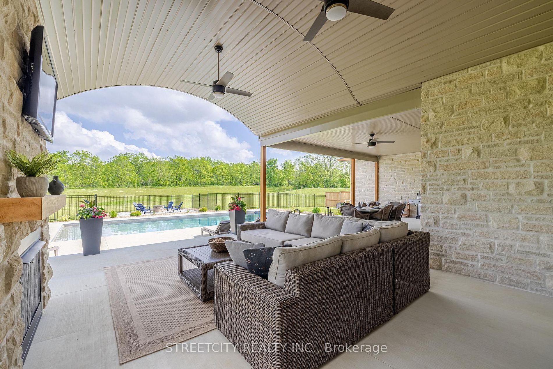 Endless possibilities await in this extraordinary custom-built estate, offering the rare combination of 6. 9 acres of countryside privacy within the city, just minutes from hyde park shopping centre and western university. This architectural masterpiece blends old-world charm with modern luxury and includes a private guest house, ideal for extended family, visitors, or rental income. The main residence is thoughtfully designed for multi-generational living, featuring a recreation room with bar/kitchen, two additional bedrooms, a full bath, and laundry facilities. An inviting entrance opens to a stunning open-concept layout with 10-foot ceilings and in-floor heating on both levels, delivering refined comfort throughout. An elongated dining room sets the stage for memorable gatherings, while a cozy gas fireplace with stone mantle adds warmth and character. A striking barrel ceiling extends from the great room to the covered rear porch, seamlessly connecting indoor and outdoor living. The chef-inspired kitchen is anchored by a custom stone-cast range hood and a 48-inch professional gas stove with eight burners and dual ovens. Patio doors from the dinette and a convenient pass-through window from the fully equipped pantry lead to the rear porch dining area, making entertaining effortless. Secondary bedrooms offer custom closets and private ensuites for exceptional comfort and privacy. With over 6,573 sq ft of finished living space, this home is as functional as it is impressive. Outdoors, enjoy a resort-style setting with a covered porch, stone gas fireplace, and views of the 18' x 40' in-ground pool with sun ledge-perfect for relaxing or hosting unforgettable gatherings. A rare offering of luxury, space, and versatility, this estate is designed for elevated family living.