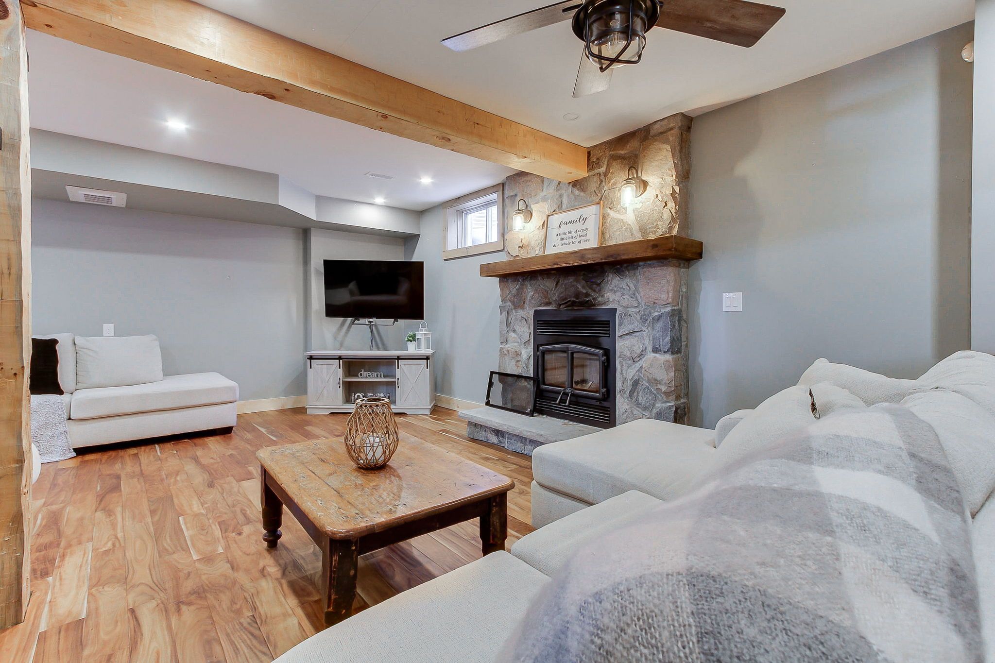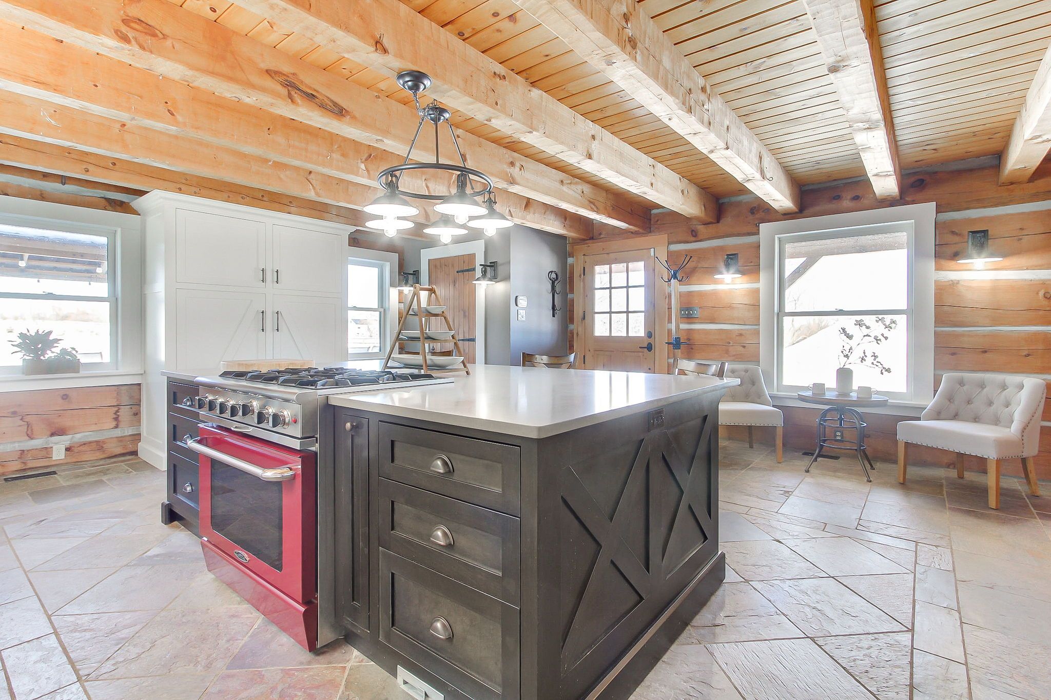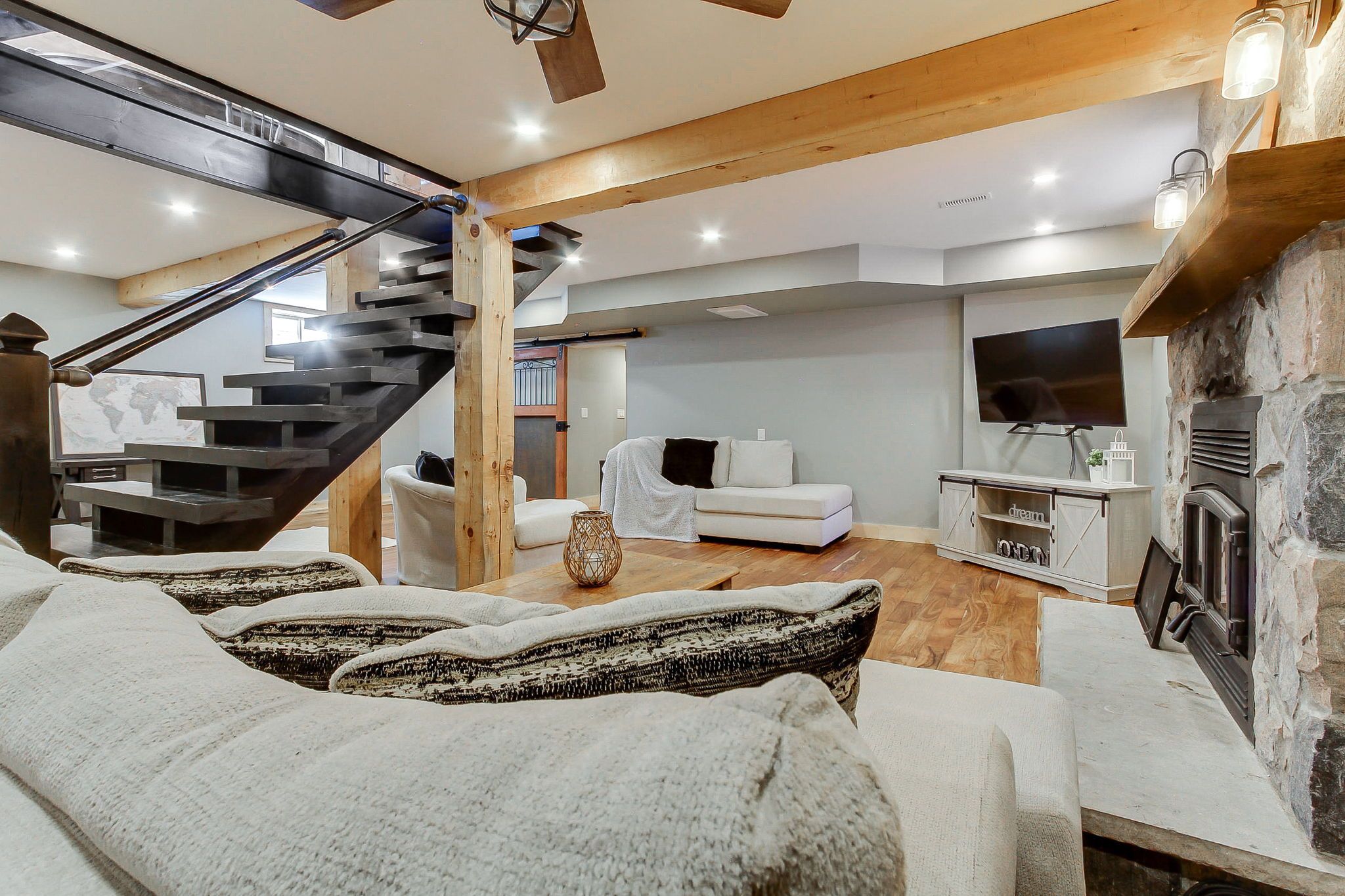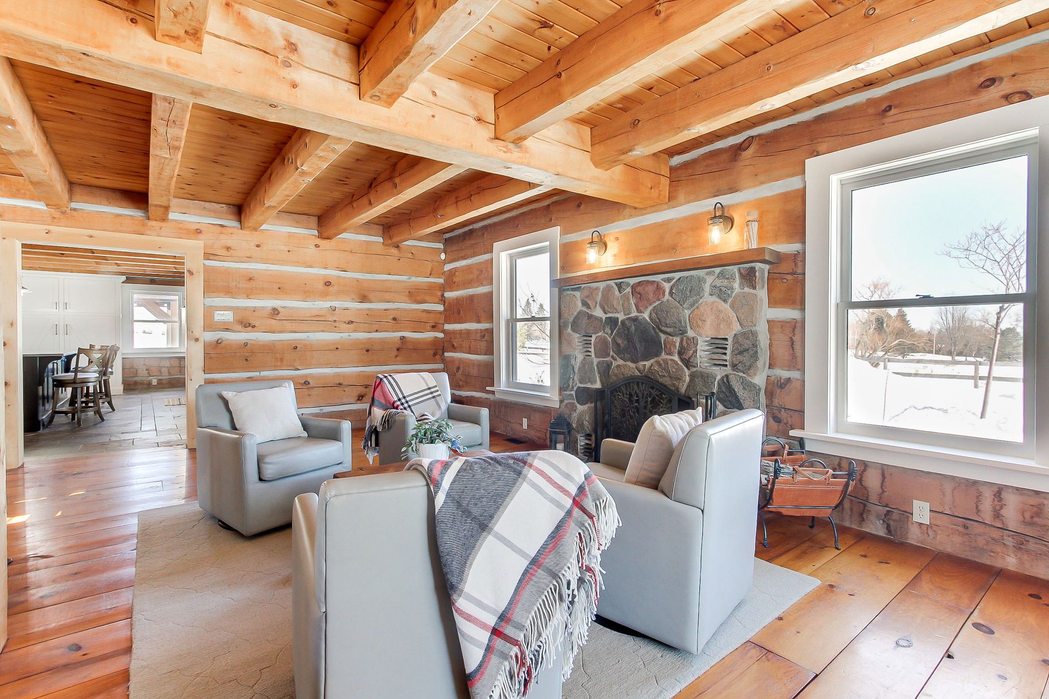 • Bright open-concept living with large windows and a wood-burning fireplace.
