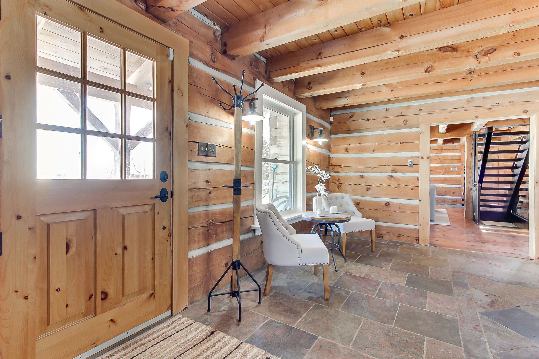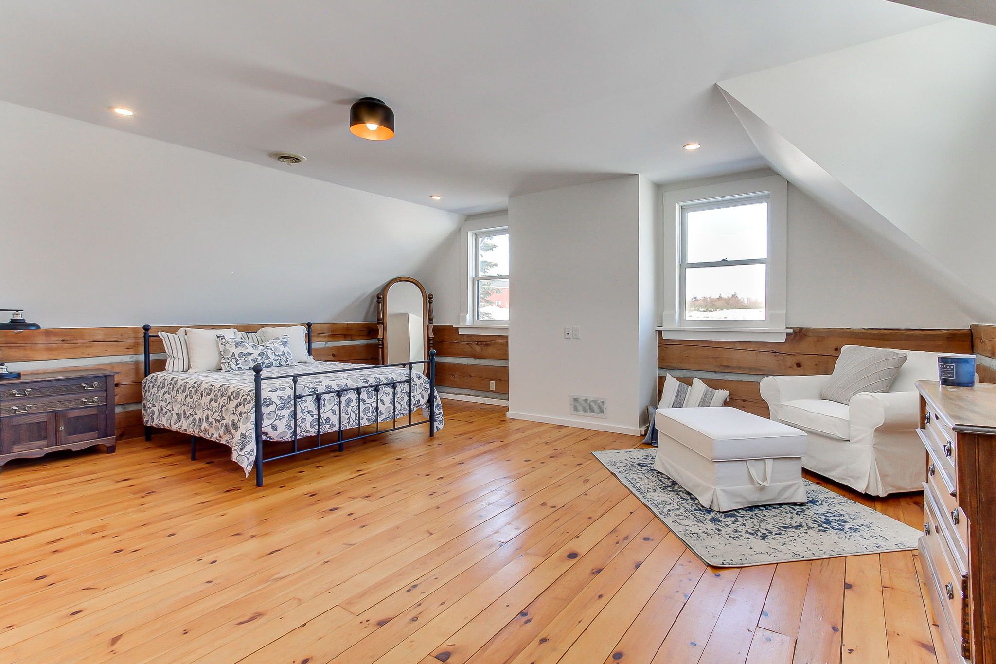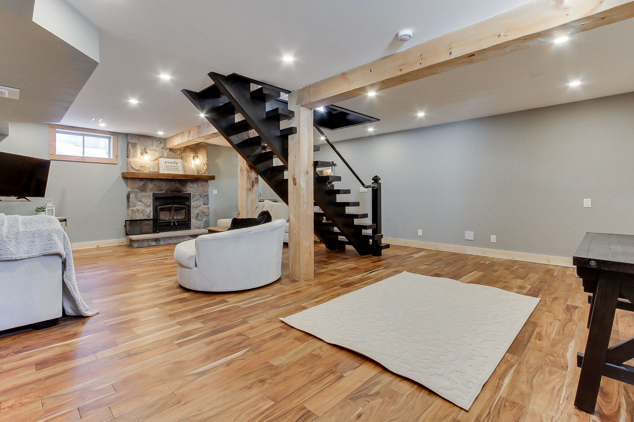 • Bright open-concept living with large windows and a wood-burning fireplace.