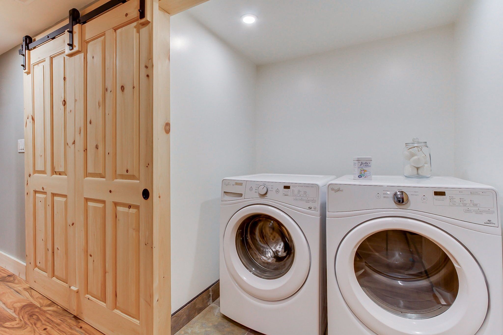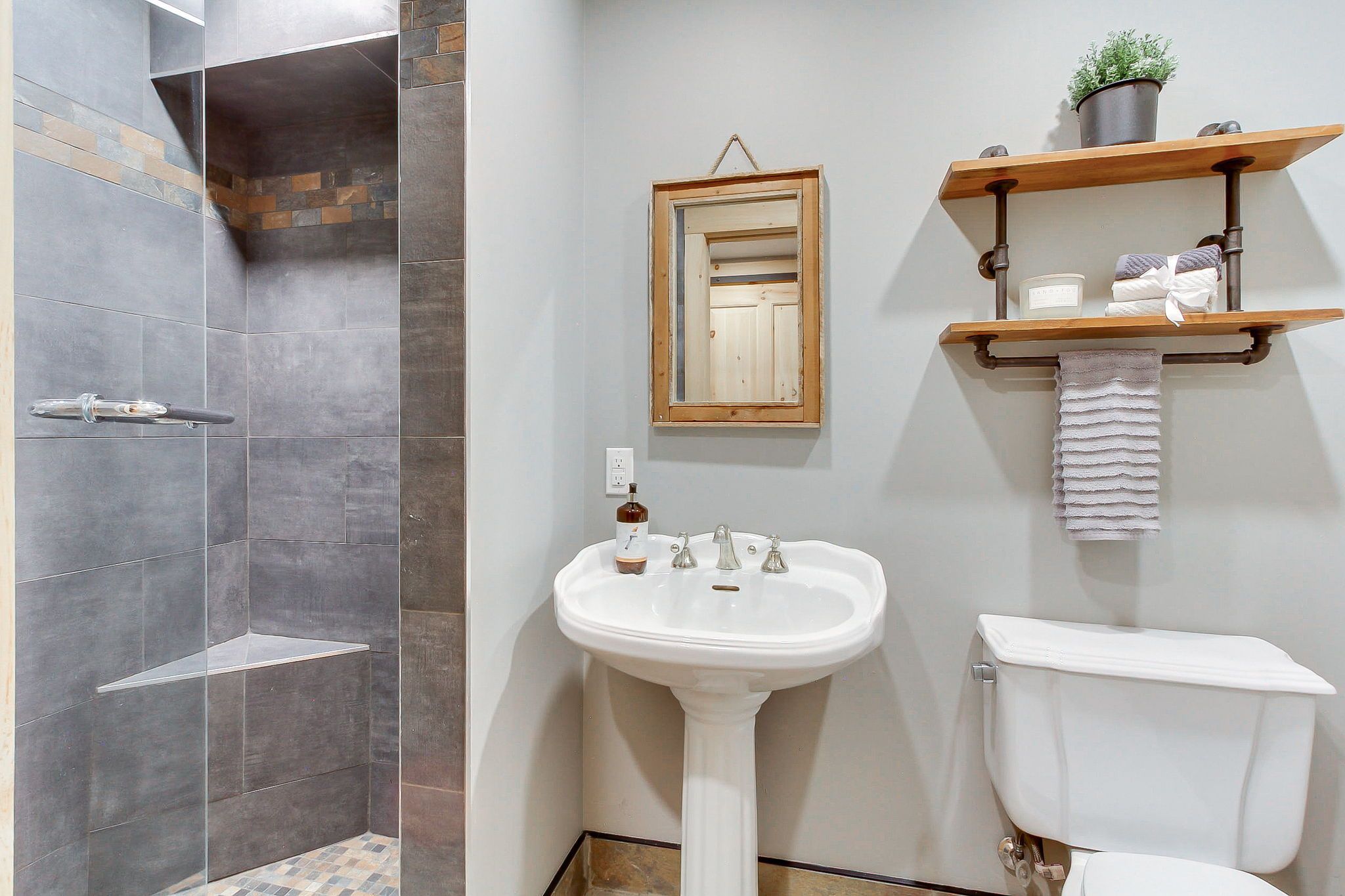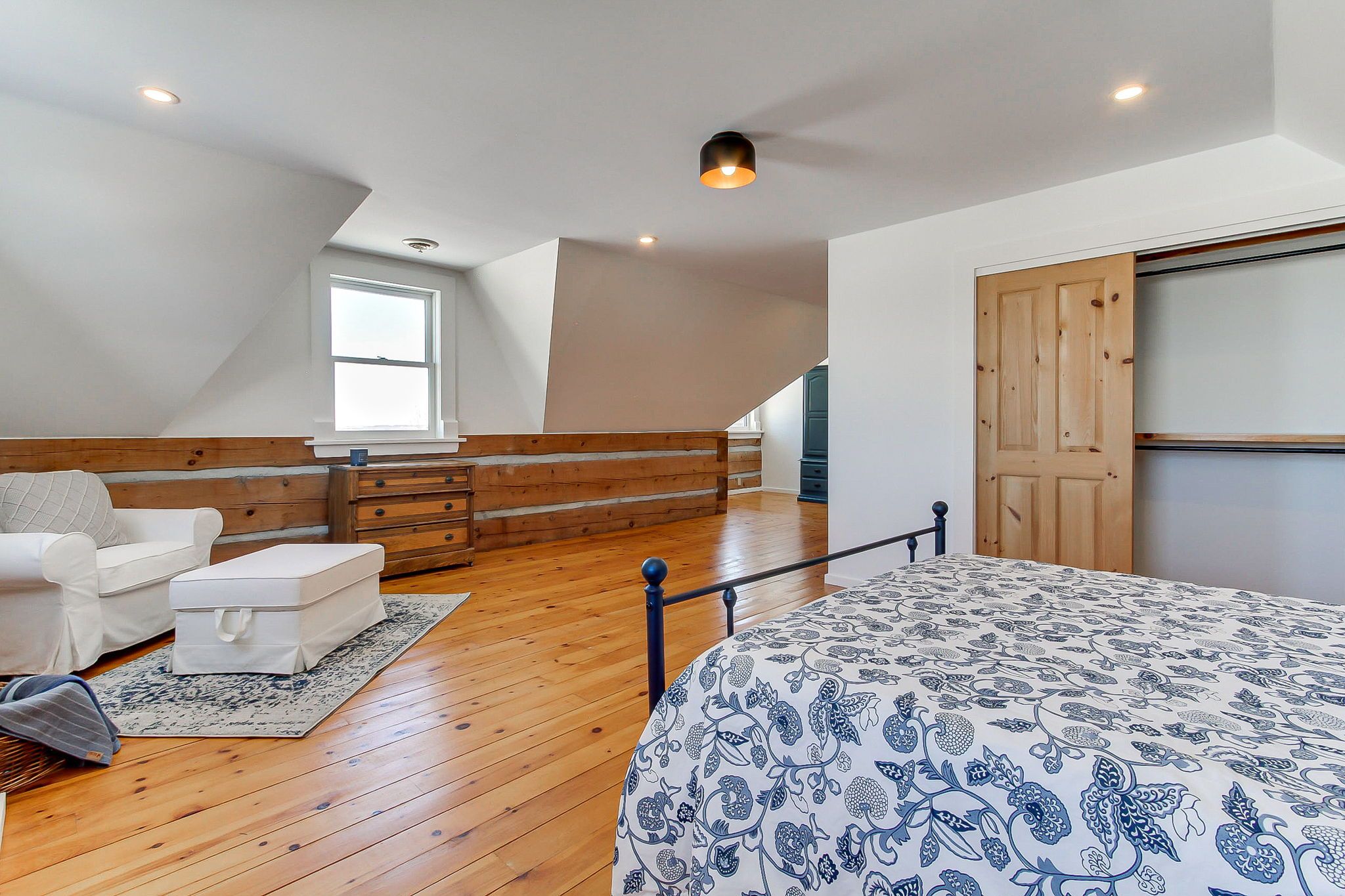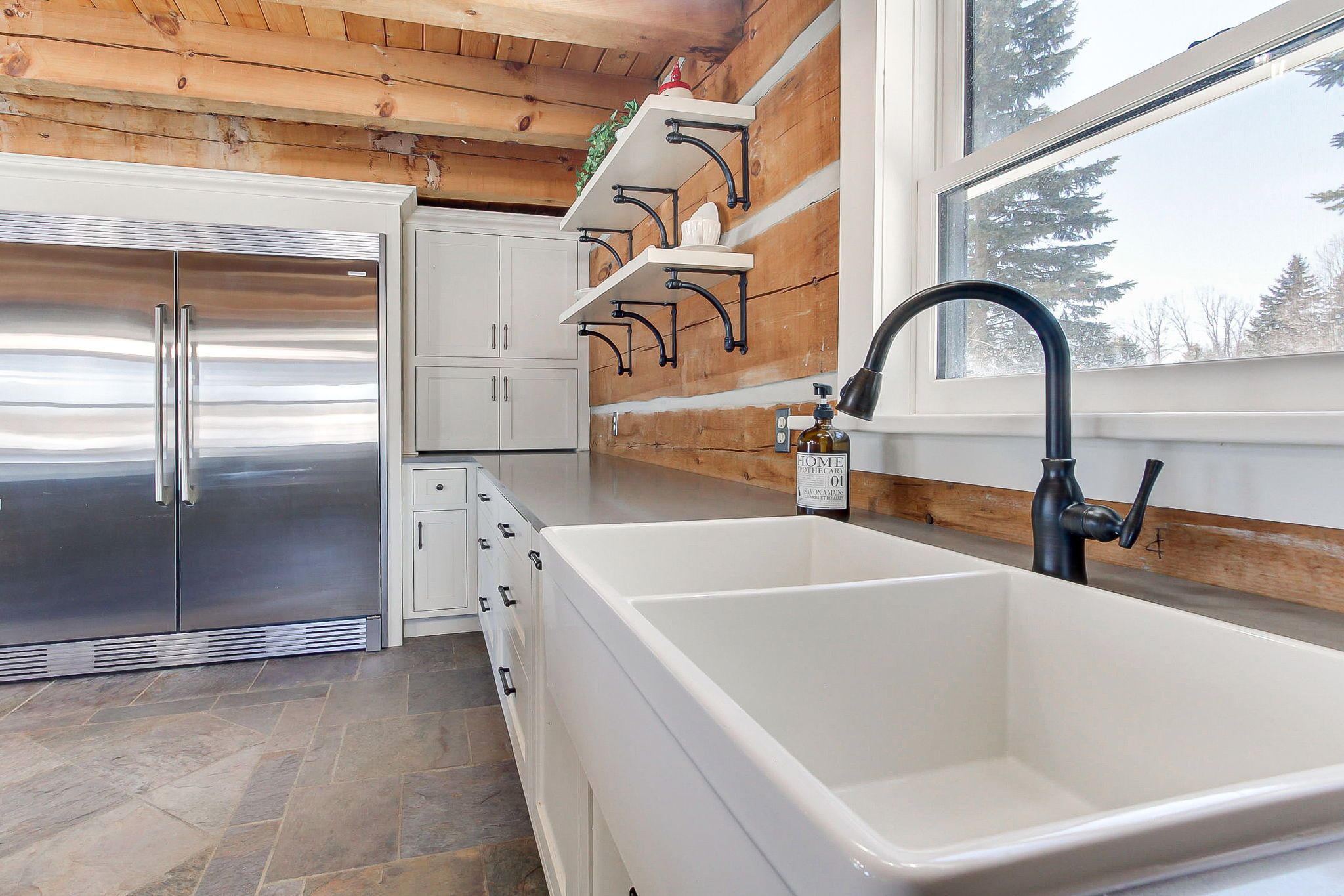• Bright open-concept living with large windows and a wood-burning fireplace.