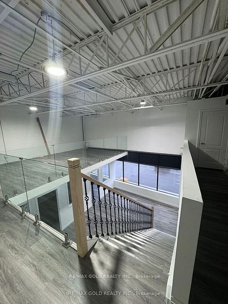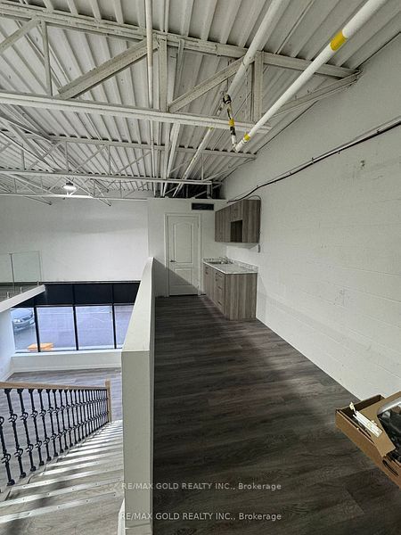 Unit allows auto repair/auto body shop use and features glass-front windows with excellent exposure. The space includes three private glass offices, a welcoming lobby area, kitchen, washroom, and additional upper-level workstation space. Steel ramp installed for automotive use. Boasting 18 ft clear ceiling height and a column-free layout, the unit offers excellent functionality for a variety of uses, including warehousing, light manufacturing, kitchen cabinet manufacturing, and other permitted industrial/commercial uses.