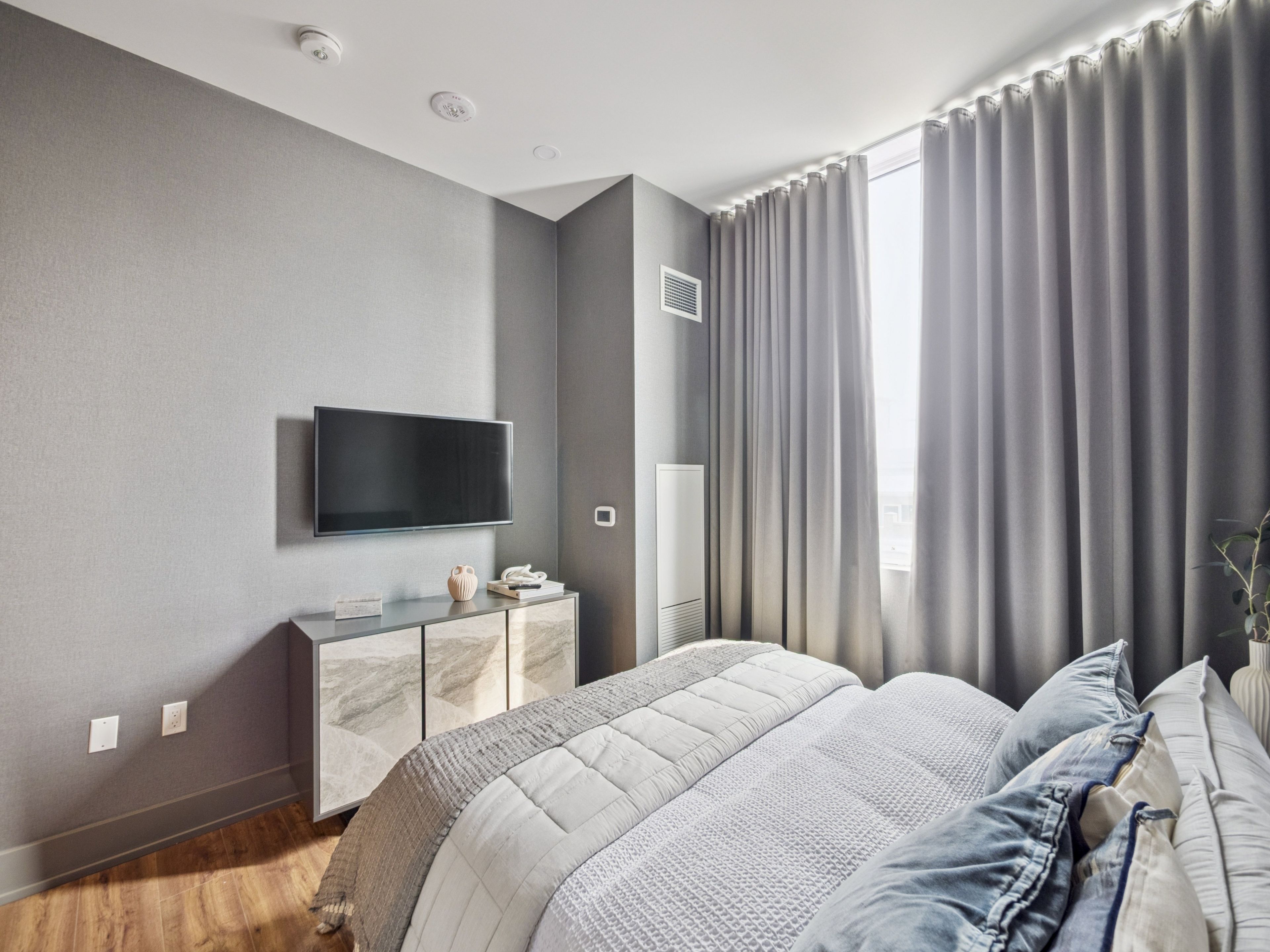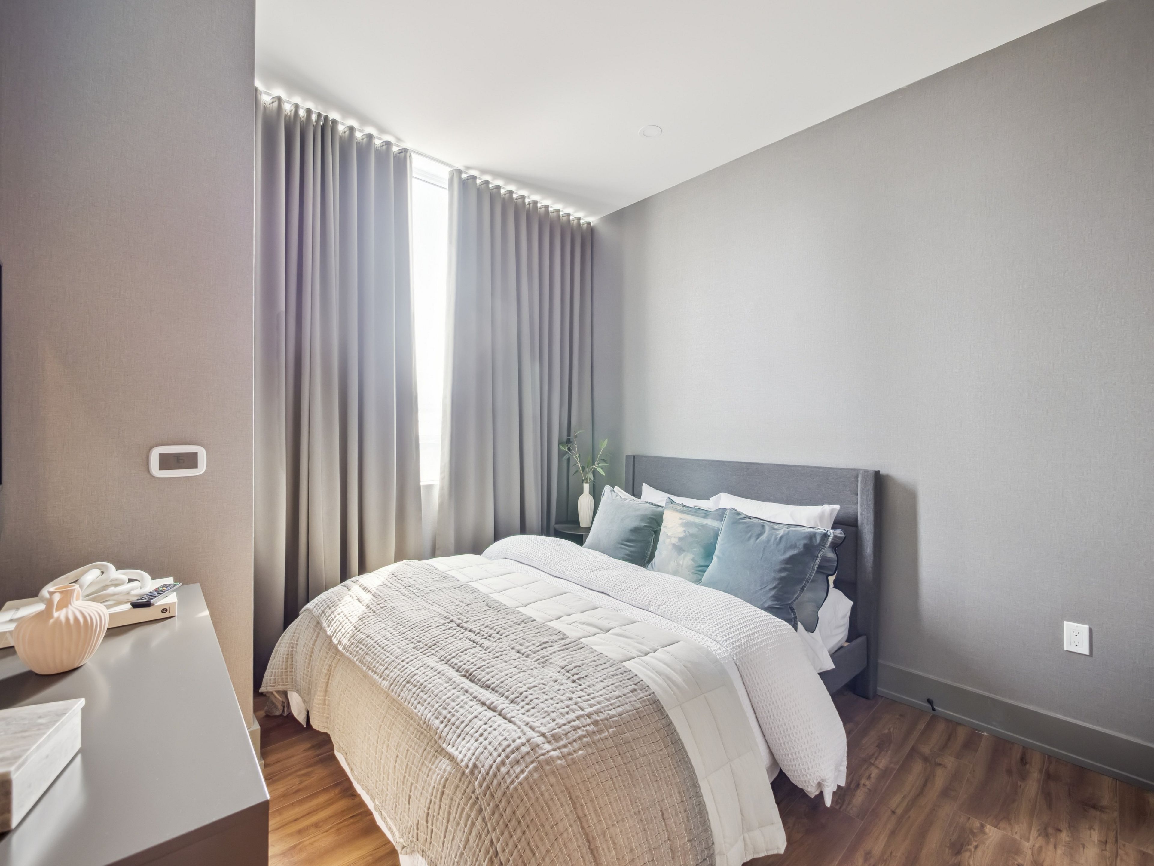 • Primary bedroom with ensuite and secondary bedroom with stylish doors.