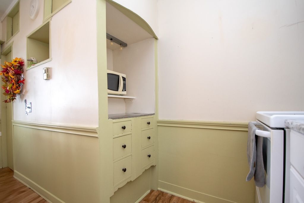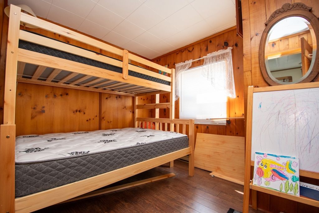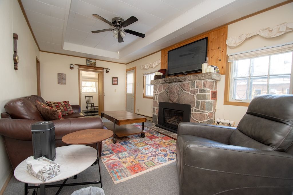 • Cozy interior features two bedrooms, bright kitchen, and stone fireplace.