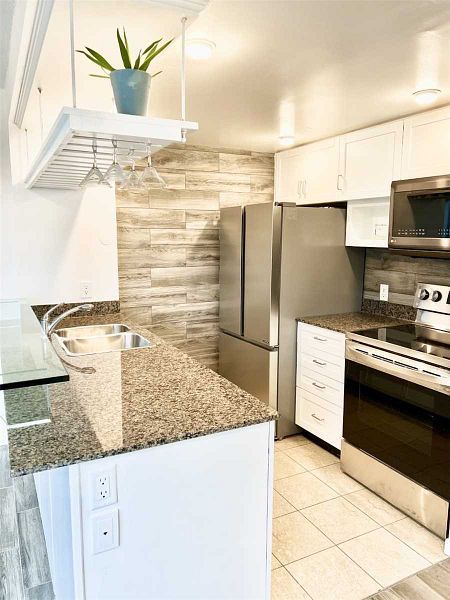• Modern kitchen features granite countertops and breakfast bar.