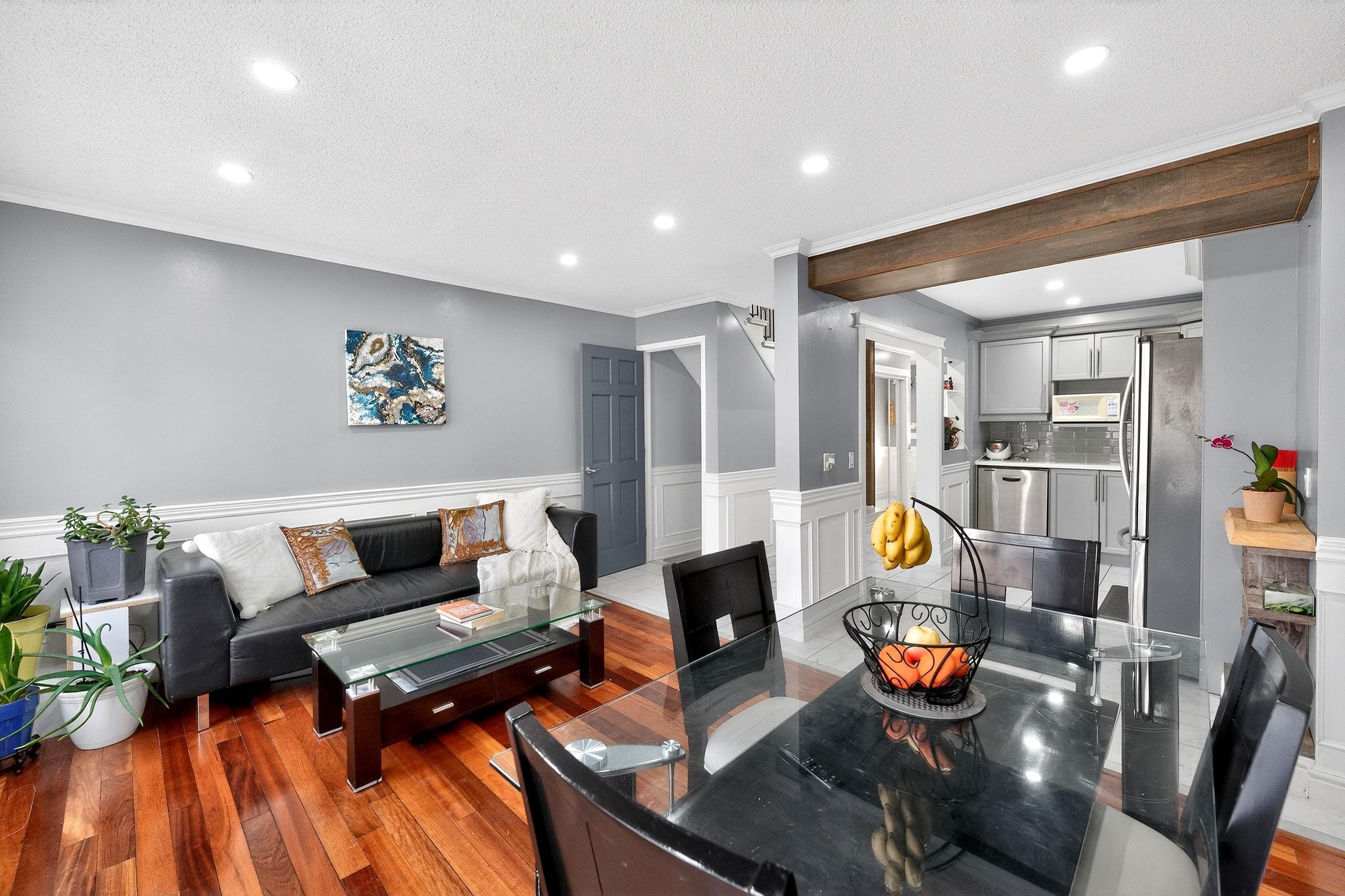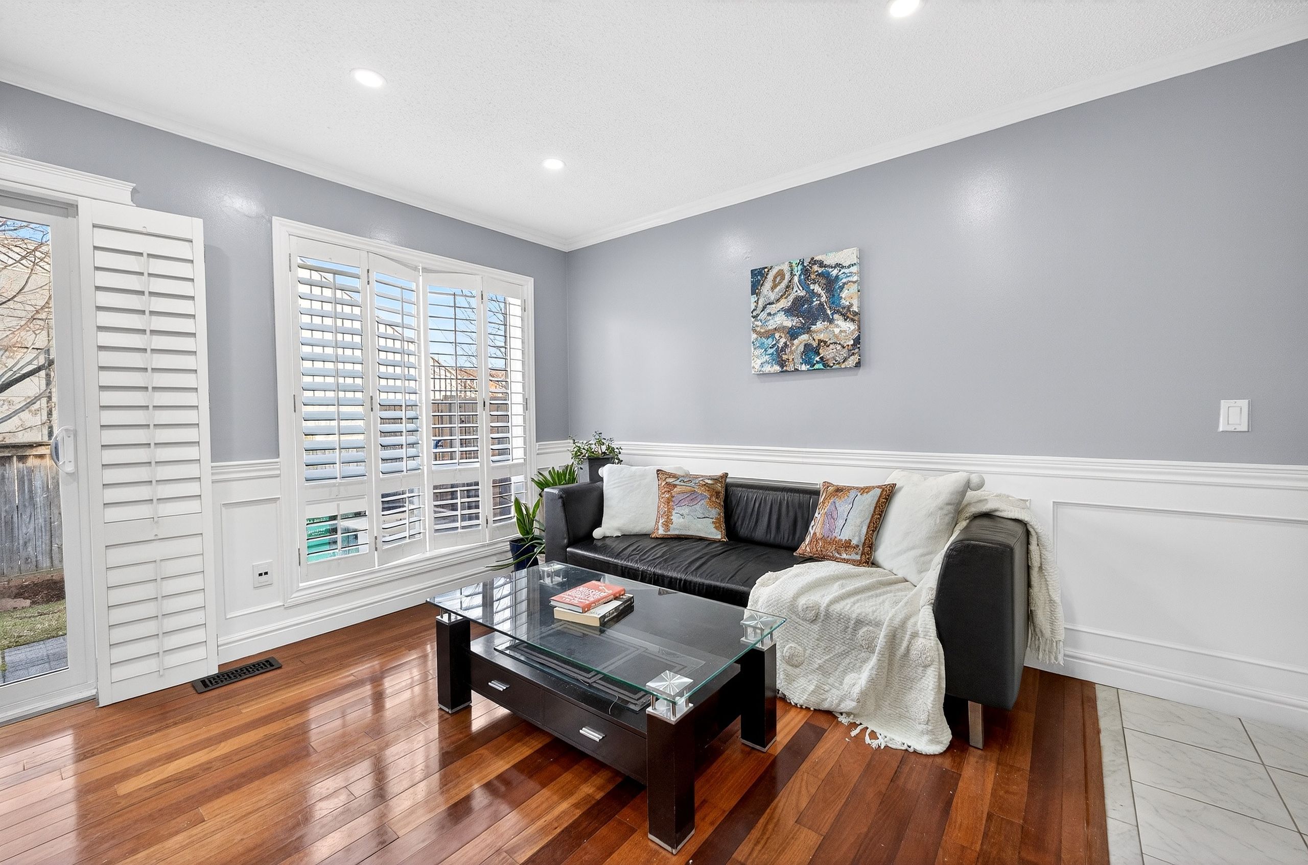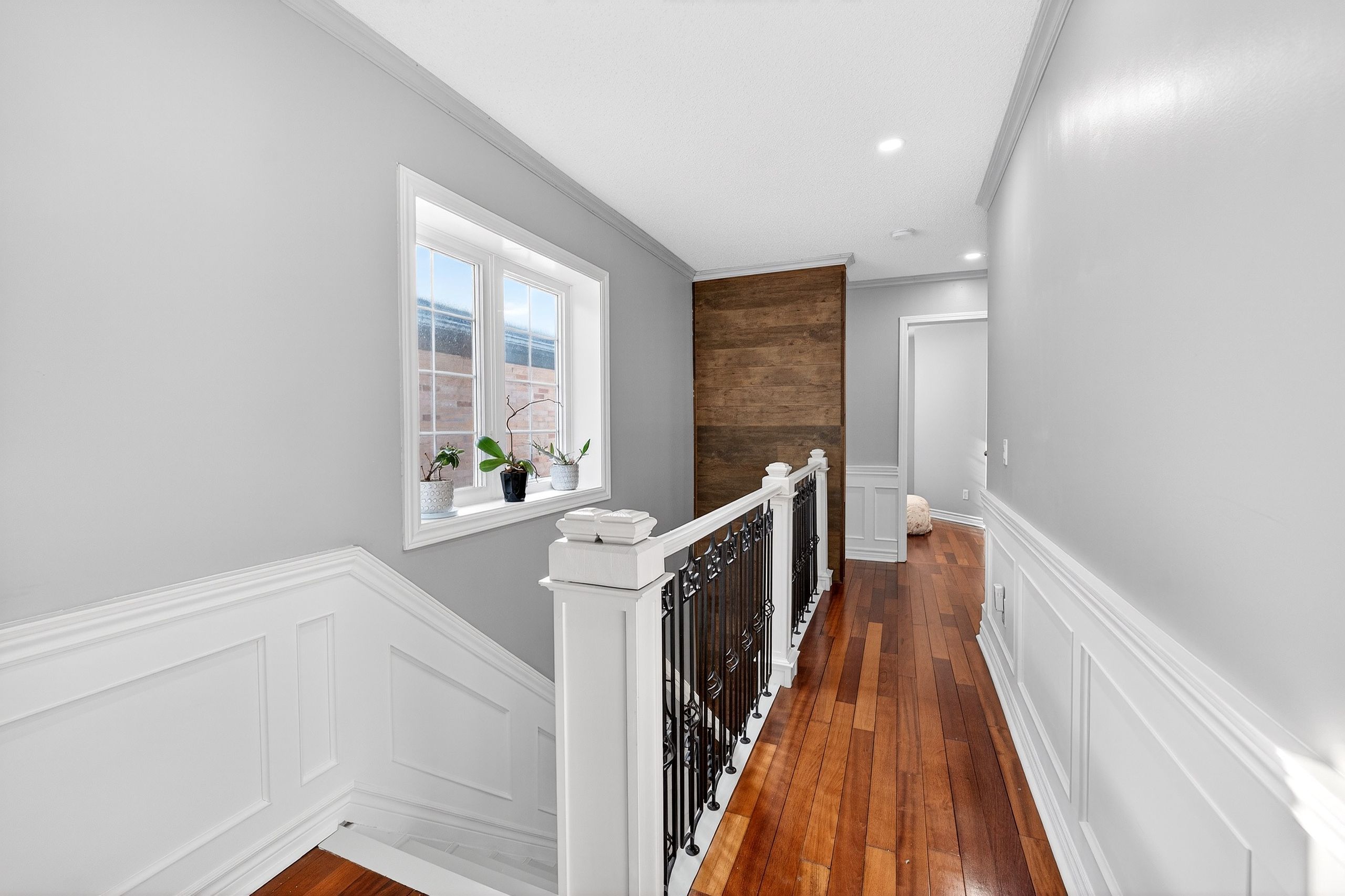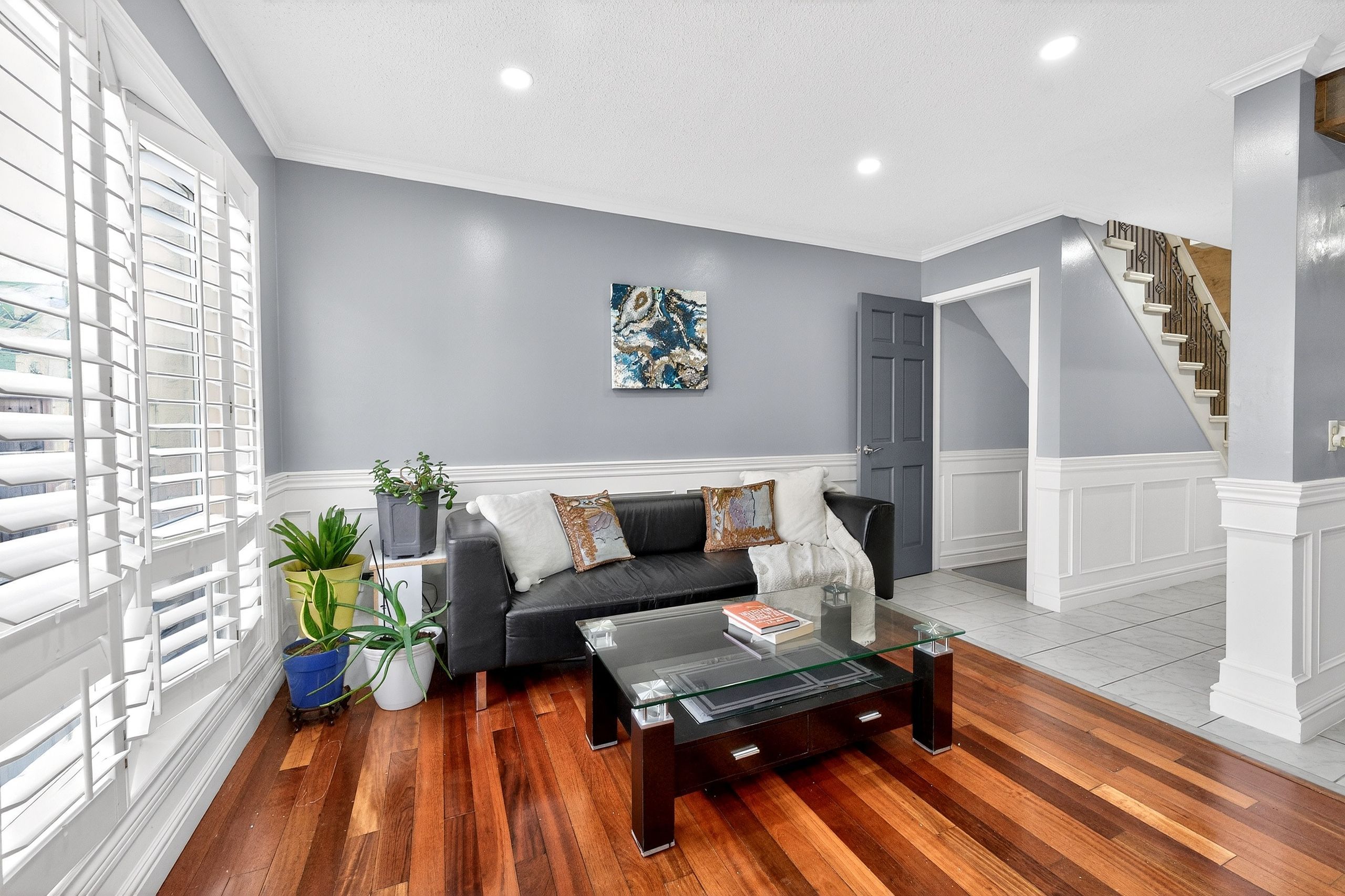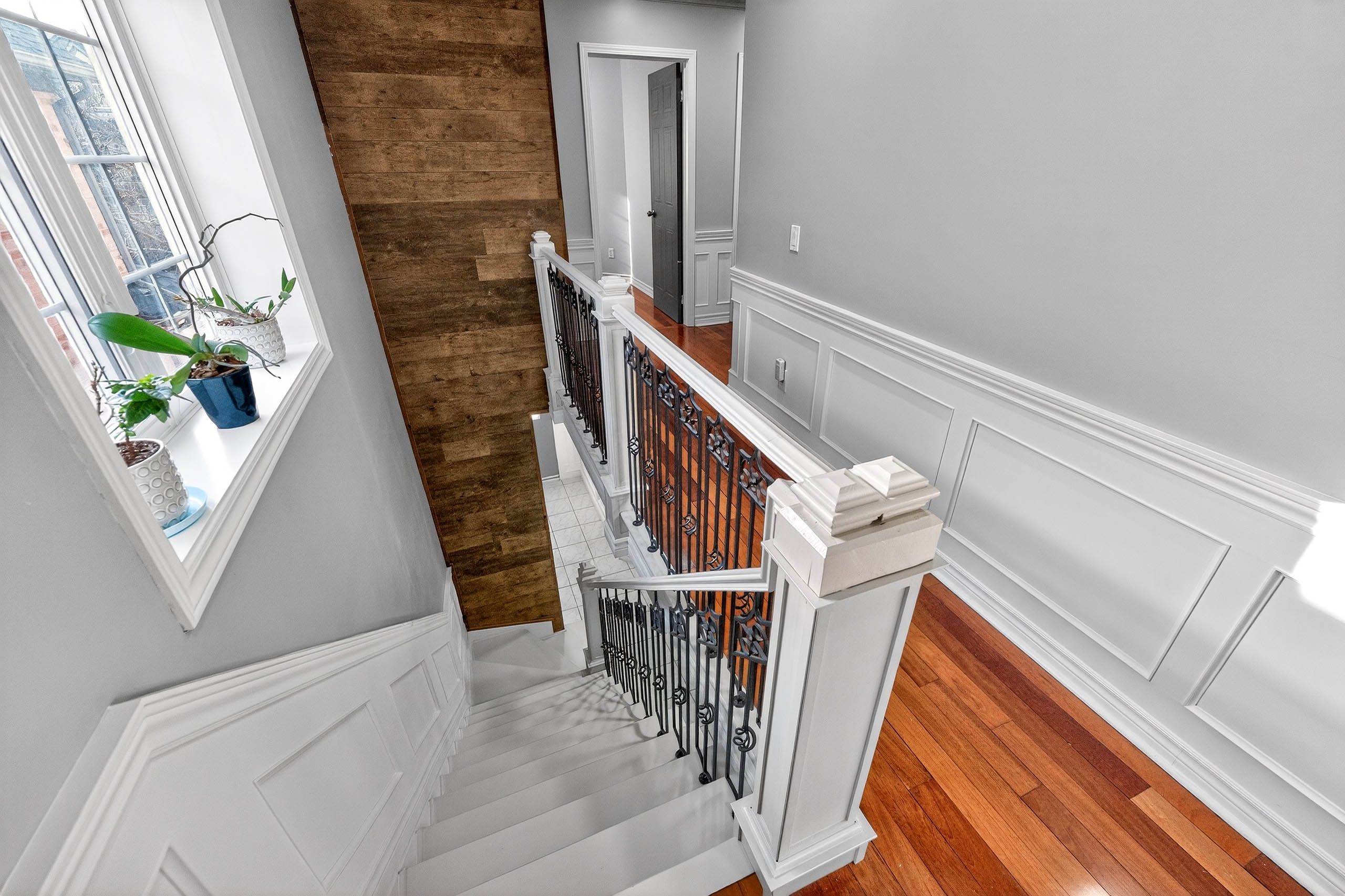 • Stylish Brazilian hardwood floors and handcrafted wainscoting throughout.