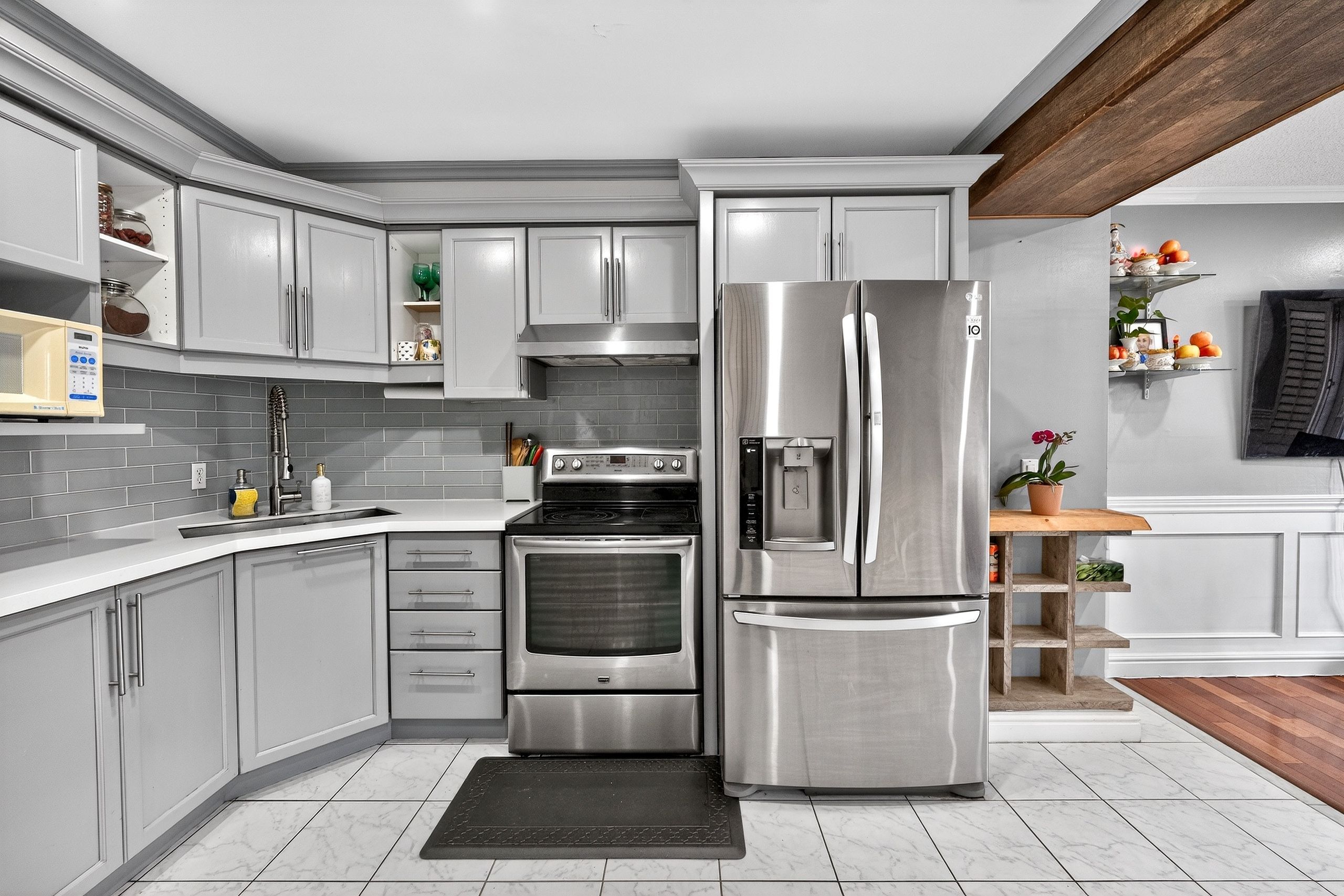 • Uniquely redesigned kitchen featuring stainless steel appliances and Corian counters.