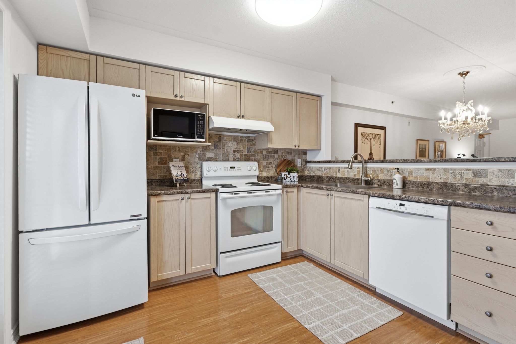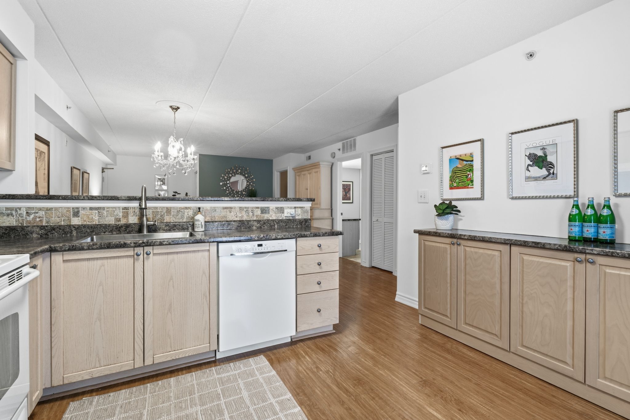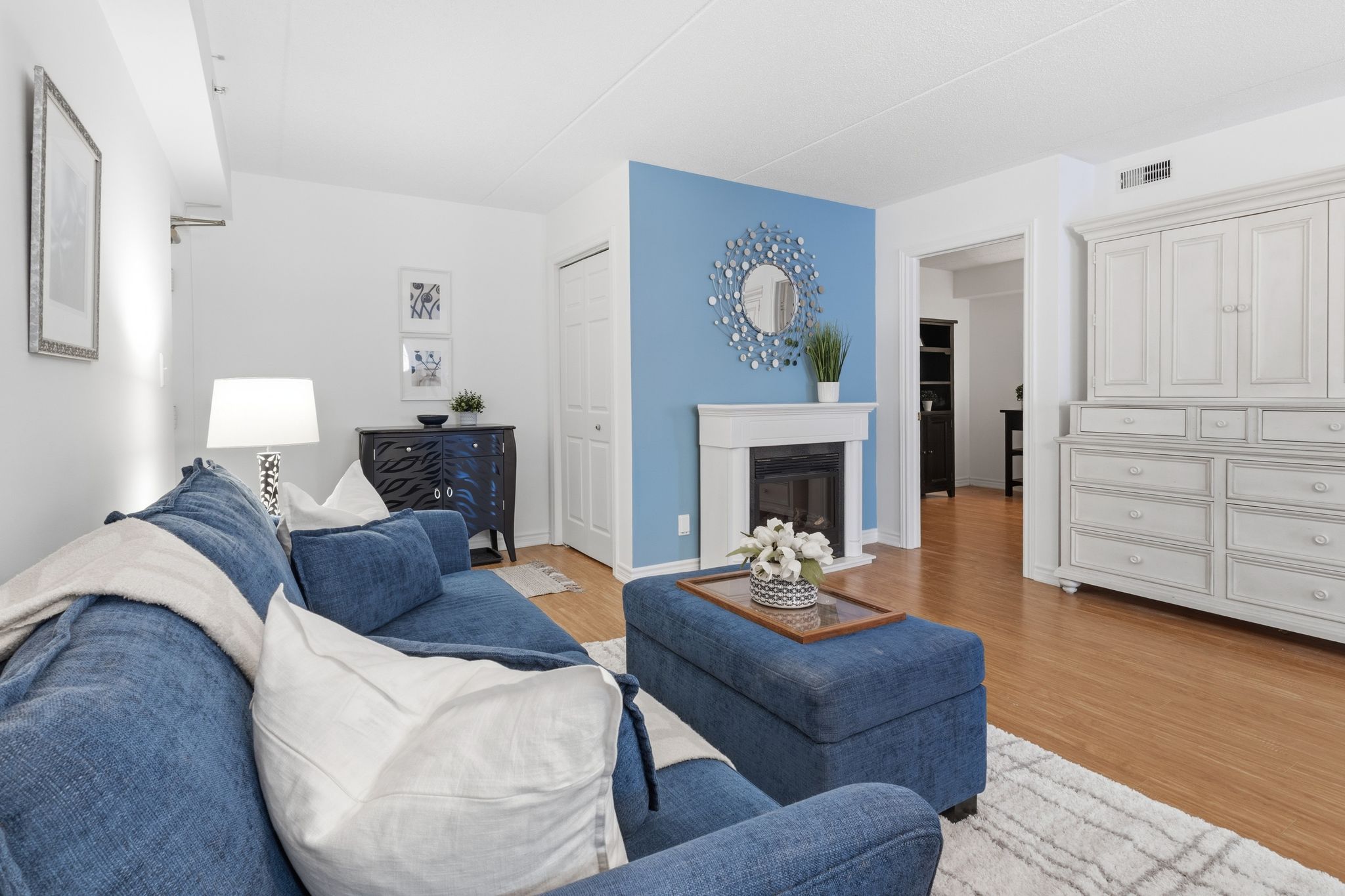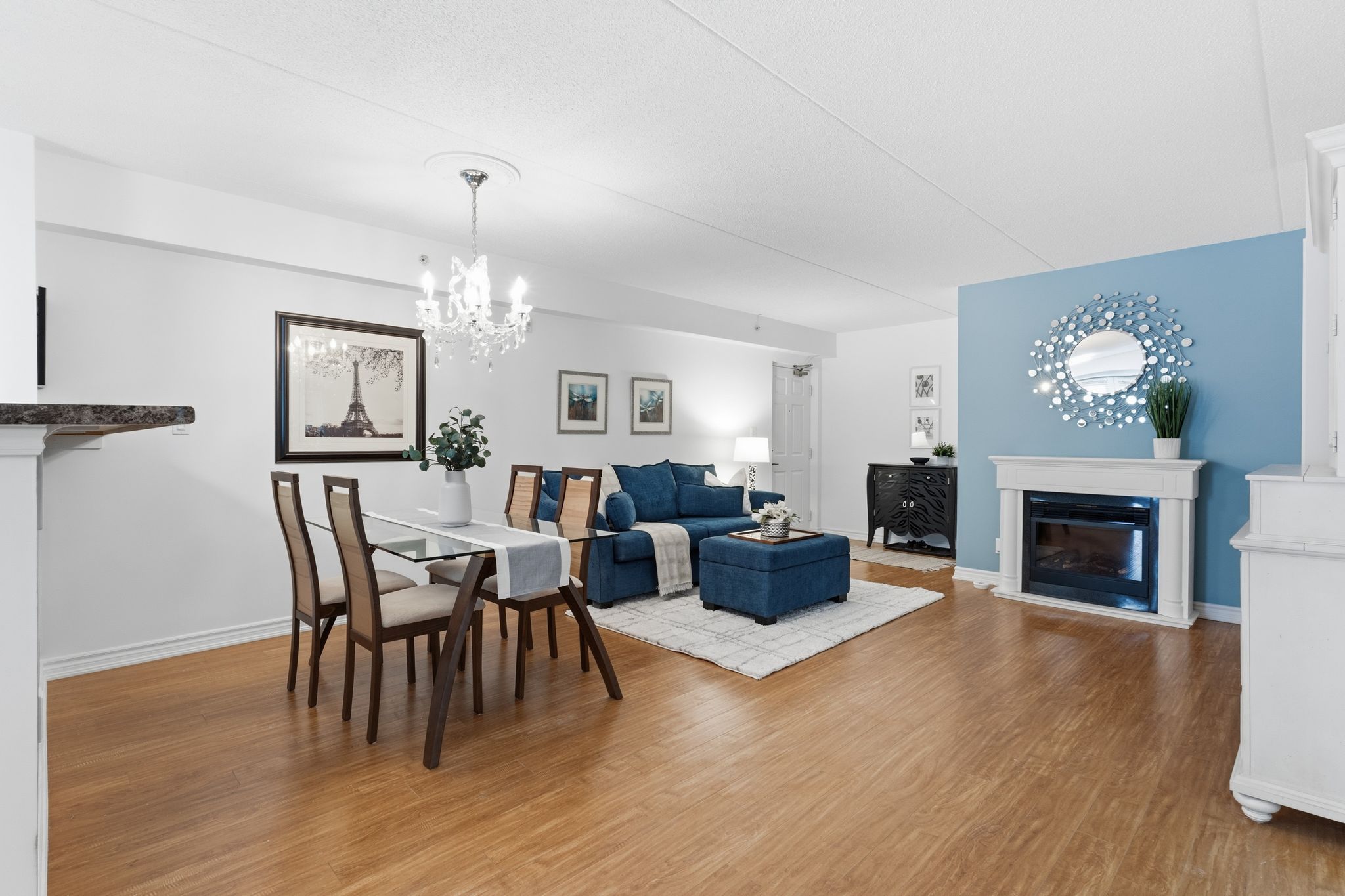 • Bright open-concept kitchen and living area with an electric fireplace.