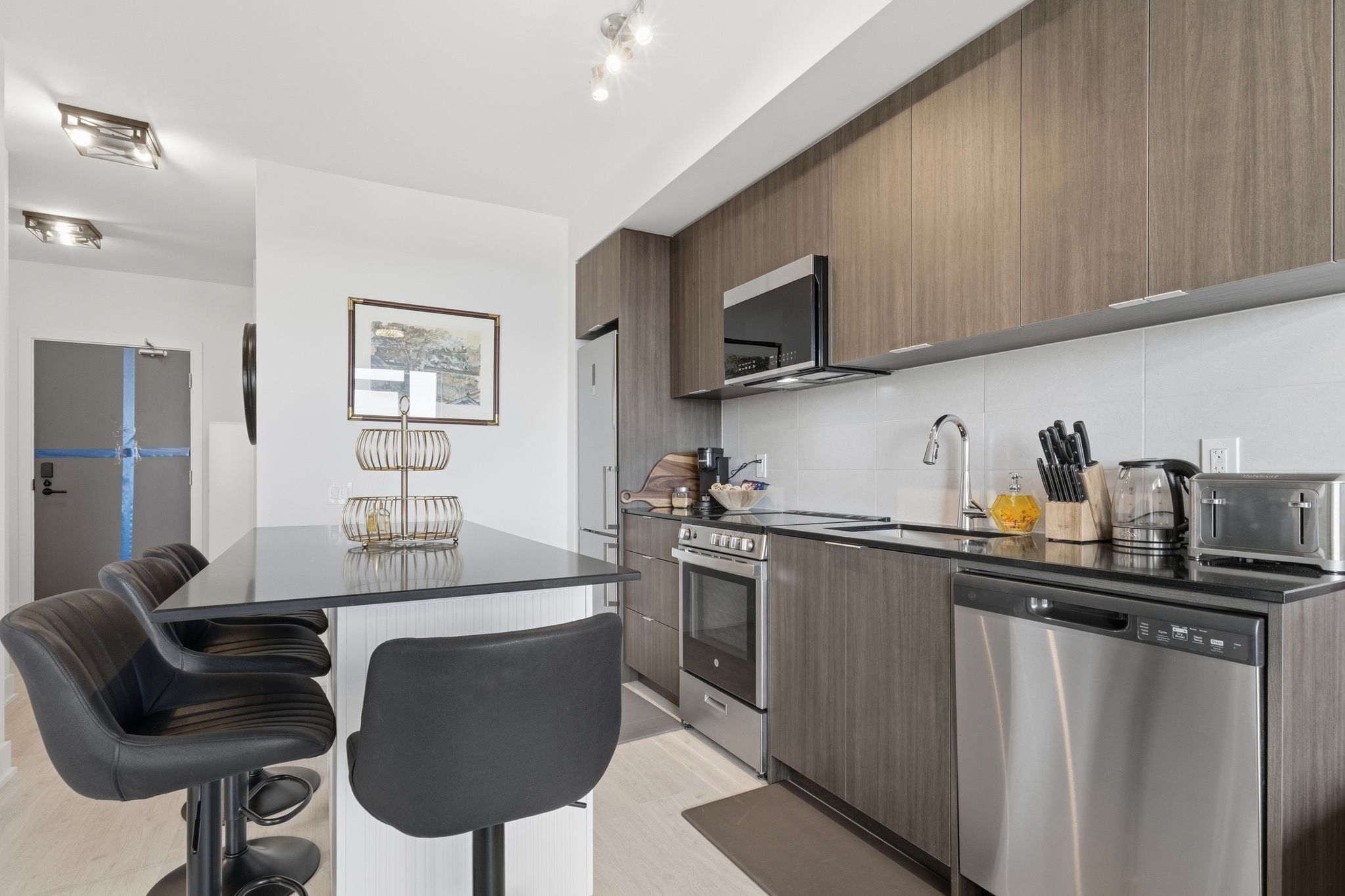 • Kitchen island seats four, with all new stainless appliances.