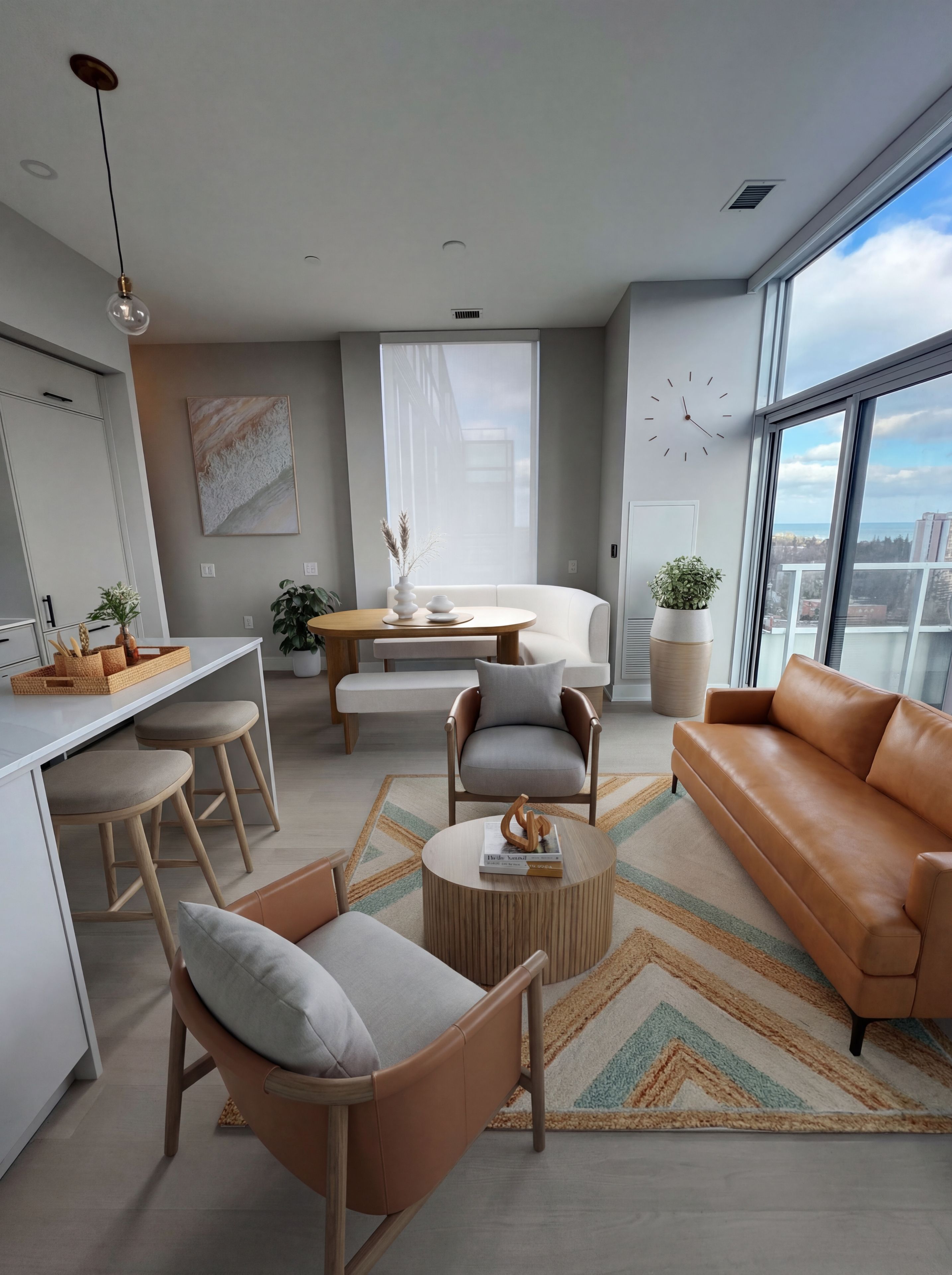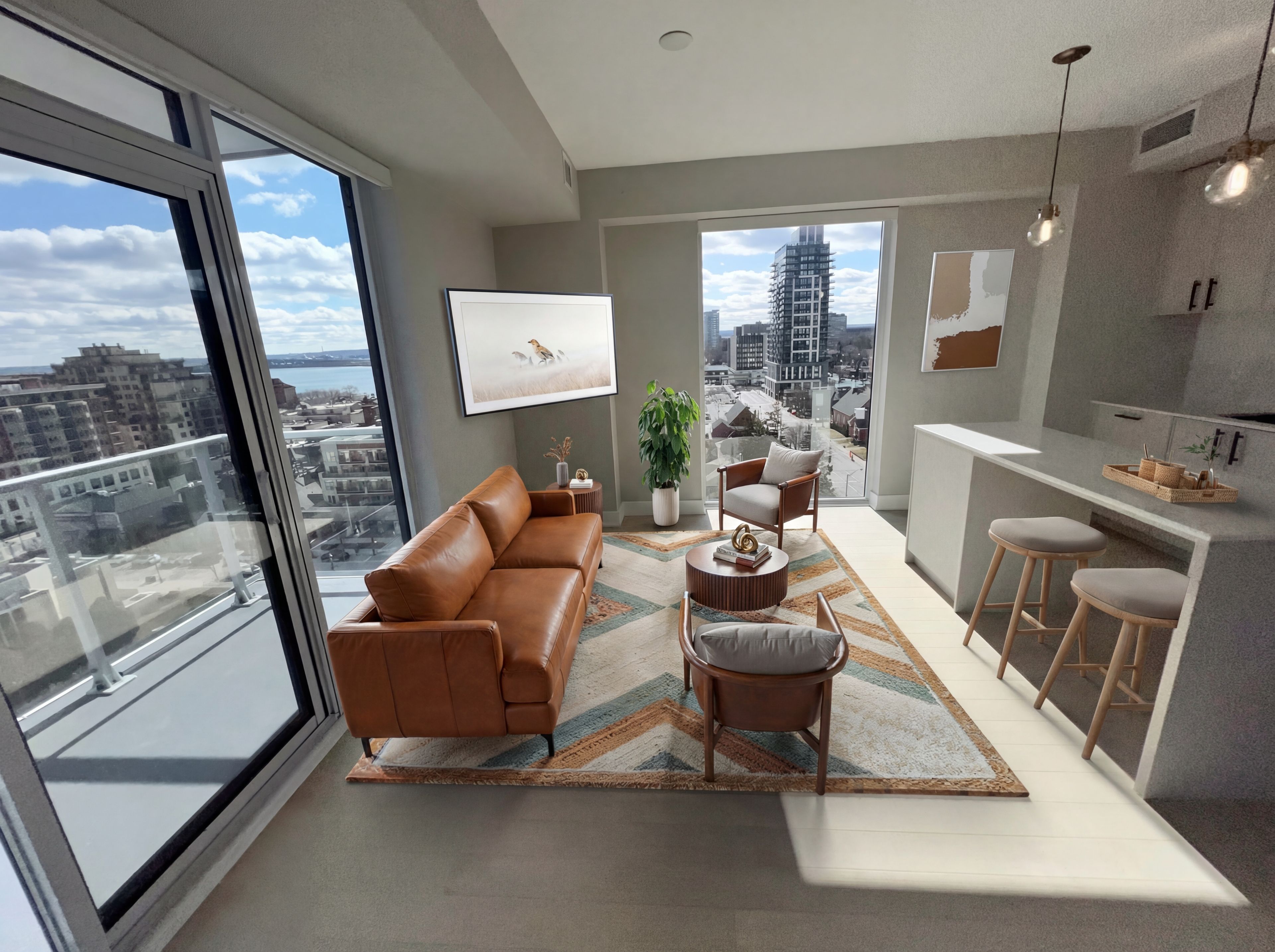 Welcome to elevated living in the heart of downtown burlington. This brand-new, stunning boutique building offers a rare opportunity to lease a sophisticated corner suite spanning nearly 1,000 square feet. Thoughtfully designed, this 2-bedroom plus den, 2-bathroom home features stunning south exposures with beautiful views of lake ontario. Expansive 10-foot ceilings flood the space with natural light, highlighting the open-concept layout. The designer kitchen is outfitted with professional-grade appliances and premium finishes, perfect for both everyday living and entertaining. Window coverings include high-end remote-controlled roller shades, upscale upgrades throughout, and a balcony with a million-dollar view of lake ontario. This property includes one parking space with an electric vehicle charger and one locker. Residents enjoy access to exceptional amenities, including a fitness centre, lounge/party room, dog washing station, an outstanding rooftop terrace equipped with bbqs, and more. Ideally located just steps to the waterfront, dining, shopping, and all that downtown burlington has to offer. This is a rare lease opportunity combining luxury, lifestyle, and convenience. Please note: pictures have been virtually staged and are a combination of unit 1108 and 1308, which have identical layouts (1308 has higher ceilings and 1108 has floor-to-ceiling windows).