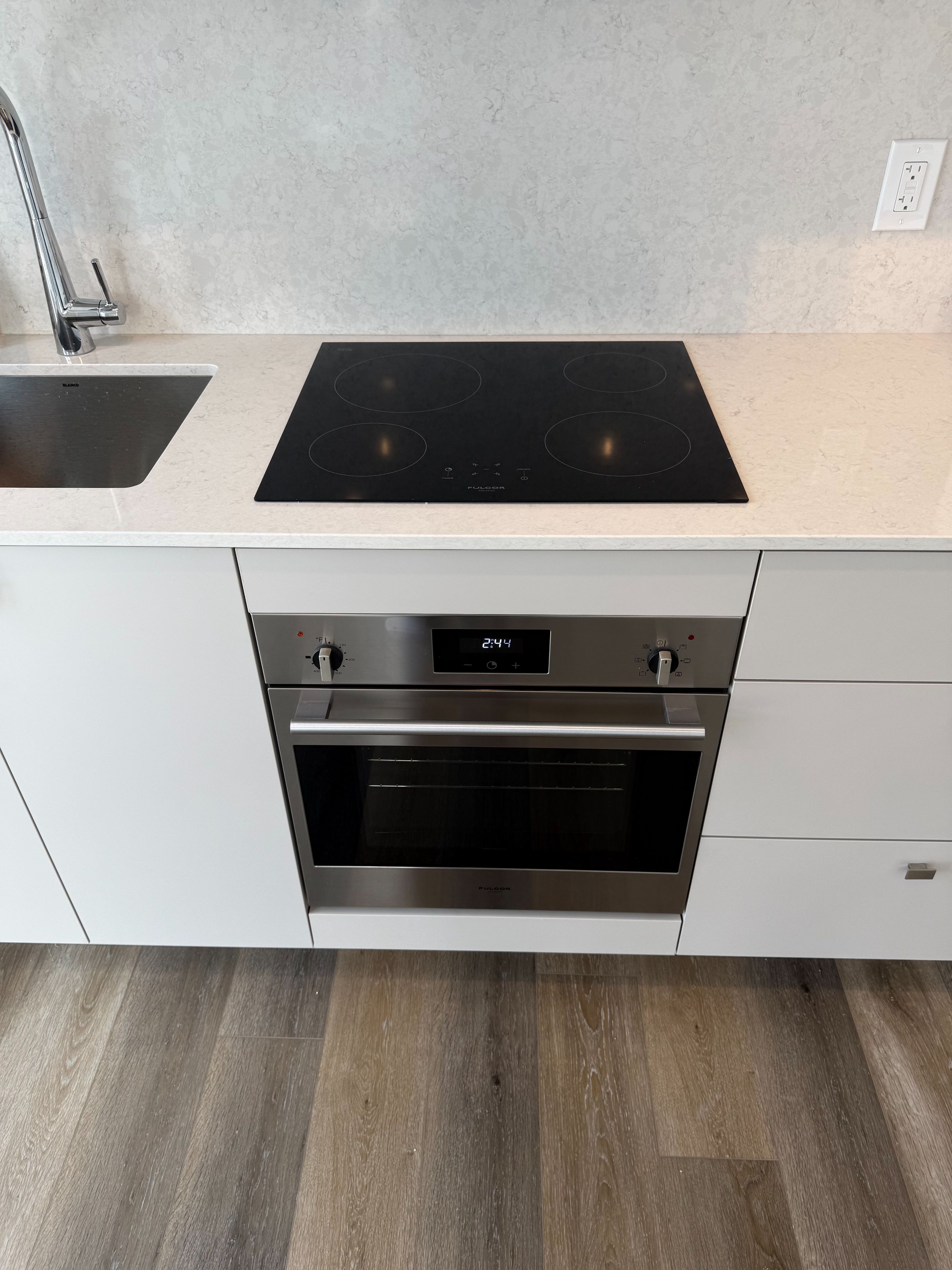 • Sleek kitchen featuring integrated appliances and LED pot lights.