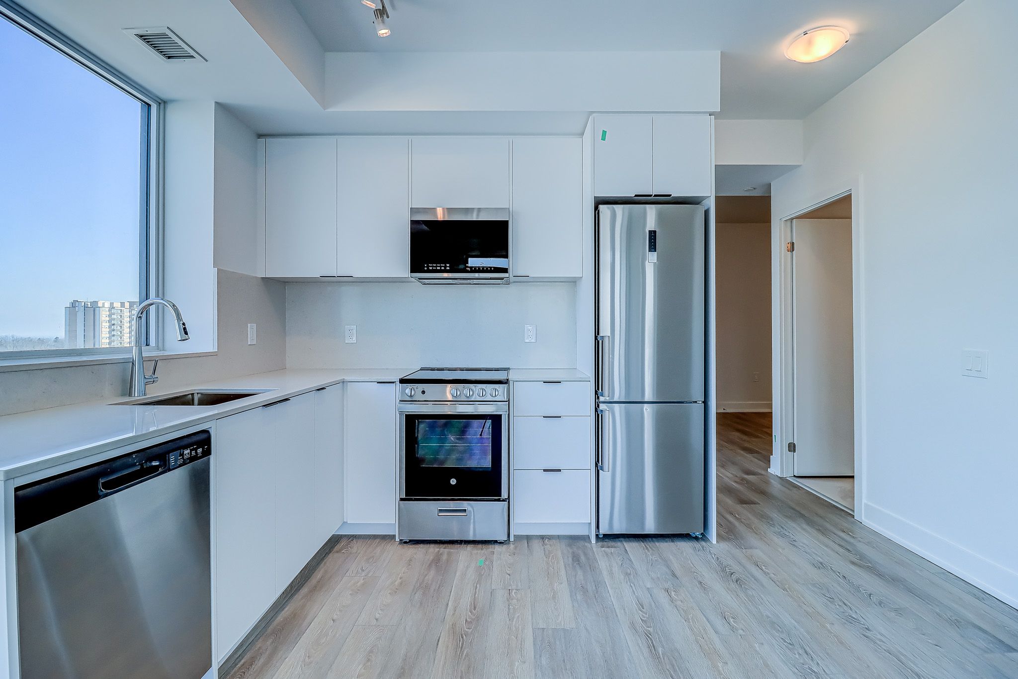 • Modern kitchen with upgraded appliances, quartz counters, and beautiful lake views.