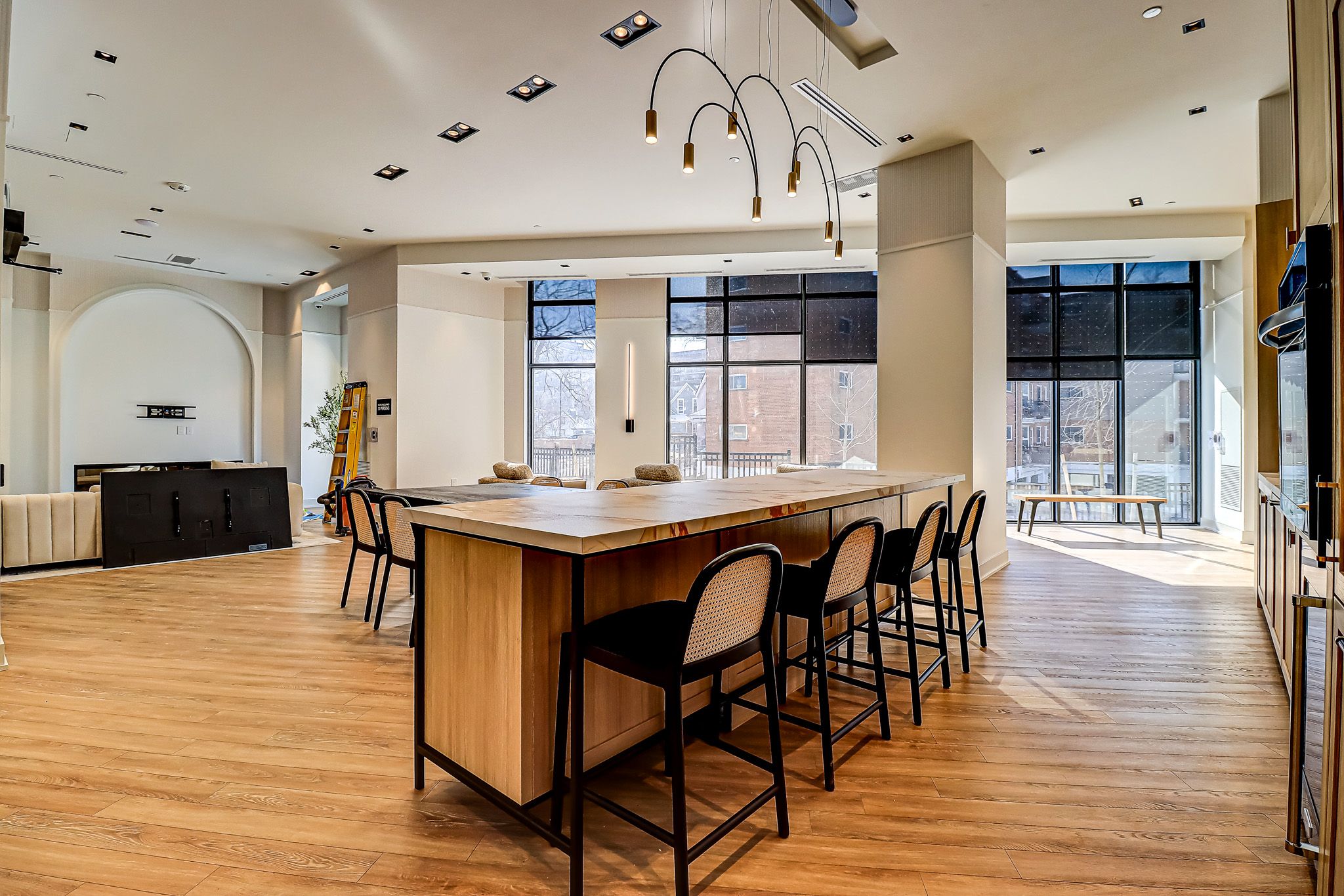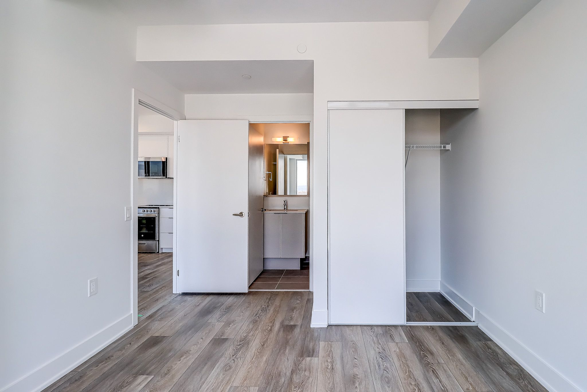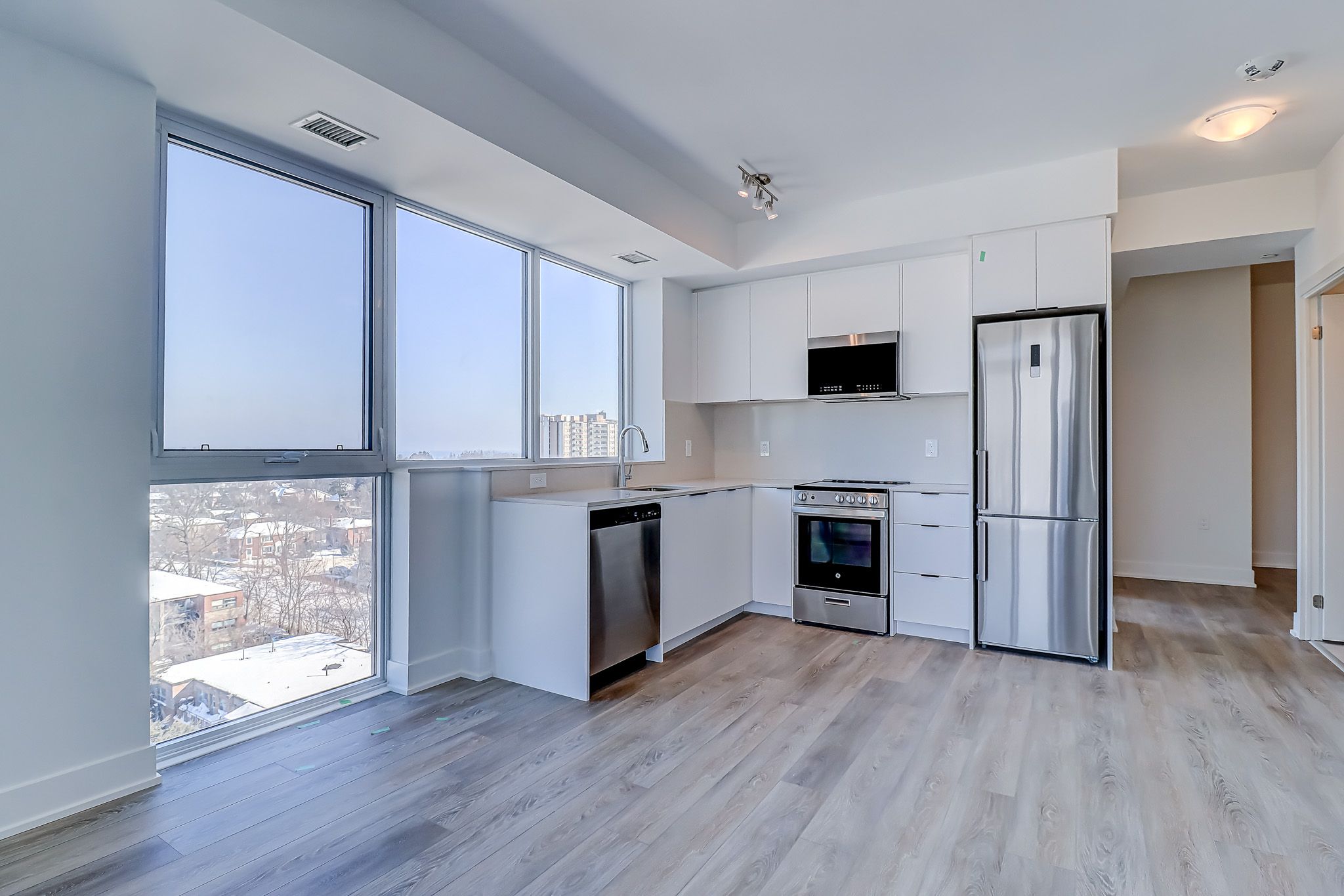 • Building amenities include a fitness center, co-working lounge, and rooftop garden.