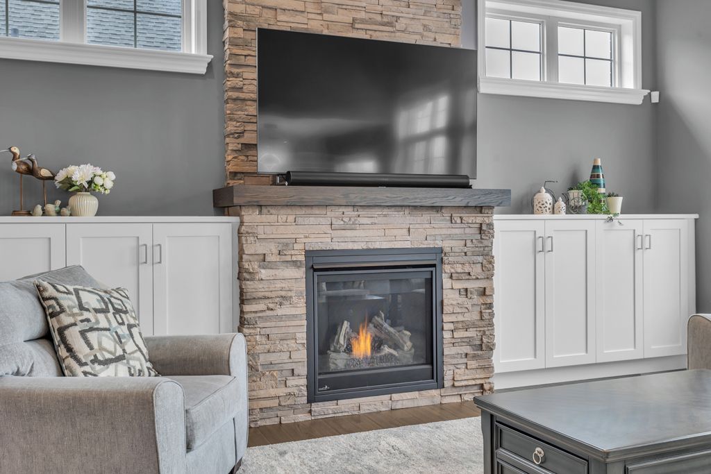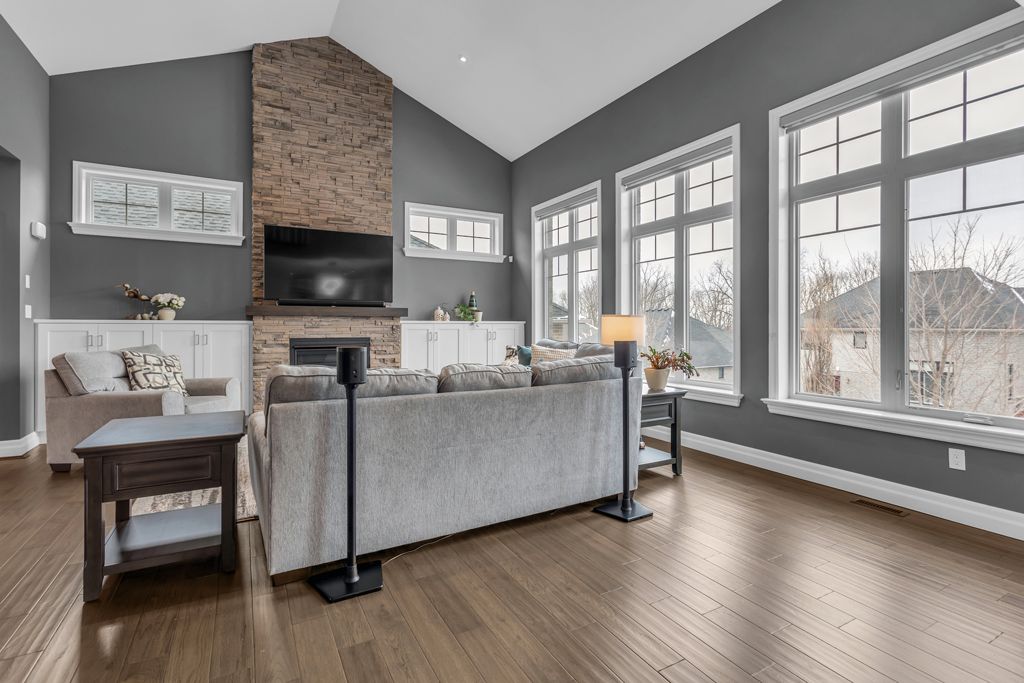 • Open-concept main floor with cathedral ceiling and gas fireplace.