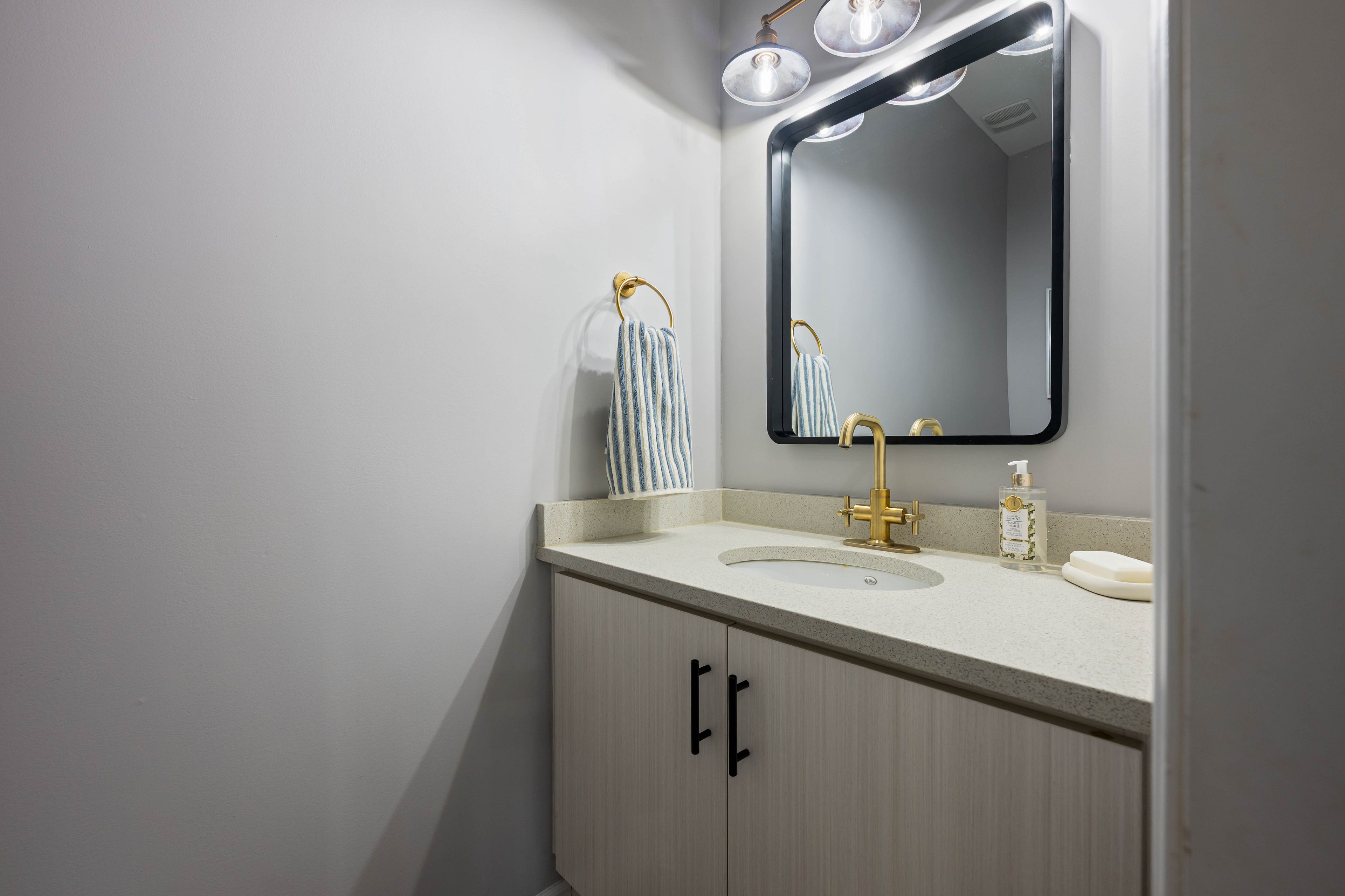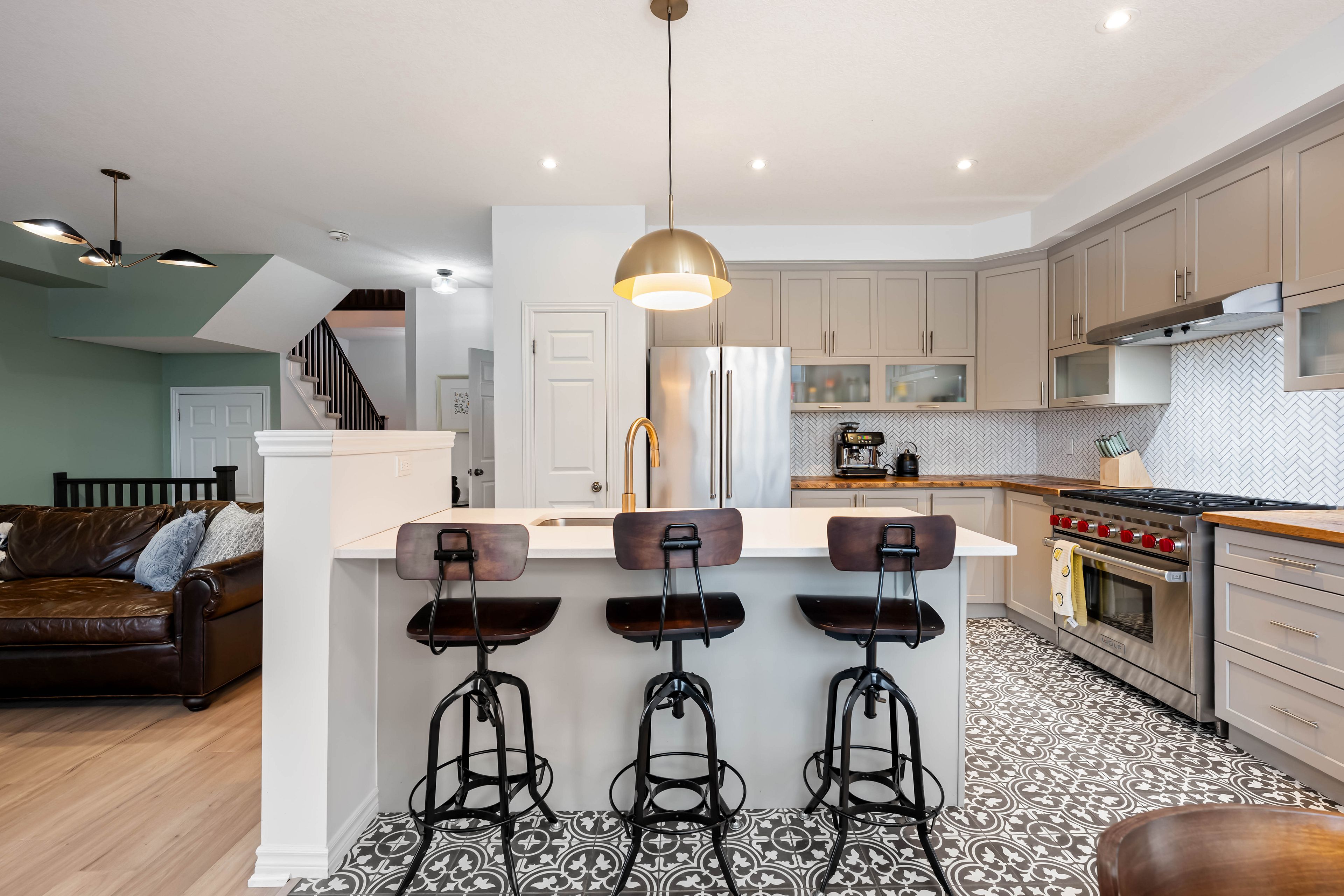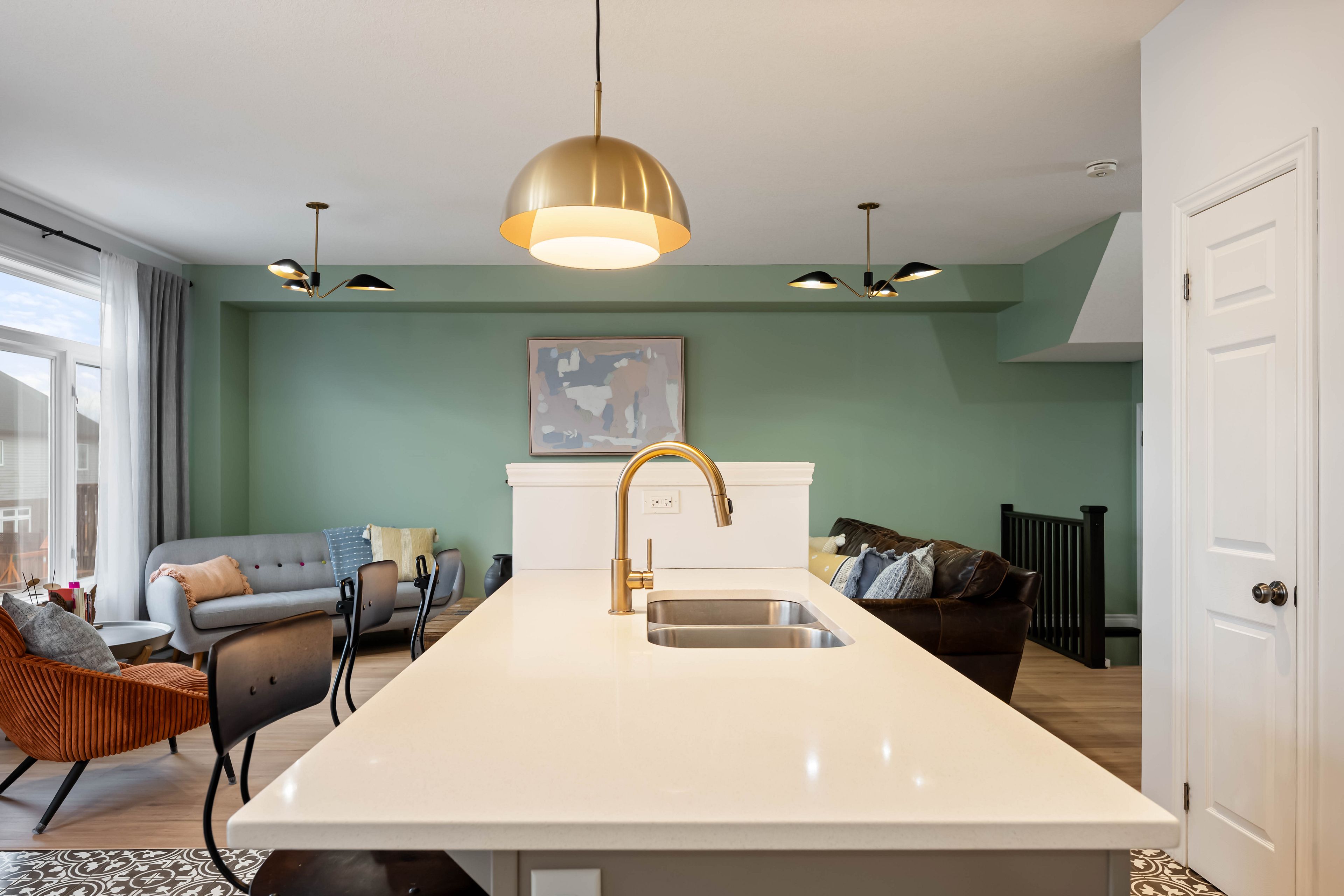 • Chef's kitchen with premium appliances and spacious quartz island.