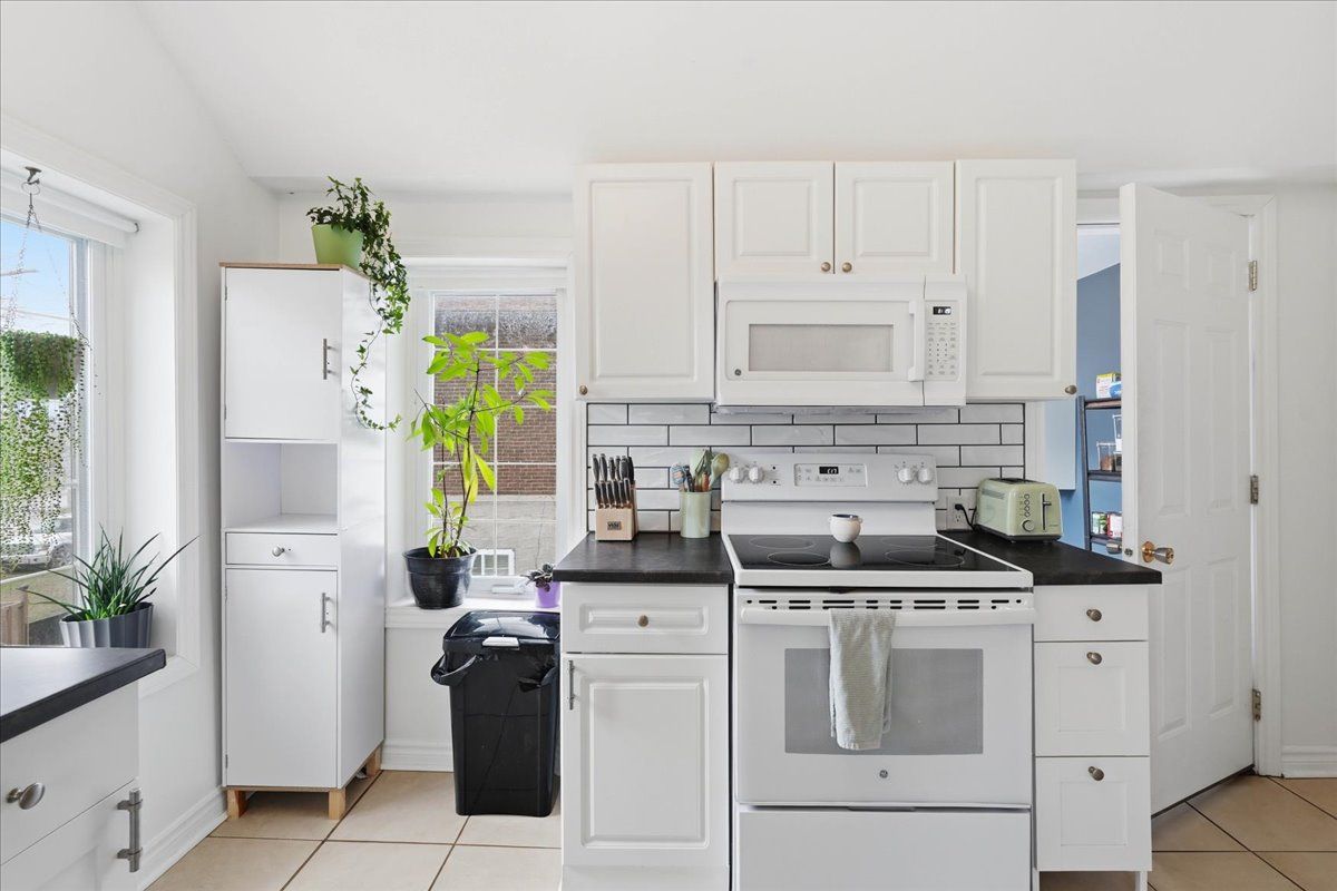 • Clean kitchen with white cabinetry and modern backsplash, customizable for value.
