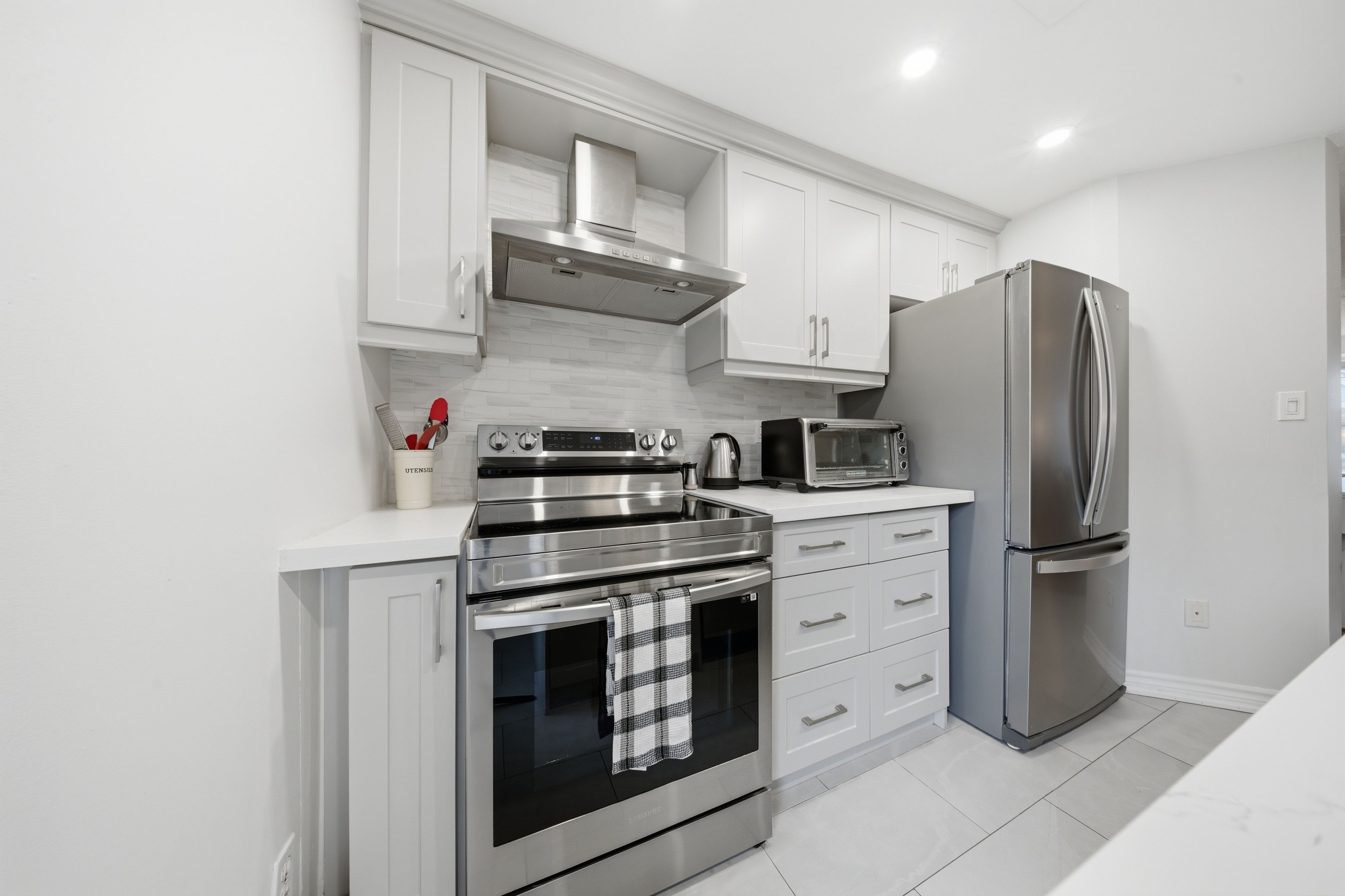 • Renovated eat-in kitchen with stainless steel appliances and built-in pantry.
