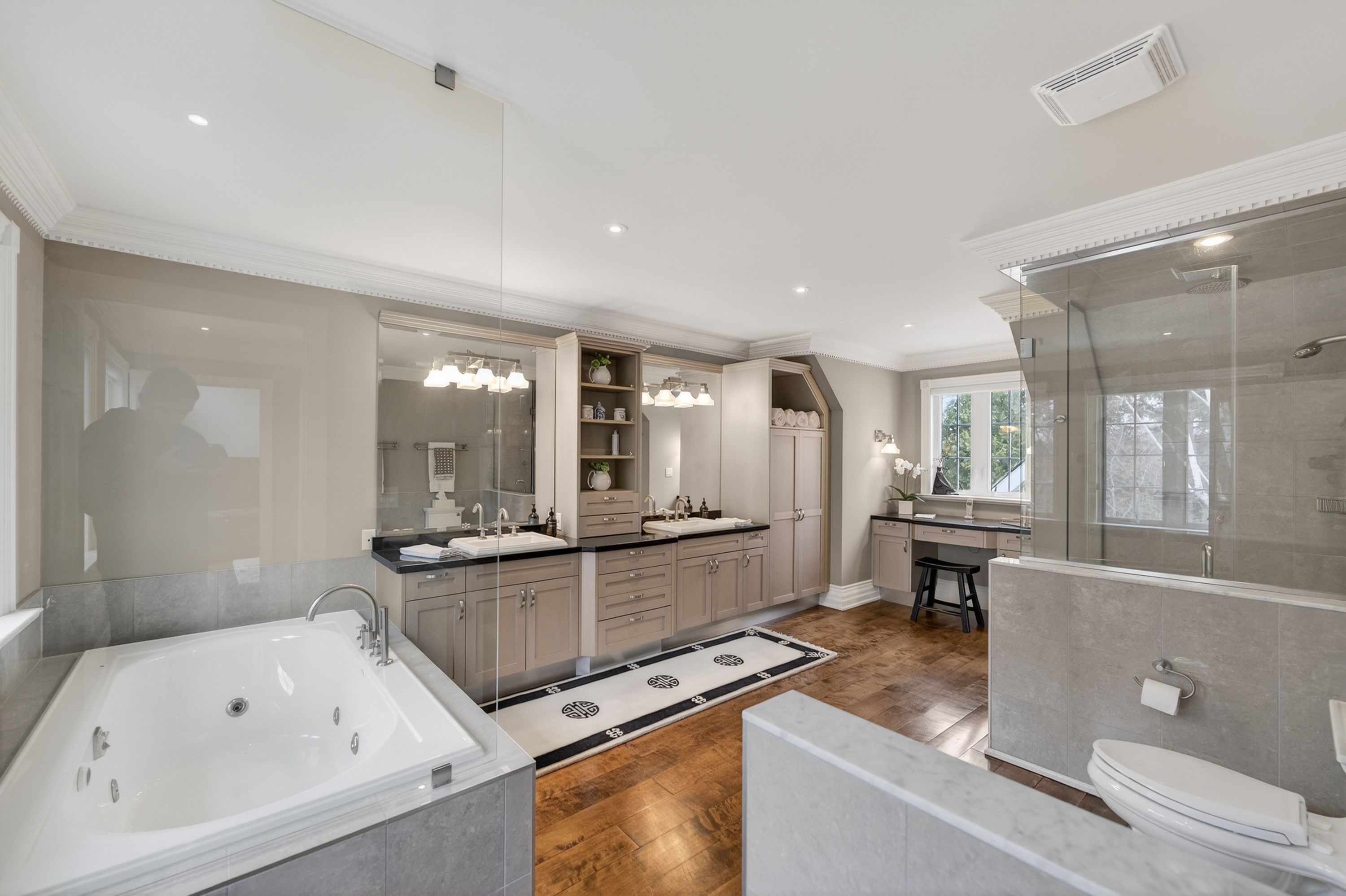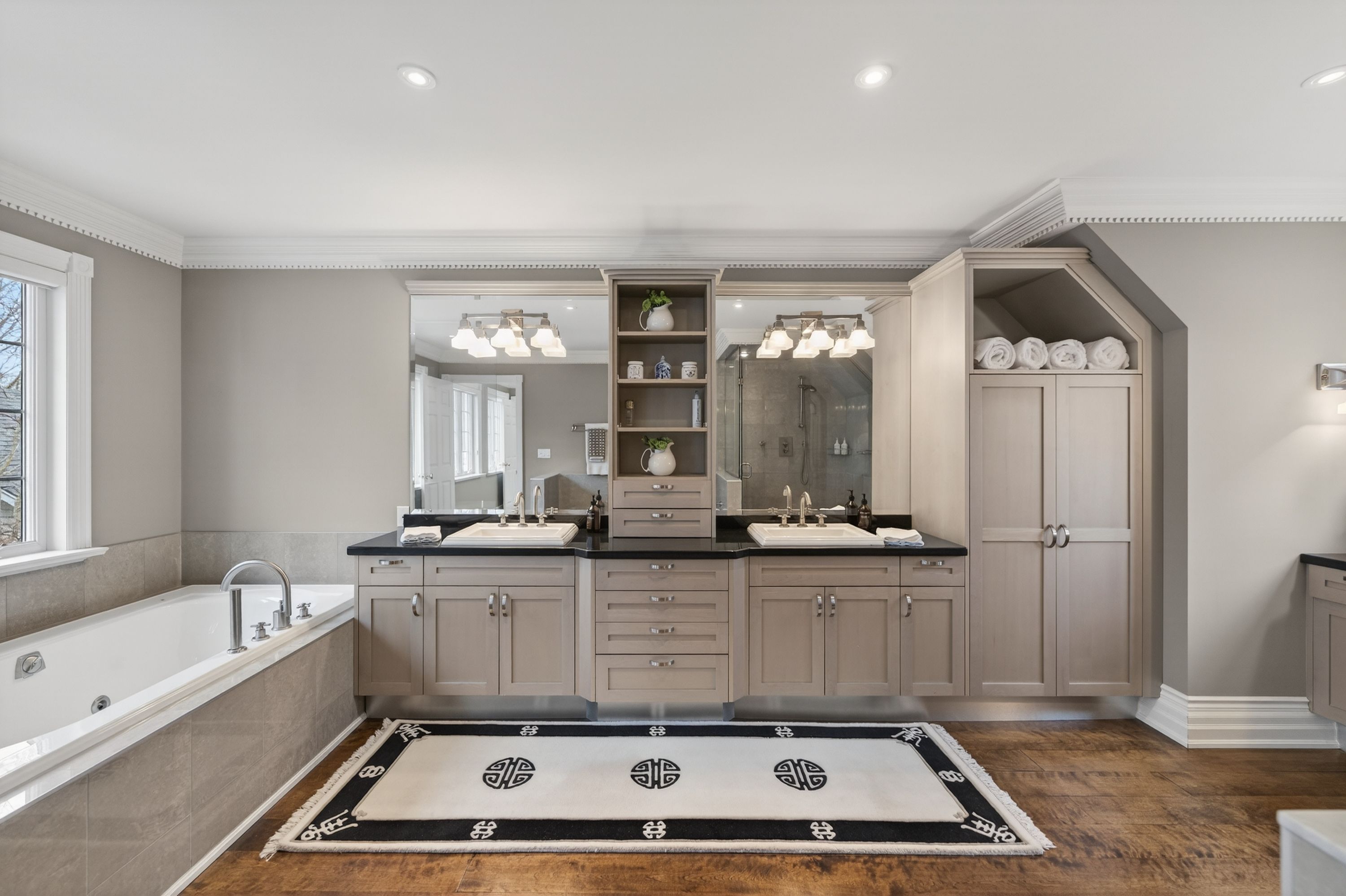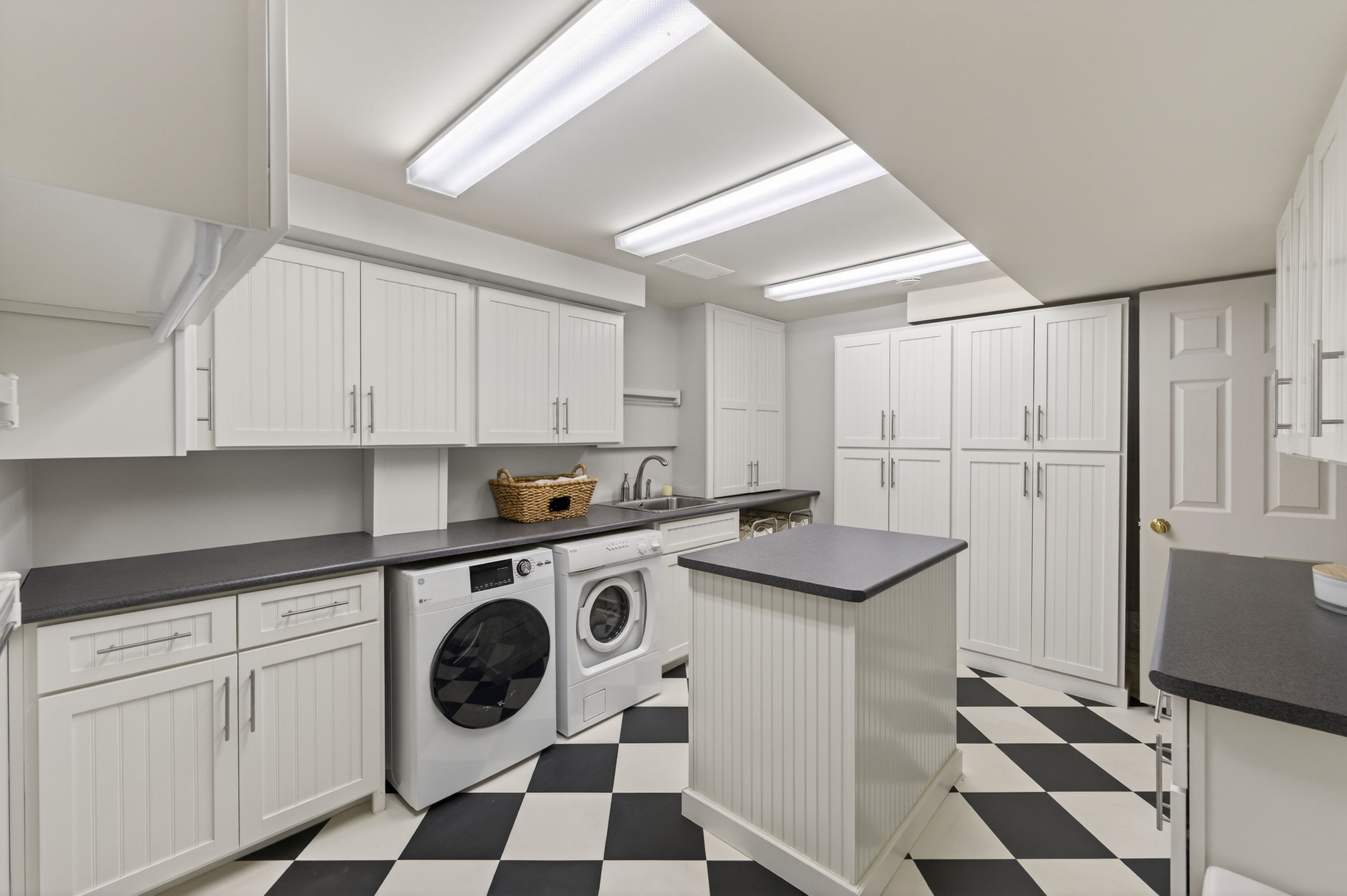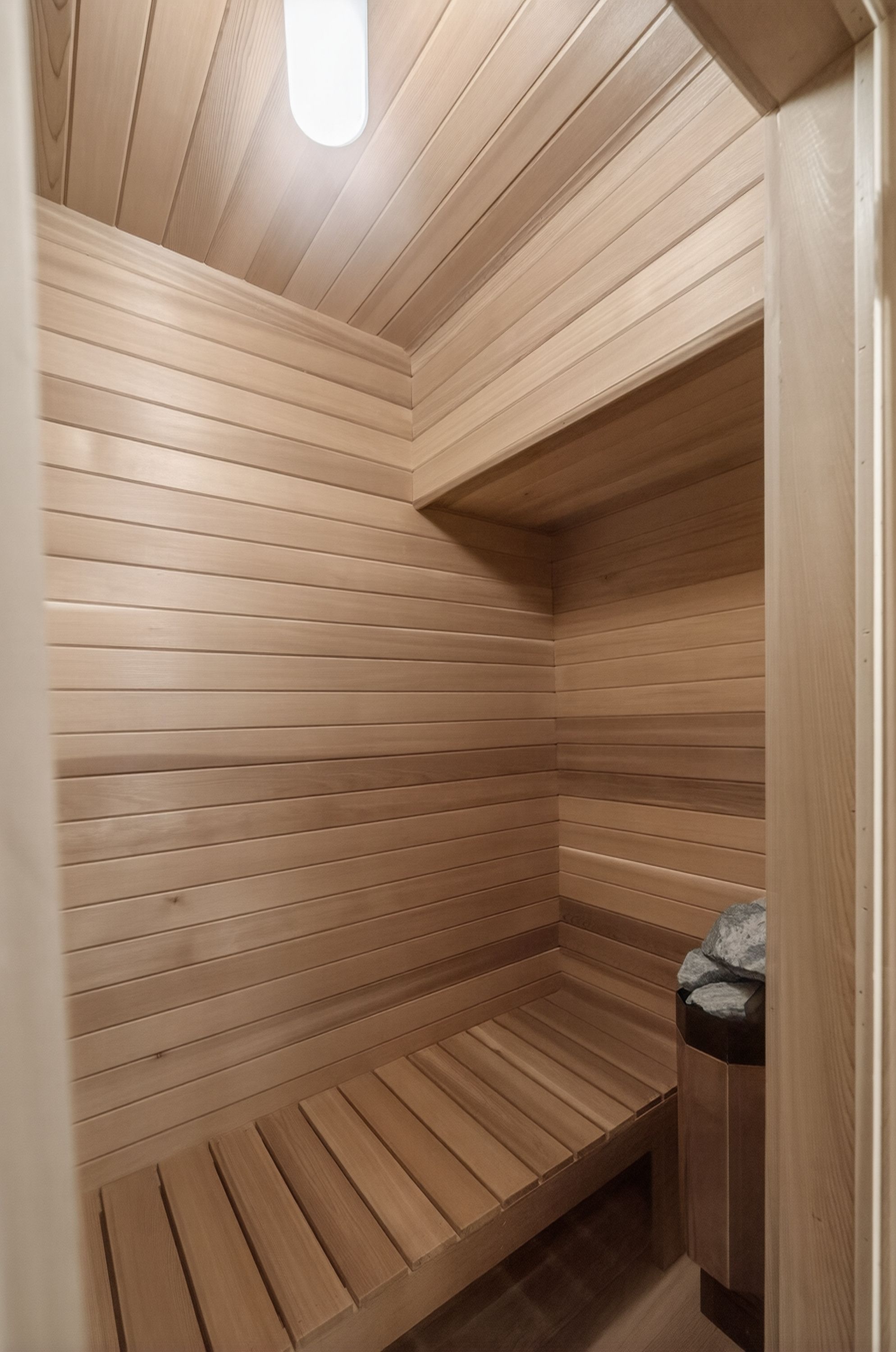 • Lower level includes media room, sauna, and wine cellar.