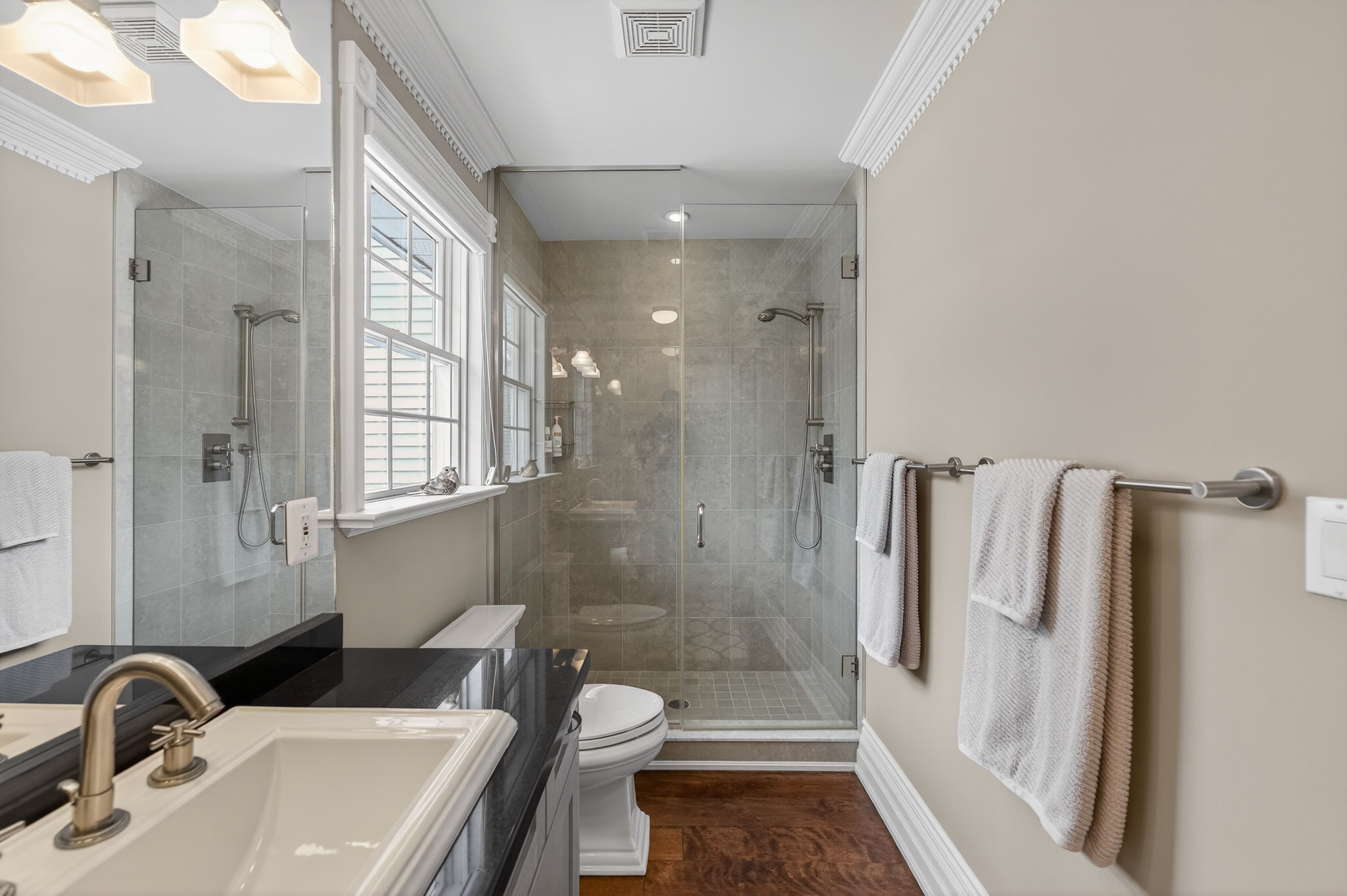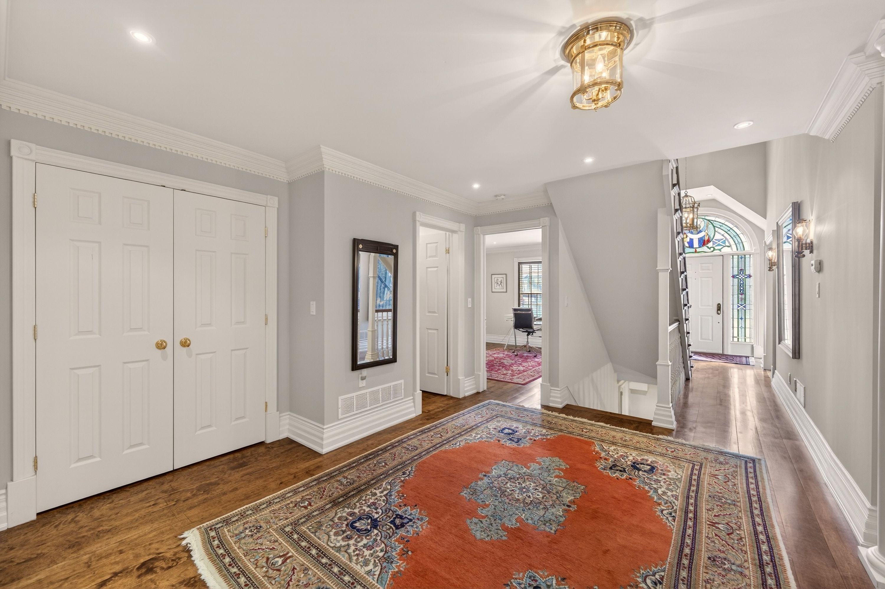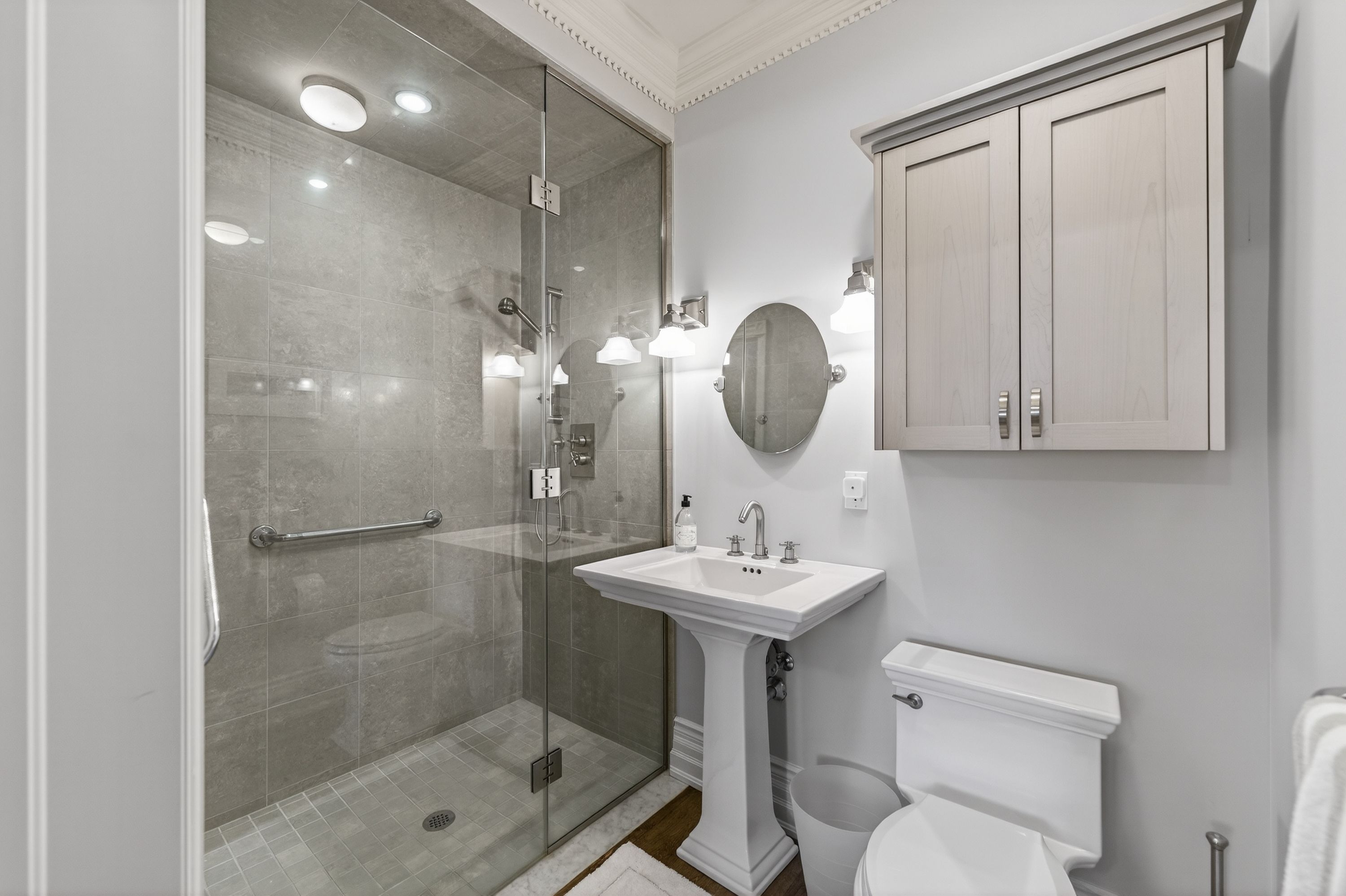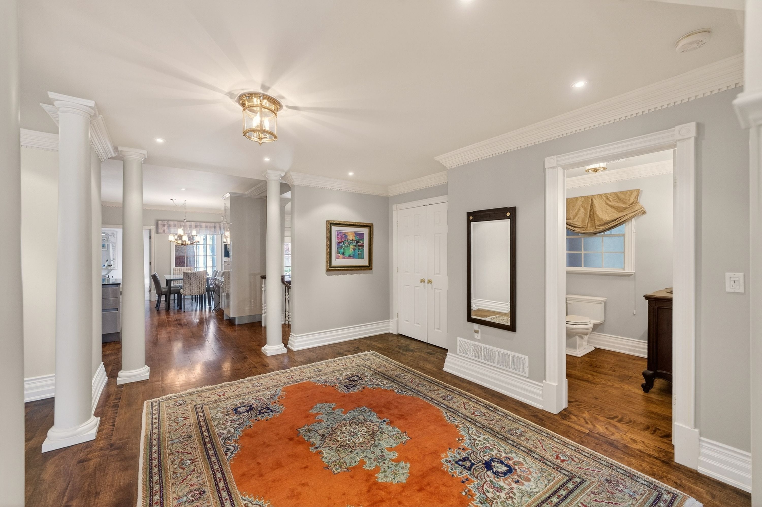 • Lower level includes media room, sauna, and wine cellar.