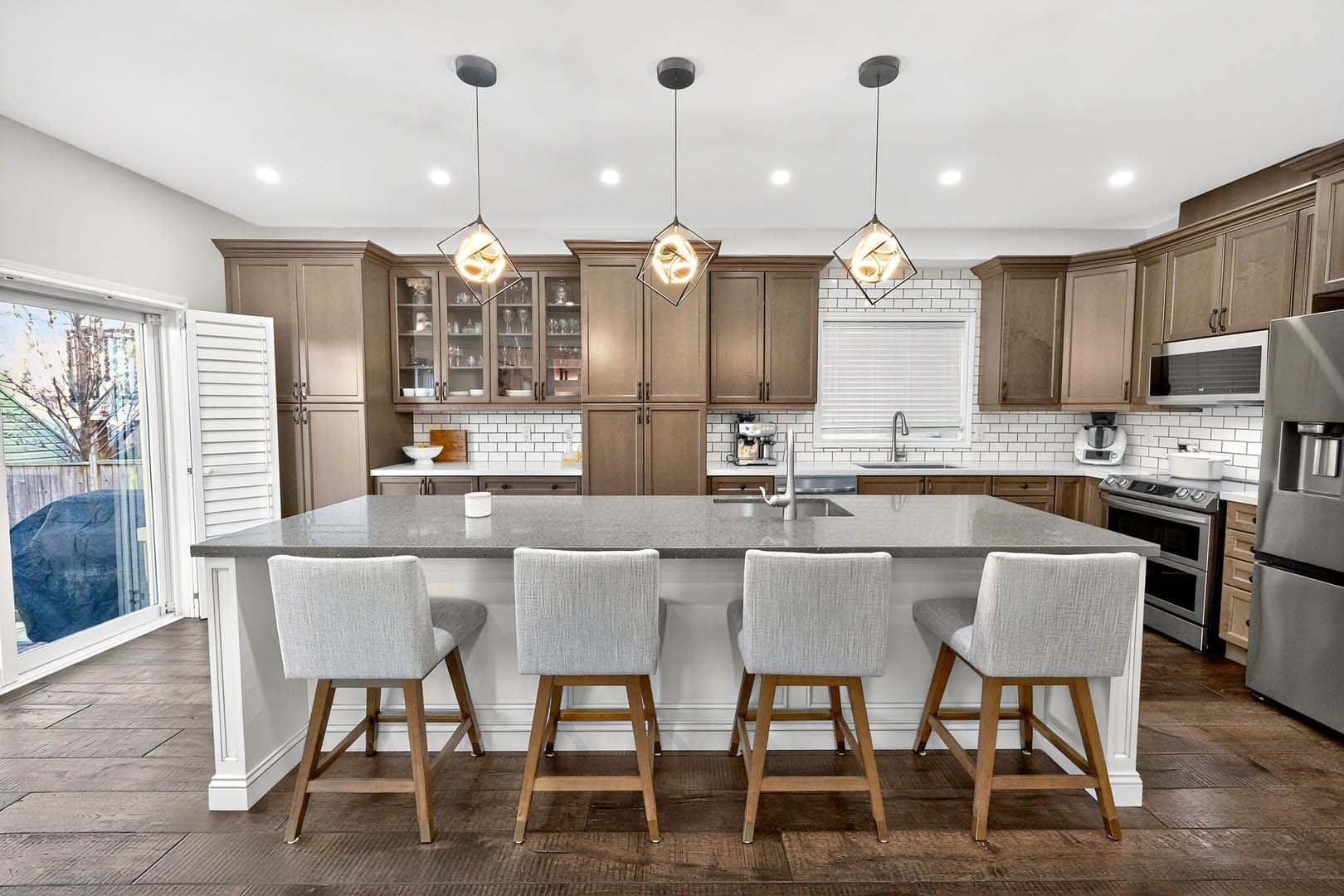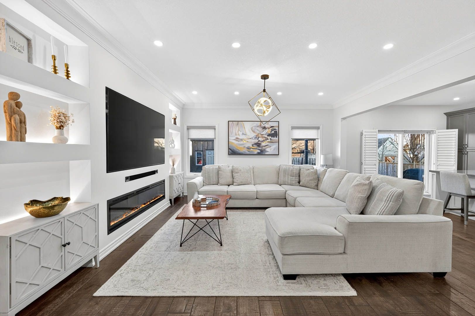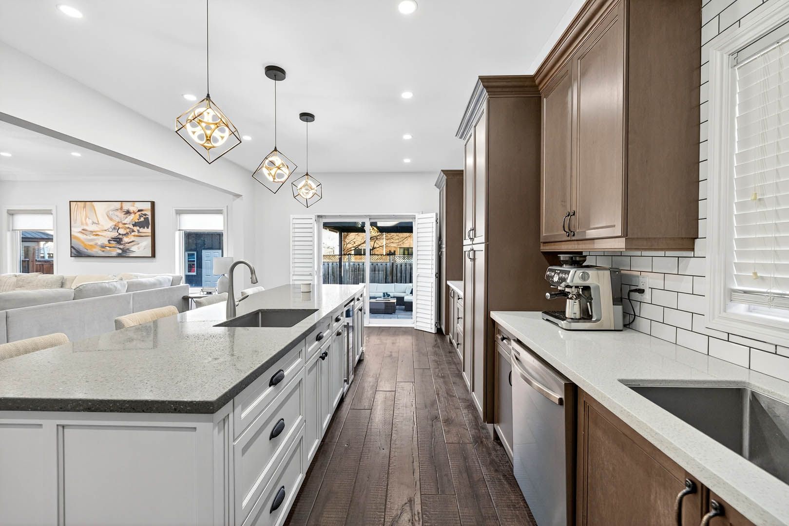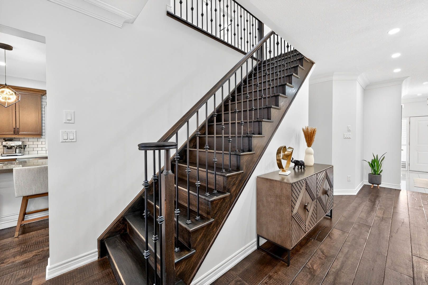 Wow!! This stunning dream home w/2628 sft, has it all!! Gourmet kitchen with quartz counter top, large living room with electrical fireplace combined with dining! You can easily picture yourself entertaining guests or enjoying family meals at the impressive 10-inch island breakfast table, while the abundance of pot lights illuminates. Custom finished wide plank rich & rustic hardwood floor, crown mounding spectacular primary bedroom with oversize bathroom and a spacious w/i closet. Beautiful double car garage finished with epoxis. Legal basement apartment w/ 2 bedrooms, kitchen, in-suite laundry, open concept living and dining room and separate entrance. Amazing backyard with new shed, new stones and new pergola to entertain. Walking distance from schools, shopping areas, restaurants, library and recreation center. Don't miss it!