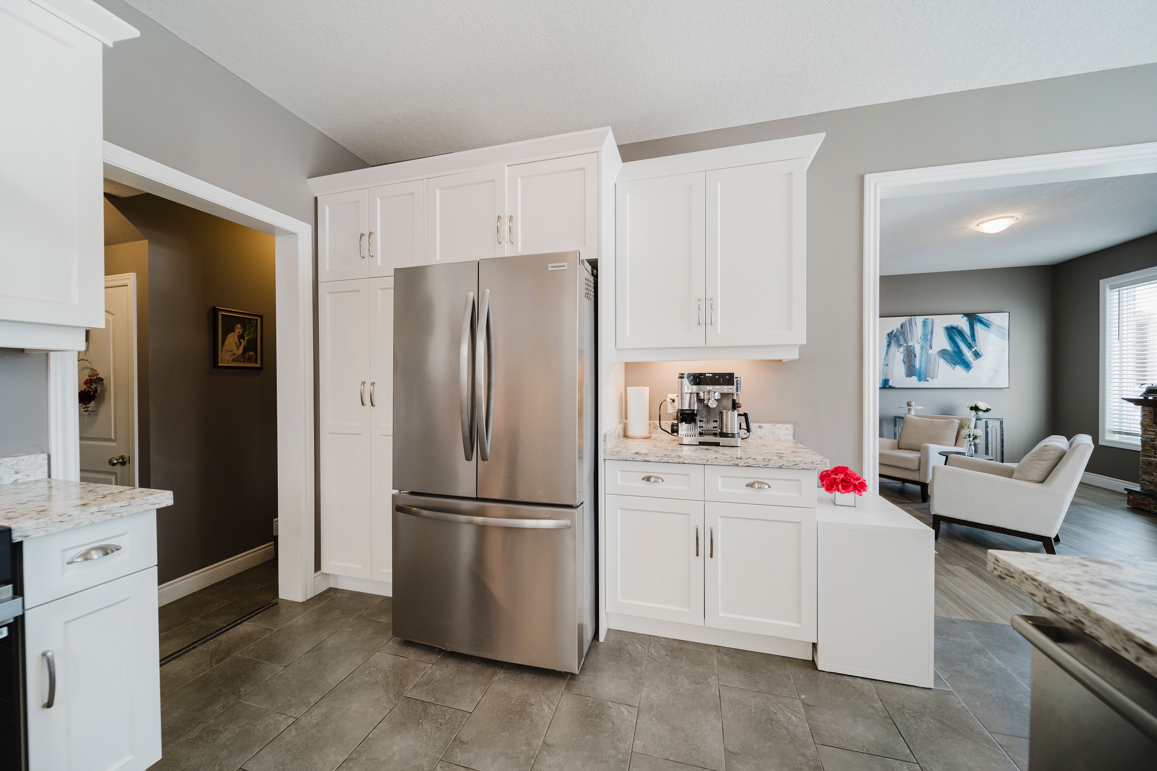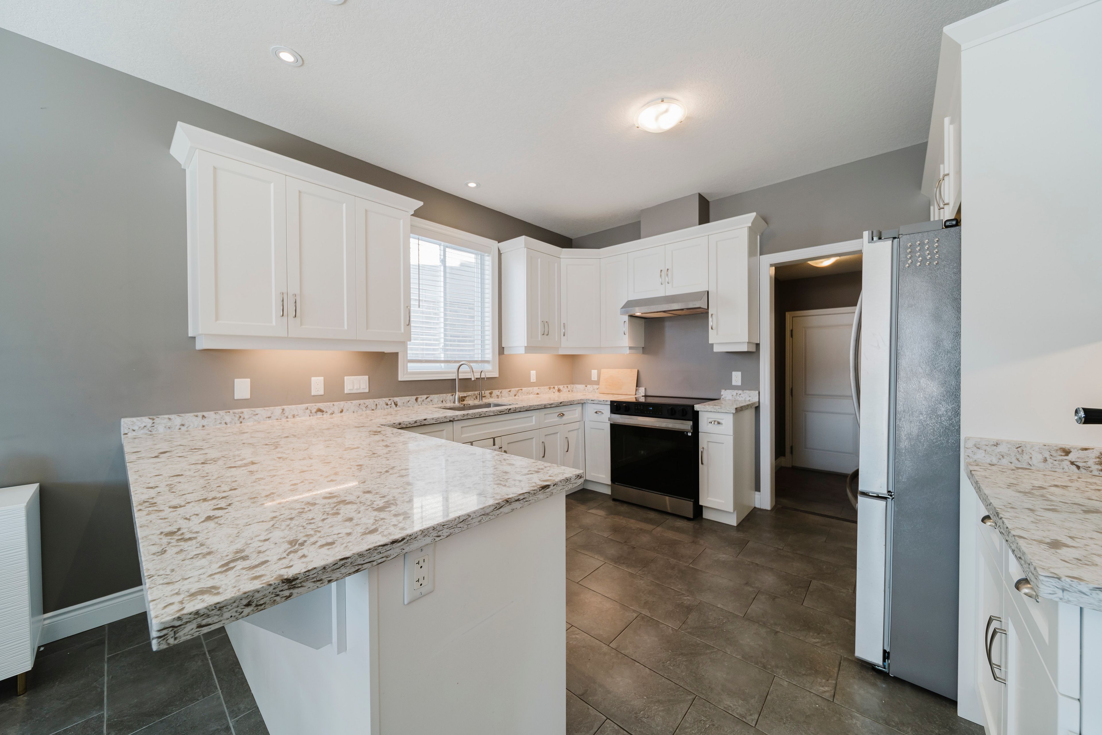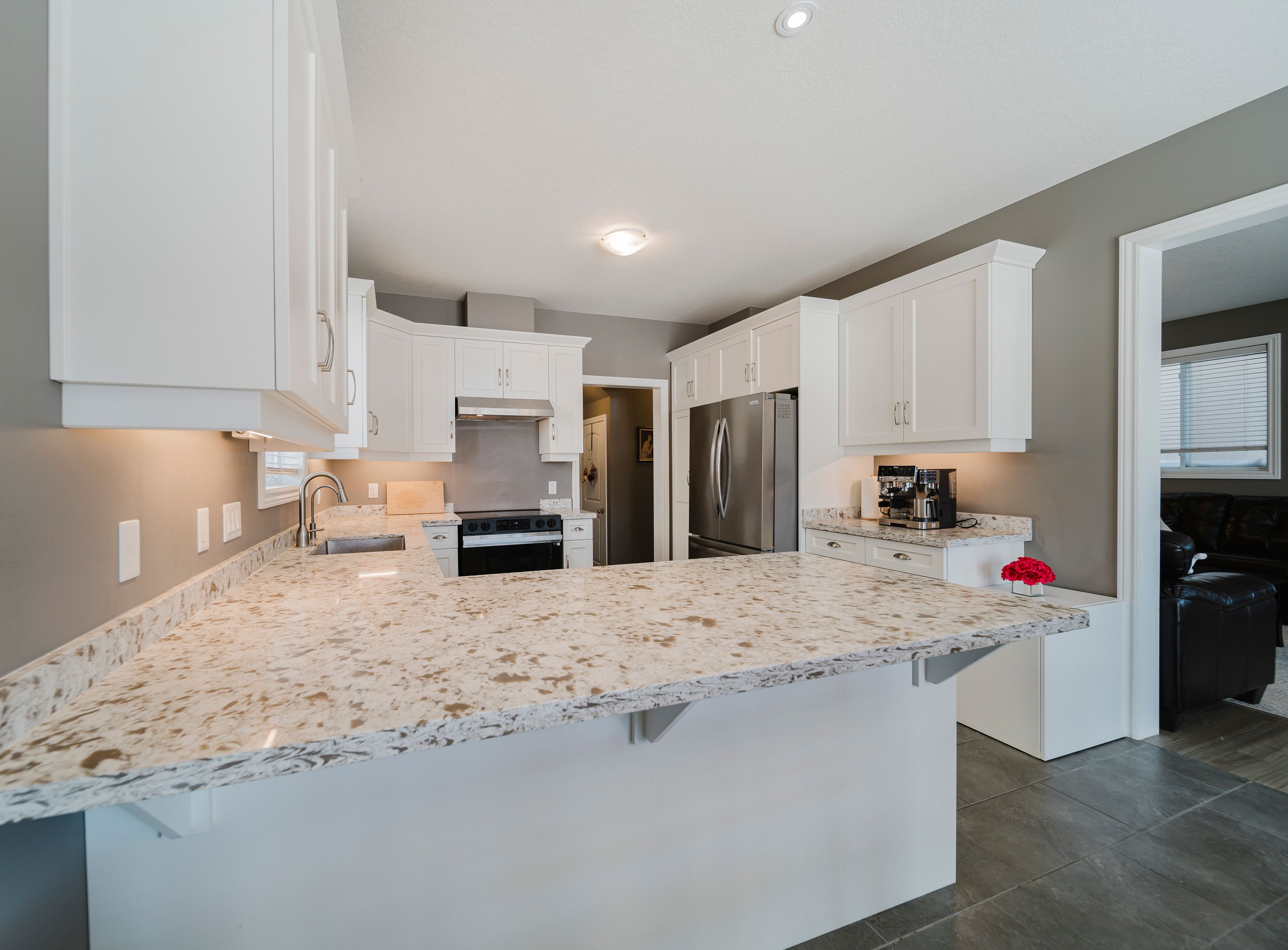 • Chef's kitchen with new quartz countertops and ample counter space.