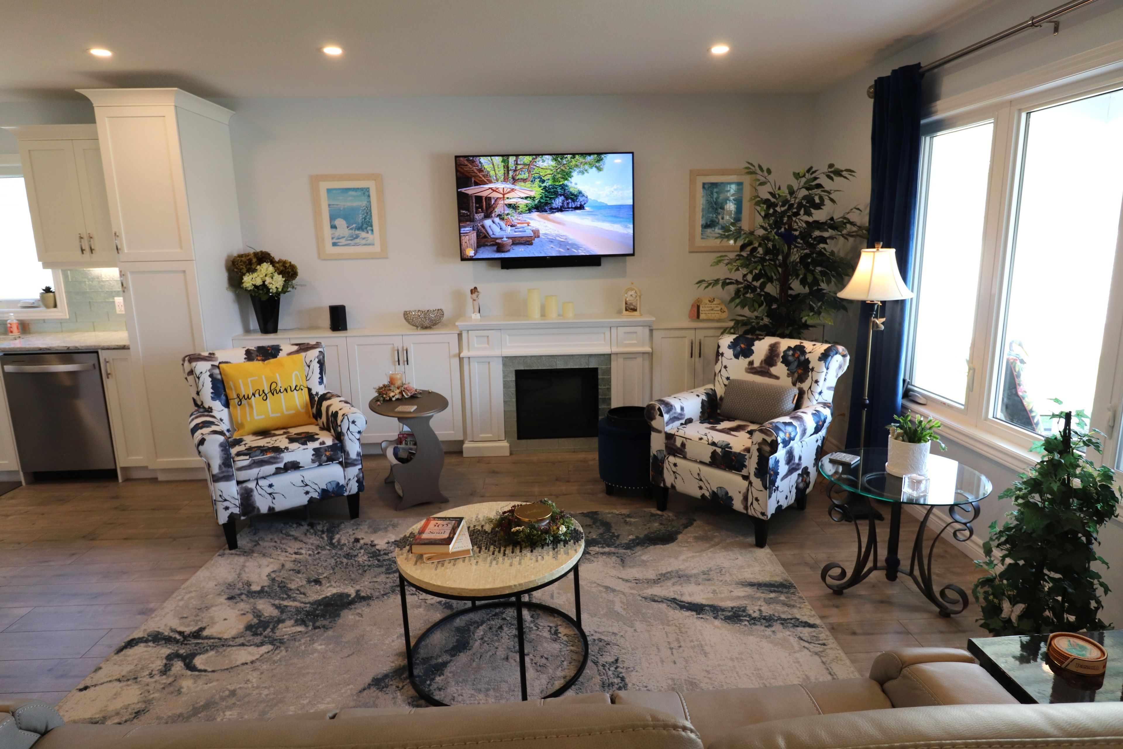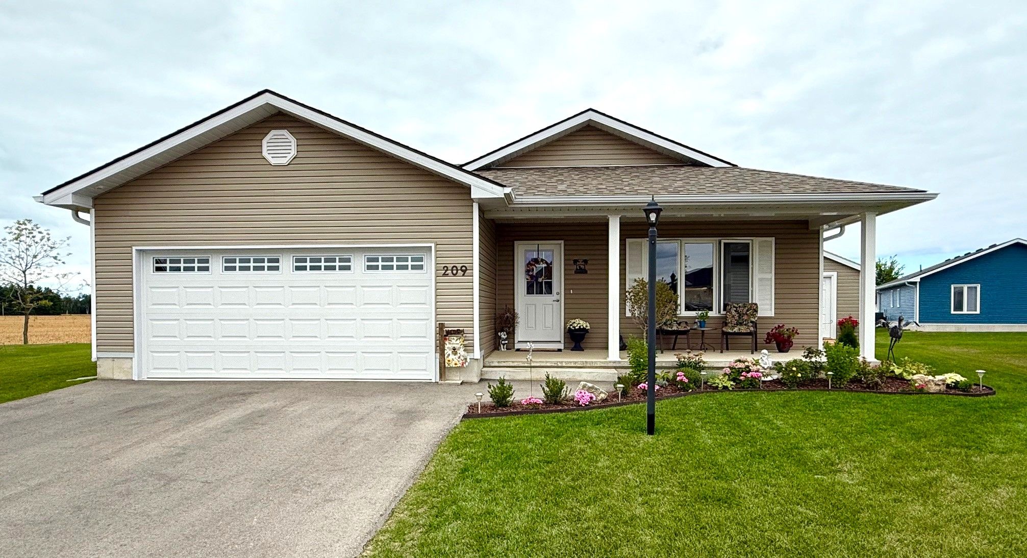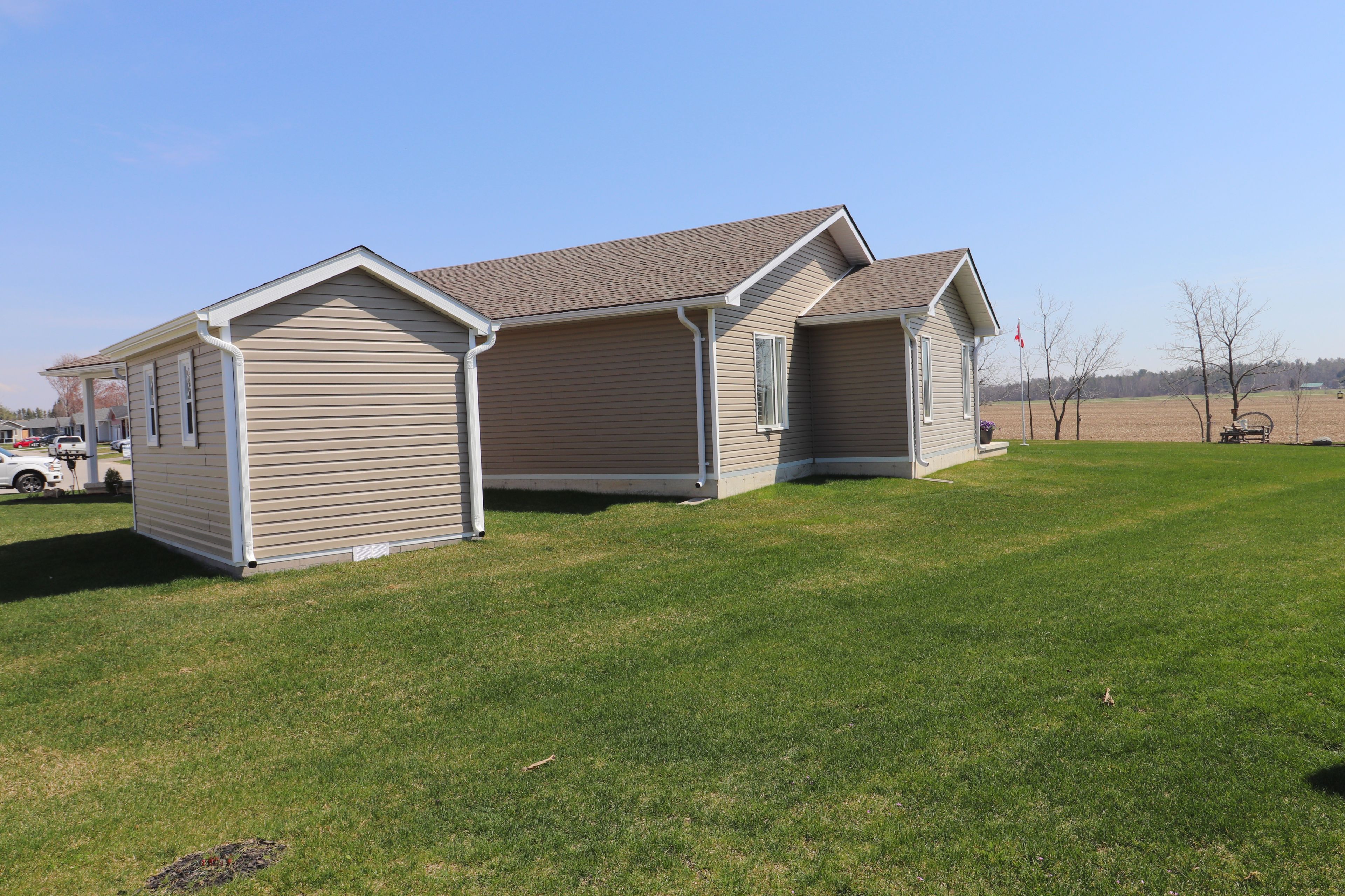 Absolutely stunning! This beautiful home offers nearly 1600 sq ft of living space and is situated on one of the largest and most private premium lots at the bluffs! Just imagine the lifestyle, living along the shores of lake huron, close to shopping and fantastic golf courses along with your own private community recreation center complete with library, party rooms, sauna and indoor pool! This incredible "cliffside b with sunroom" model has seen an extensive number of upgrades added and is an absolute pleasure to show! Features include a large custom kitchen with crown moulding, center island, pantry, upgraded appliances and quartz countertops. You will love all of the custom "pull out" shelving in the cabinets as well! The living room boasts a fireplace surrounded by wall-to-wall custom cabinetry. Also located close to the kitchen is a spacious dining room, perfect for dinner parties! The sunroom sports a cathedral ceiling and patio doors leading to a concrete patio overlooking the extensive gardens and offering a panoramic view of the countryside! Other features include a large primary bedroom with walk-in closet, 3 pc ensuite bath including a shower light and vanity with quartz countertop. Just down the hall is a spacious second bedroom and 4 pc main bath with shower/bath light, linen closet and vanity with quartz counter top. Premium window coverings and upgraded light fixtures are also prevalent throughout. Services include radiant in-floor radiant heating along with a gas furnace offering forced air heating and a/c. There's also an attached two car garage with custom shelving and separate storage shed on the property. This home is truly the ultimate in quality construction and location!