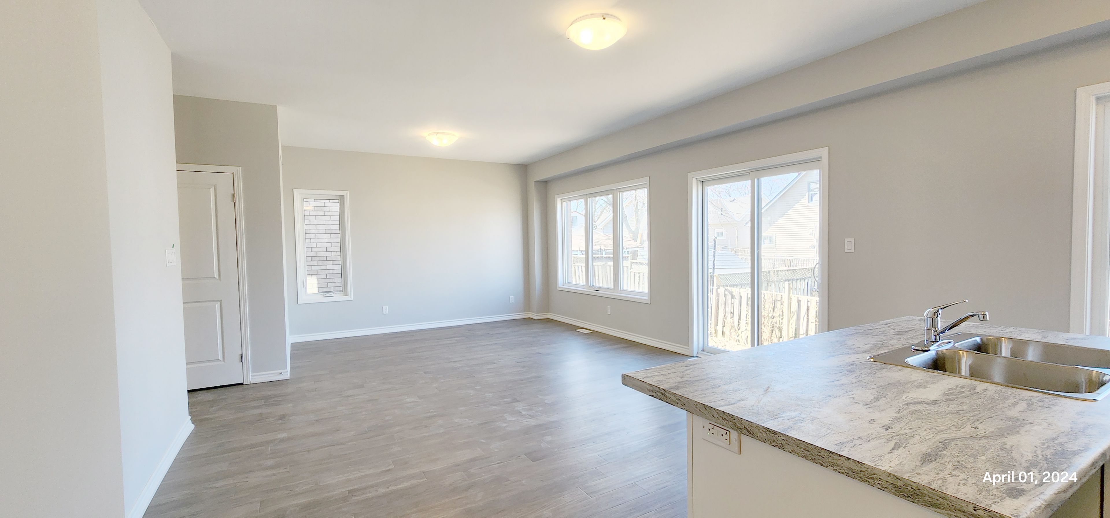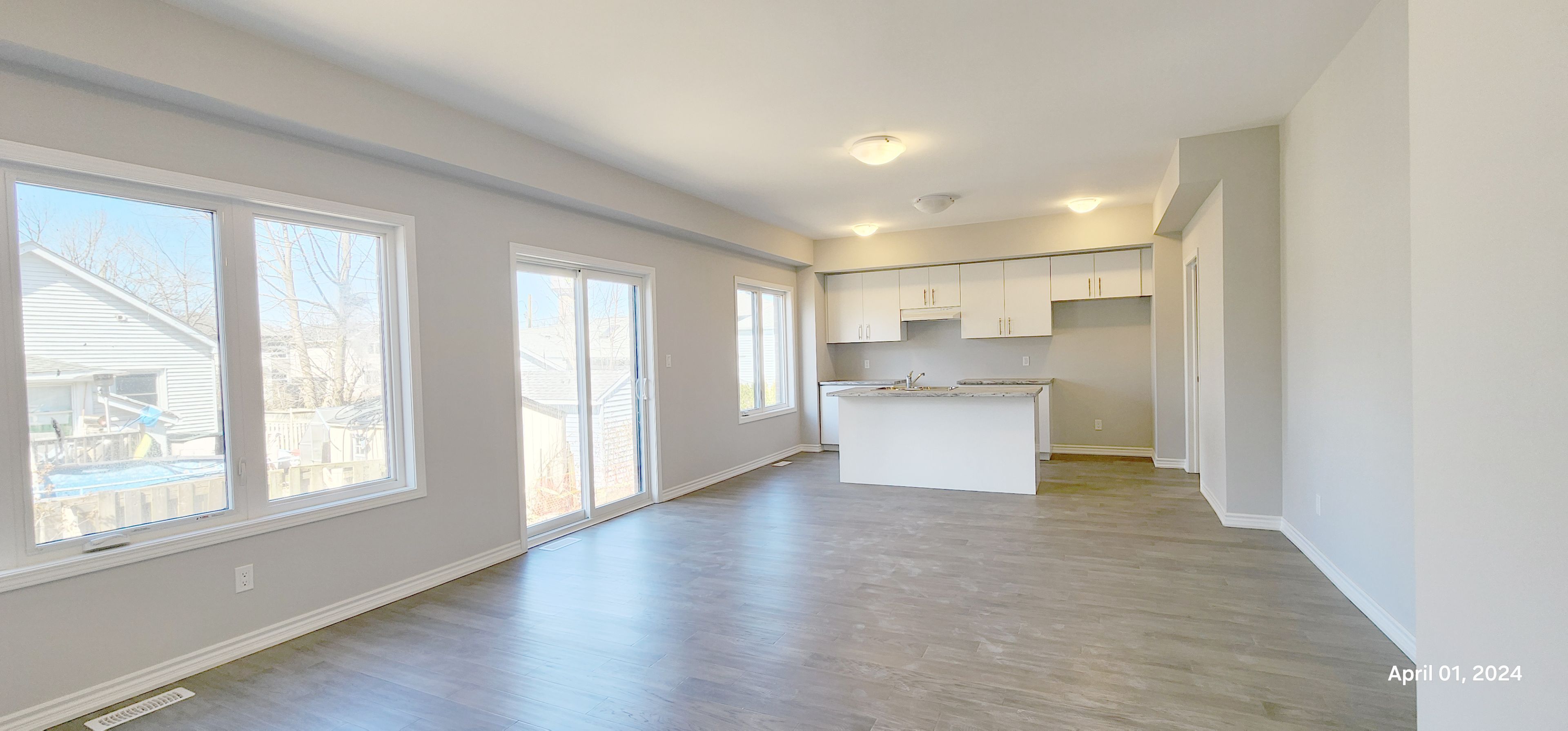 • Open-concept main floor connects living, dining, and kitchen areas.