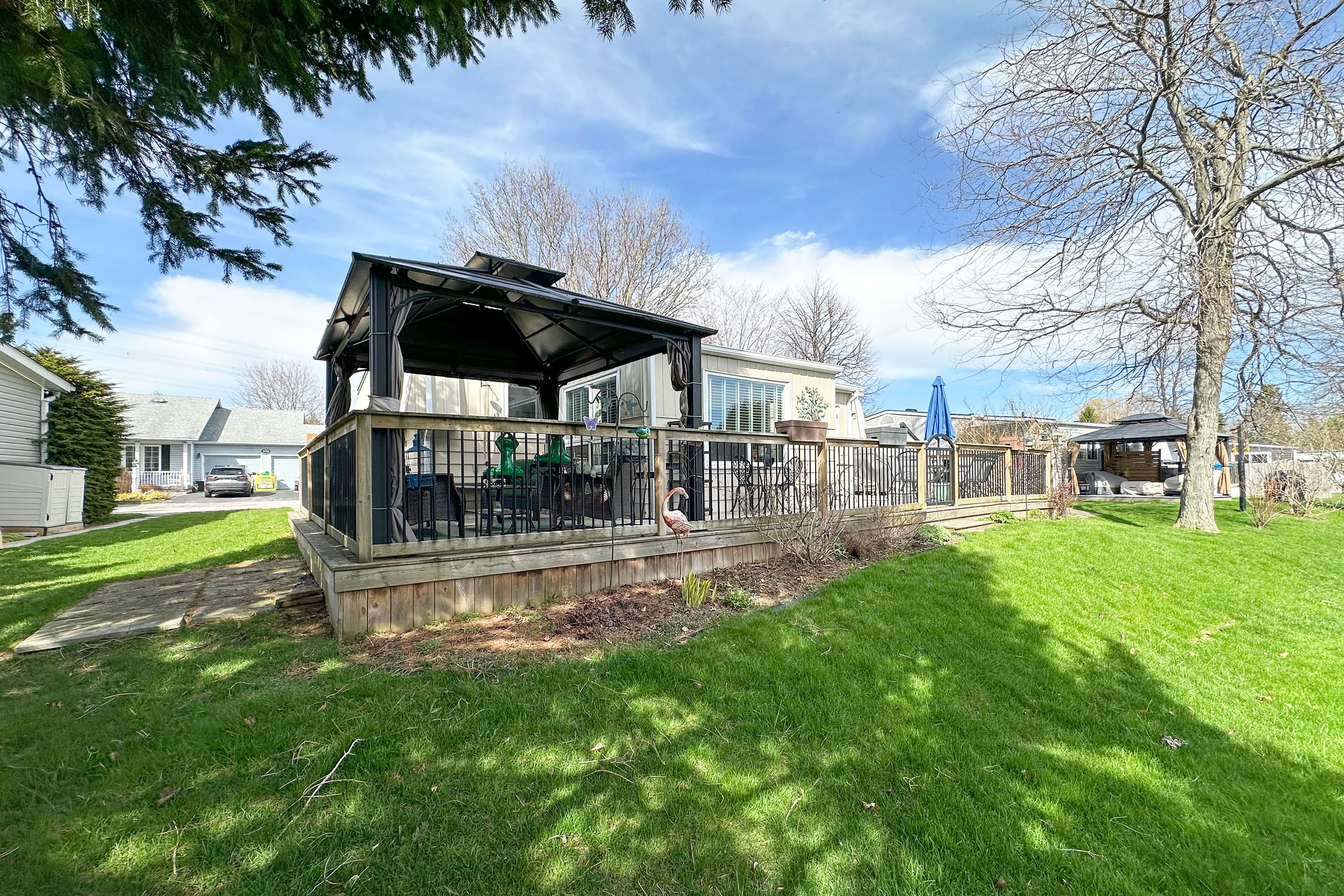 Welcome to 209 wilmot trail- a charming bungalow nestled in the highly sought-after adult lifestyle community of wilmot creek, just steps from the shores of lake ontario. This beautifully maintained 2-bdrm, 1-bath home is warm and inviting and ready for you to move right in. The home firsts greets you with an interlock patio and walkway. Once through the front doors, you'll notice the california knock down ceiling treatments, pot lights and crown molding. Laminate throughout means carpet free. Kitchen complete with stainless steel appliances, ceramic backsplash, pot lights, and side door access to the deck. A bonus family room allows for extra space and provides a walkout to a lovely spacious deck complete with a curtained gazebo. The perfect place to cozy up with your morning coffee, or evening glass of wine. Perennial gardens complete the back yard. Extras include large ceramic walk in shower, shed and 2 storage bins, golf cart pad, hard line for a gas bbq. Home in on leased land - monthly maintenance fee includes the use of the clubhouse and all facilities including 9 hole golf course, 2 salt water heated pools, gym, sauna, hot tub, billiard tables, pickleball /tennis courts, waterfront walking trails, and much more. Embrace the lifestyle, what are you waiting for?