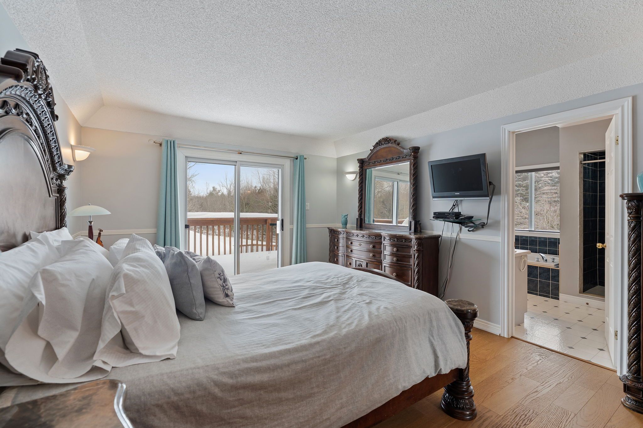 • Bright primary bedroom with ensuite and treetop views.