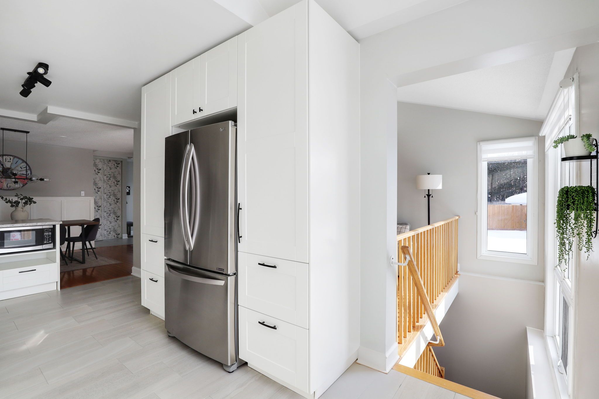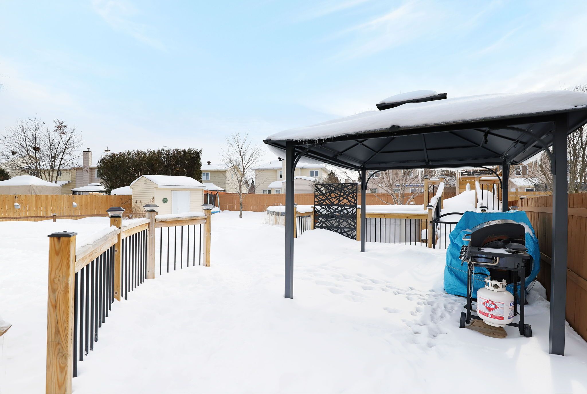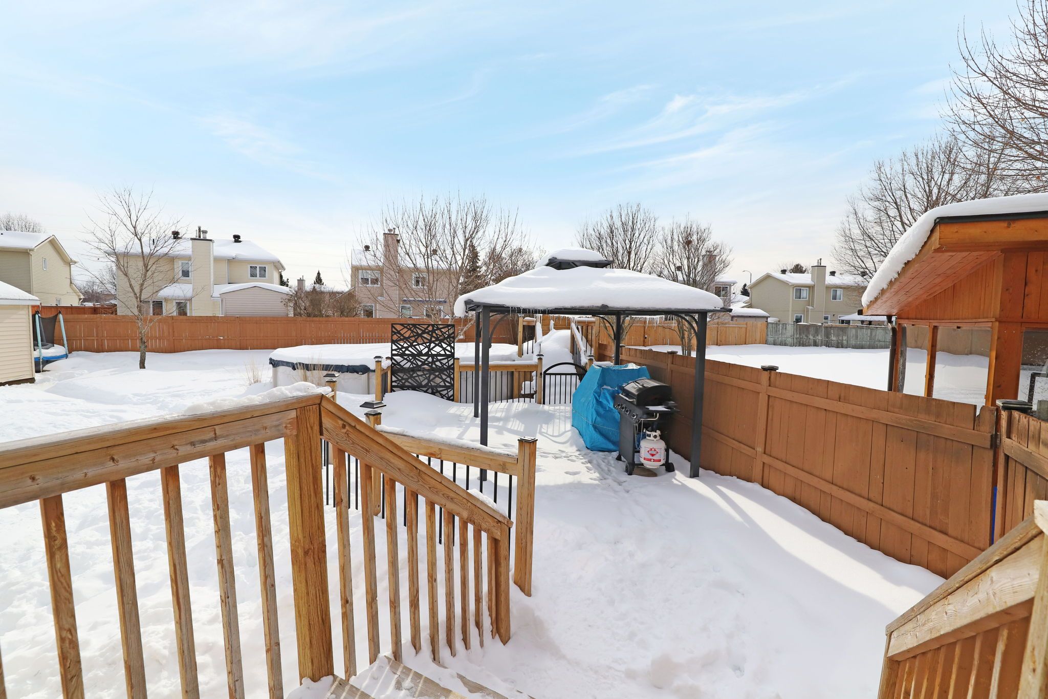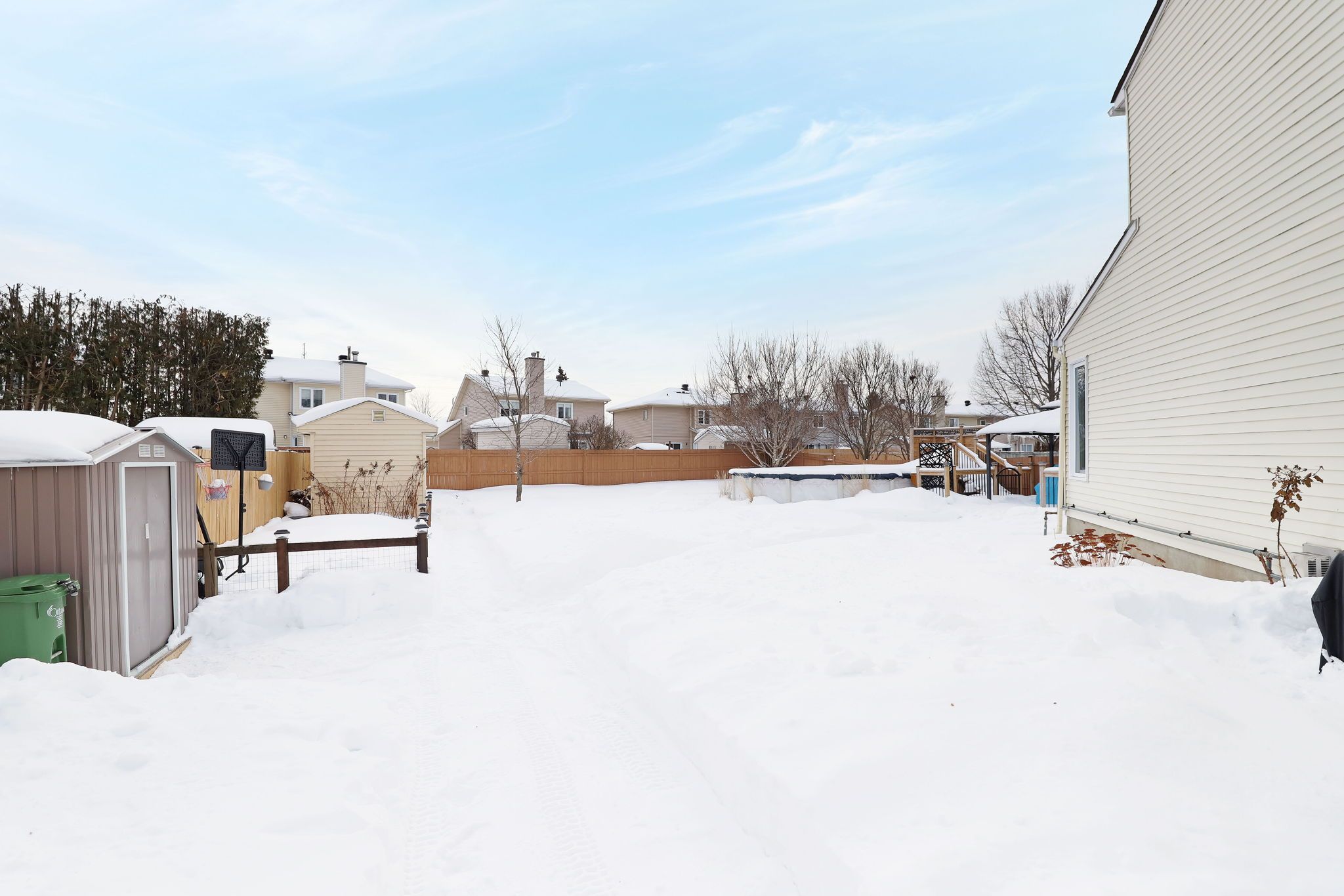 Beautifully maintained move-in ready, coscan crimson maple model is nestled in a highly sought-after fallingbrook community. This spacious 3+1 bedroom, 2. 5 bath end-unit townhome offers a perfect blend of style, comfort & functionality for today's modern family with approx. $60,000 in quality upgrades over the years. Step into a welcoming foyer with new ceramic flooring, which continues into the kitchen'19 & powder room, creating a fresh & cohesive look. The bright open-concept main floor is filled with natural light from oversized palladium windows highlighting the cathedral ceiling in the living room. Hardwood floors flow through the living & dining areas adding timeless elegance. The large galley kitchen is designed for everyday living, boasting abundant cupboard space, stylish ceramic backsplash, updated finishes, sunny dinette with vaulted ceilings. Patio doors lead to a multi-level deck, making indoor-outdoor living seamless & convenient for hosting family & friends. Upstairs, the spacious primary bedroom offers a walk-in closet, 4-piece ensuite, 2 generously sized bedrooms with ample closet space & full family bath complete the second level. The fully finished lower level was renovated'21/23 features a bright recroom, n/gas fireplace, a legal 4th bedroom with egress window, with completed permits & properly registered. Sizable laundry, storage & utility area is ideal for extended family or guests. Additional major updates include: furnace'15, roof'10/11(all dates are approx.) garage door, opener, windows, doors & a/c providing peace of mind & long-term value. Outside, enjoy your oversized, landscaped yard complete with heated above-ground pool, large vegetable garden, 2 garden sheds, expansive deck, private retreat for summer relaxation, entertaining plus upgraded front porch. Ideally located within walking distance to parks, schools, minutes to shopping, transit, exceptional value in one of orleans' most established neighborhoods. No offer till 7pm feb 25/26