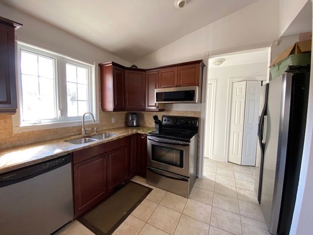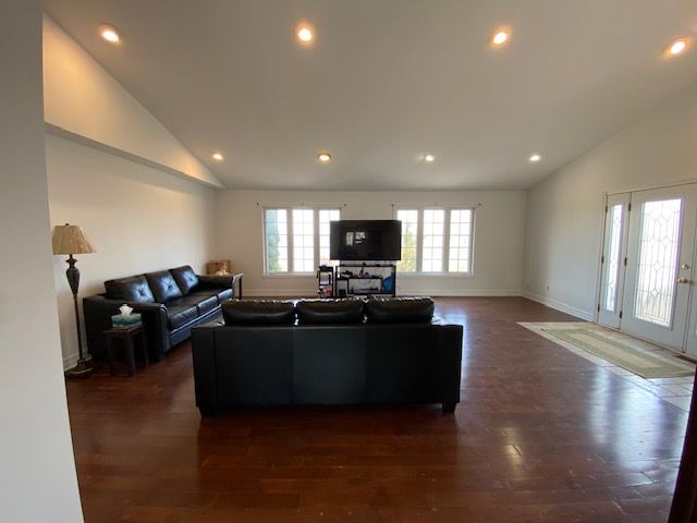 • Open concept living area with a high cathedral ceiling.