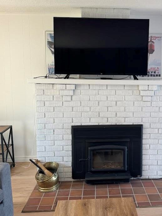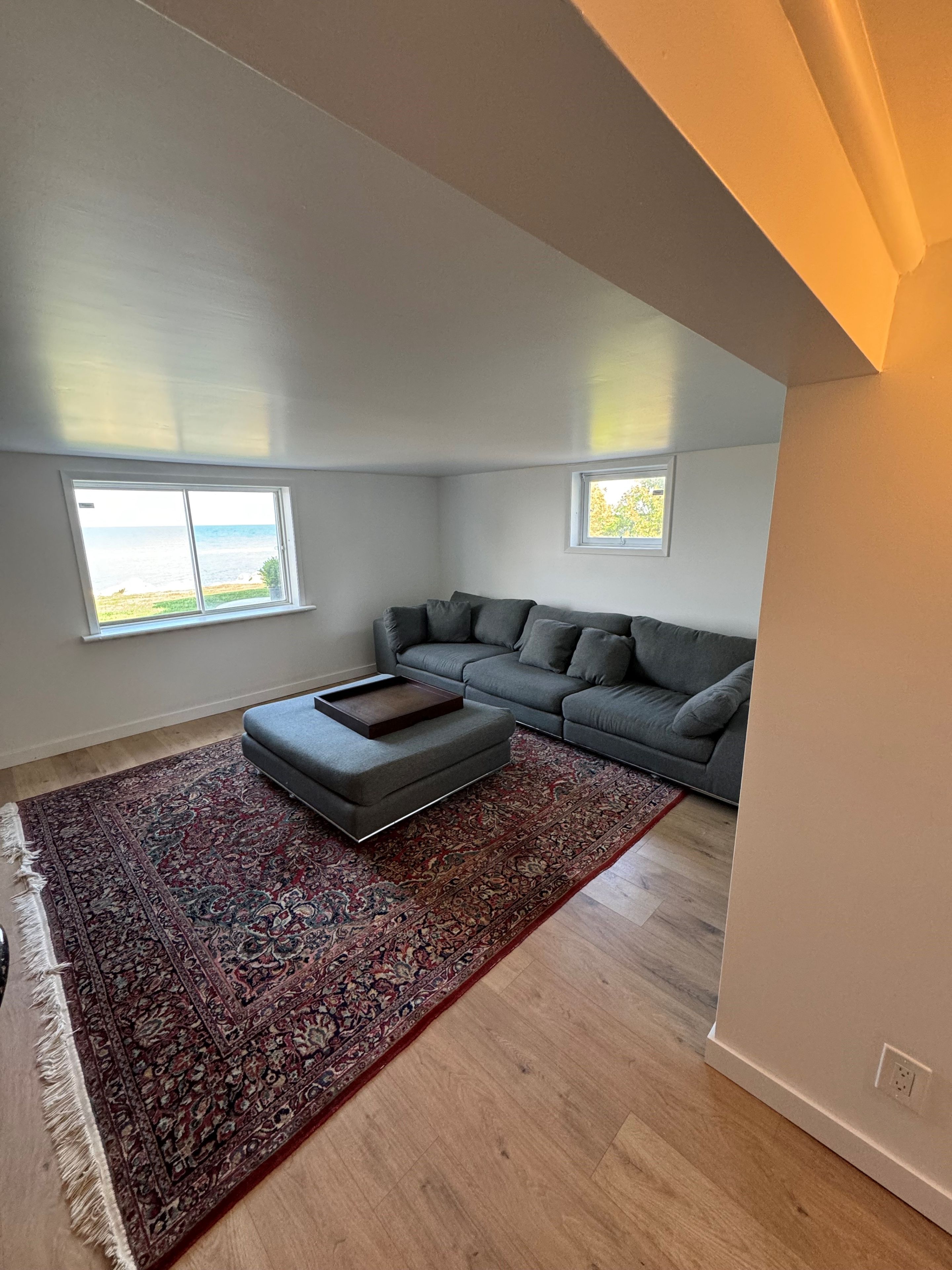 • Spacious living area with wood-burning fireplace and lovely water views.
