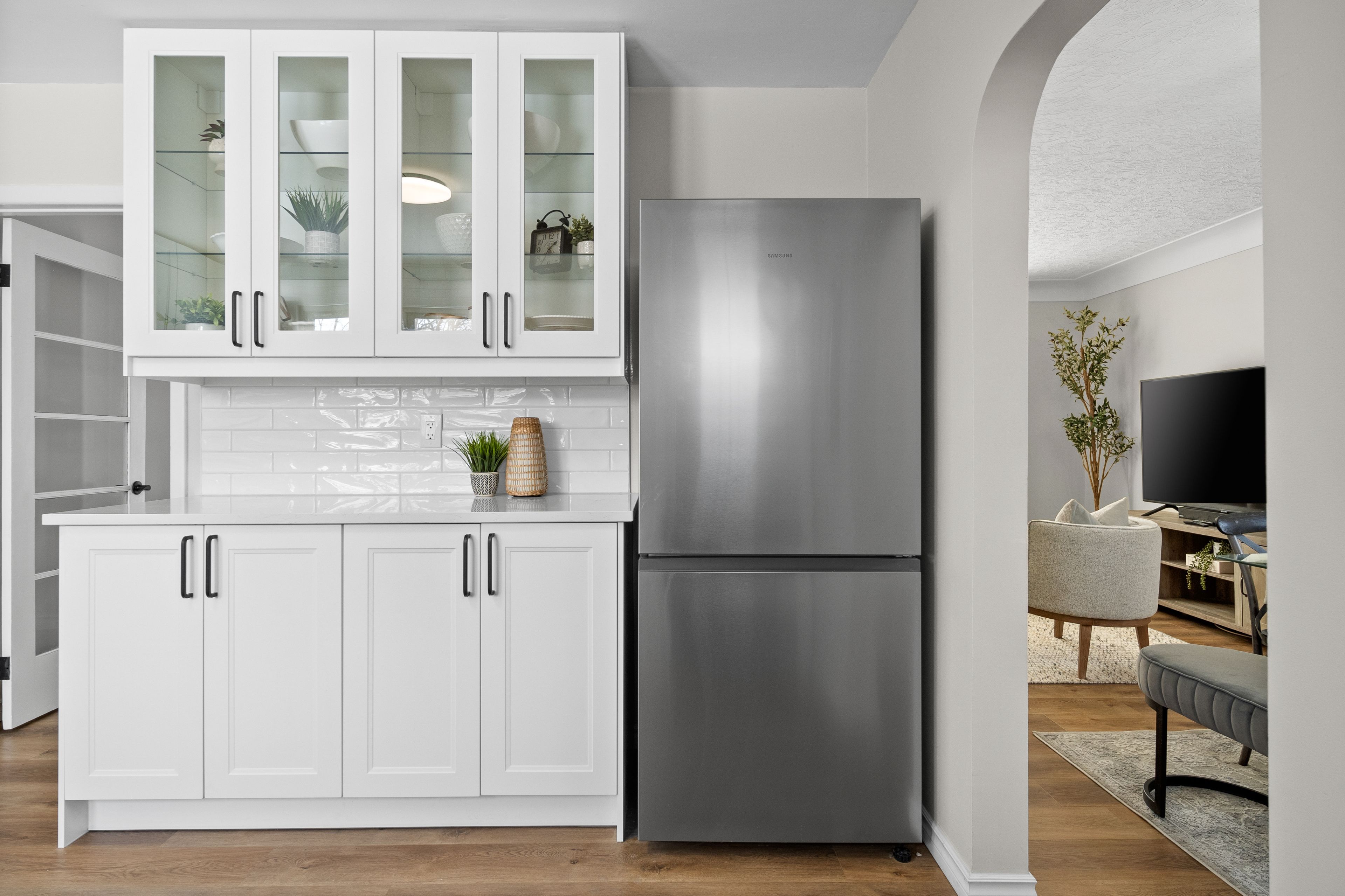 • Modern eat-in kitchen featuring quartz countertops and new appliances.