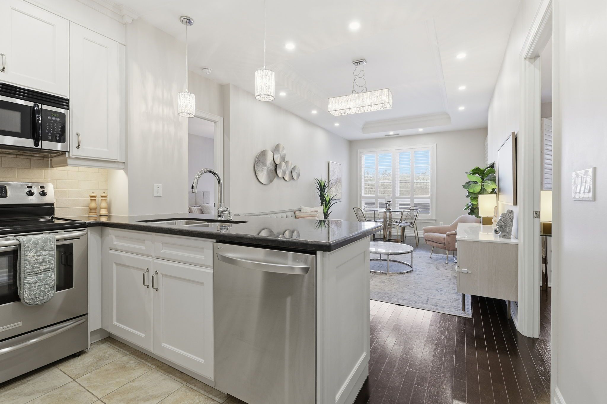 • Open-concept living area with high ceilings and hardwood floors.