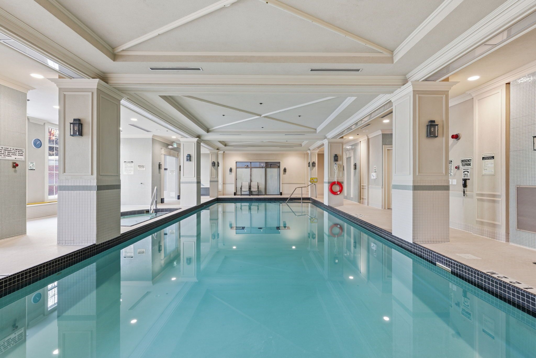 • Amenities include a pool, gym, theatre, and concierge service.